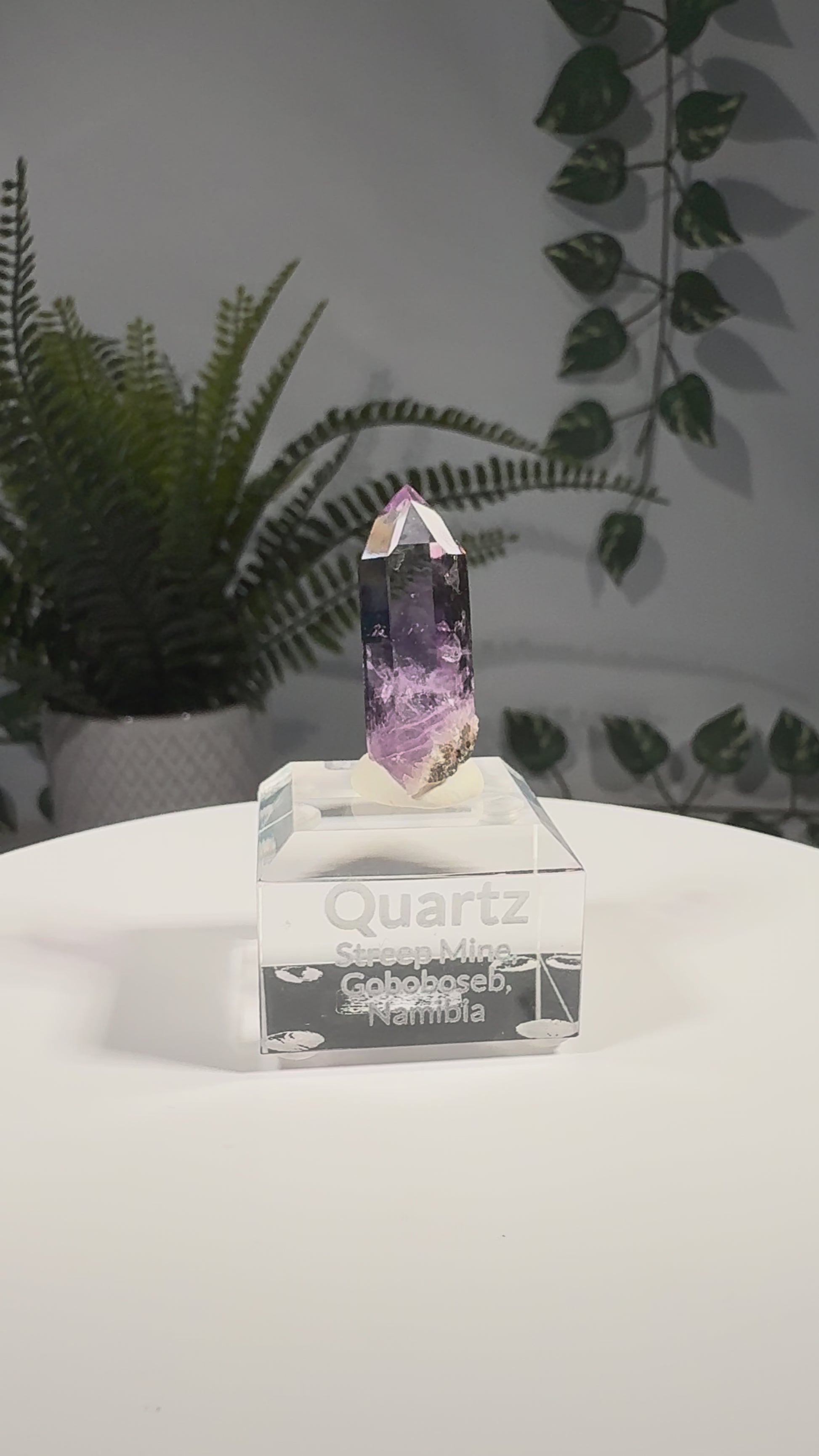 Der Kristall sitzt auf einem Acrylsockel mit Gravur und ist eine sehr schöne Stufe.