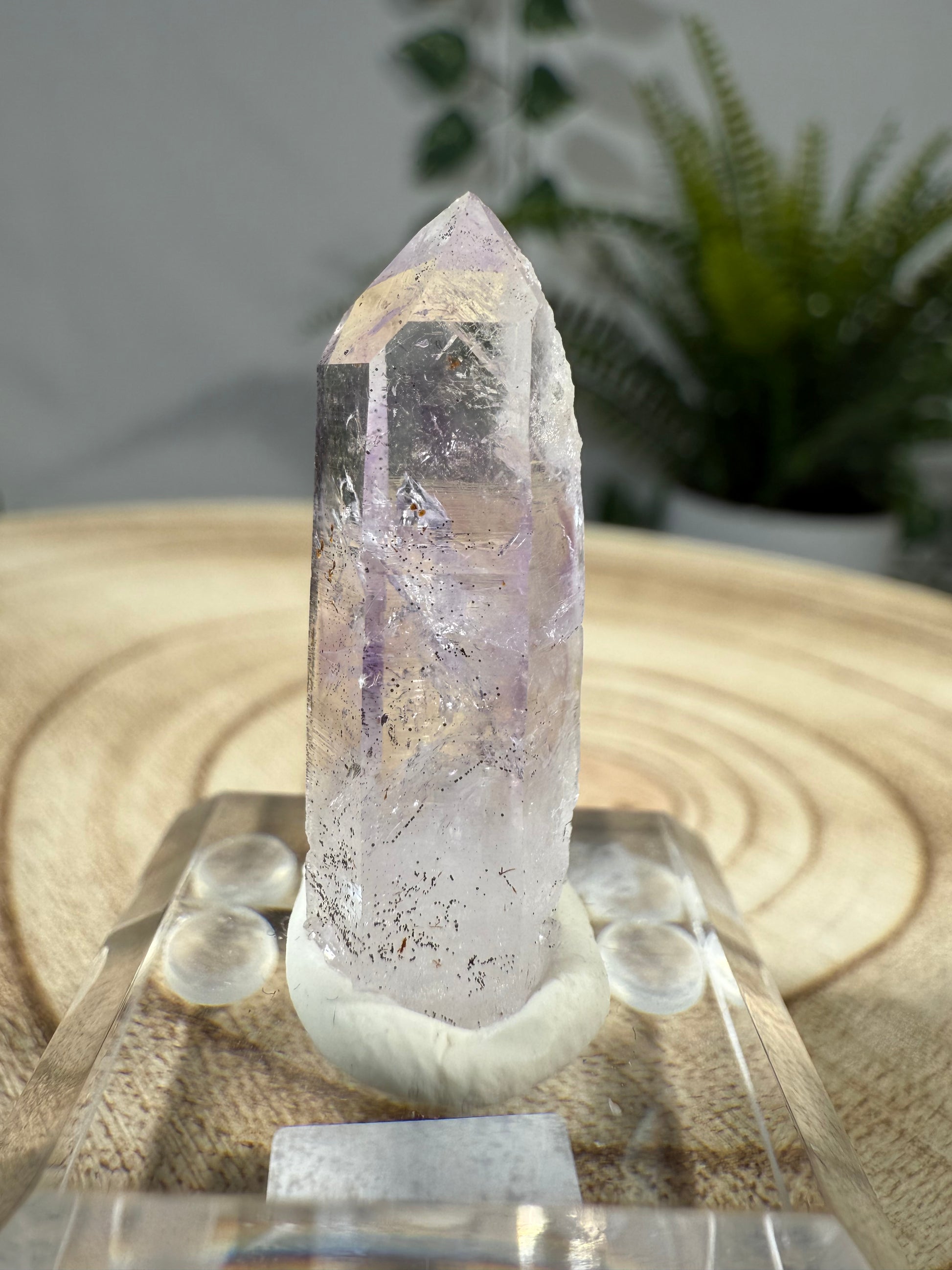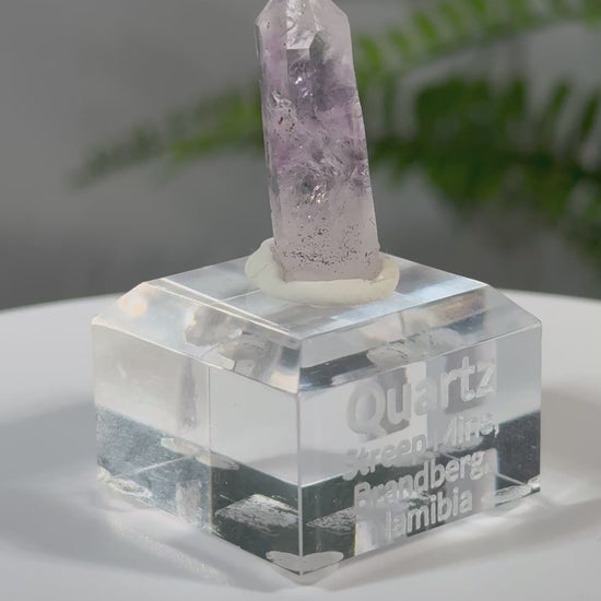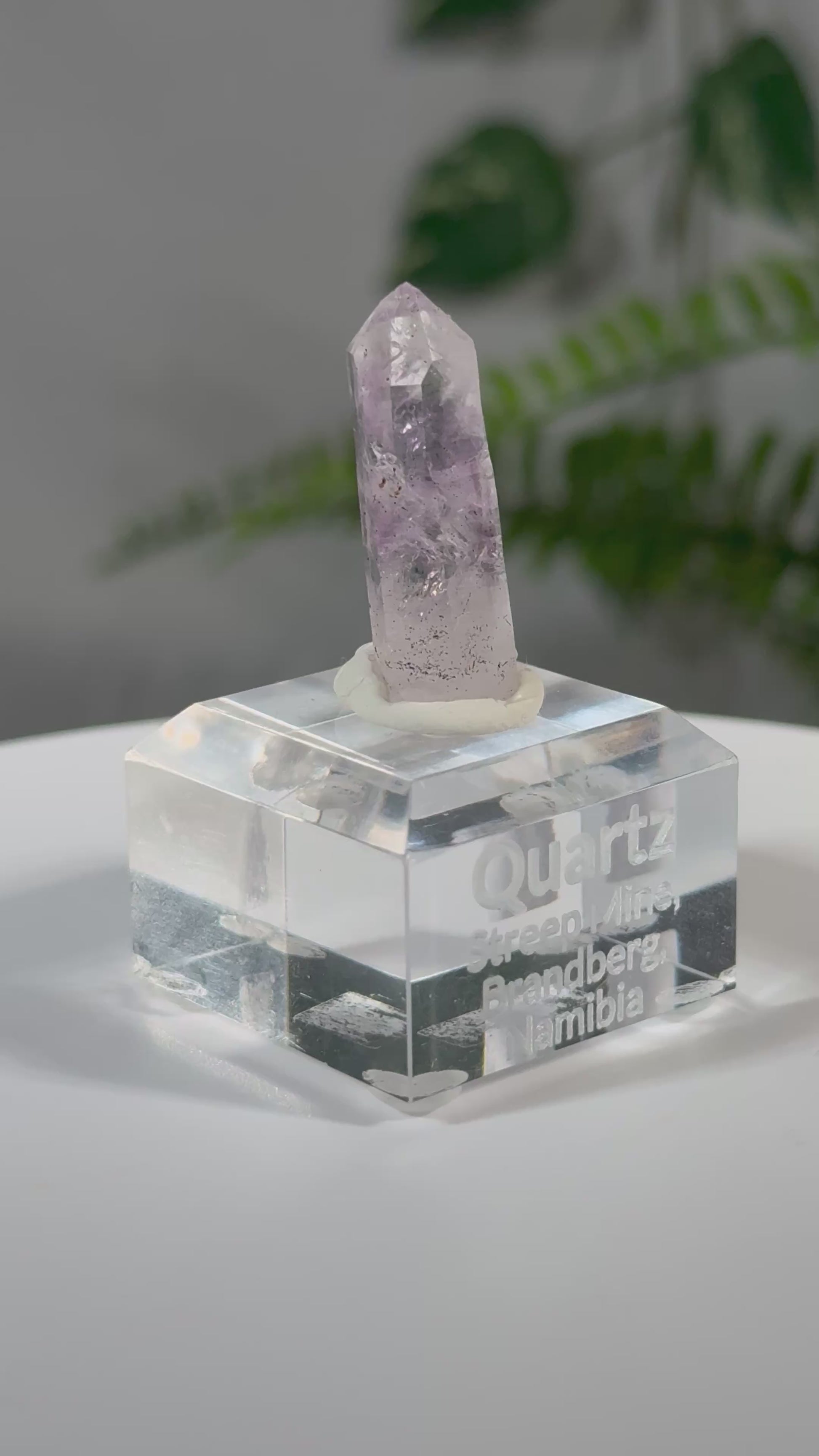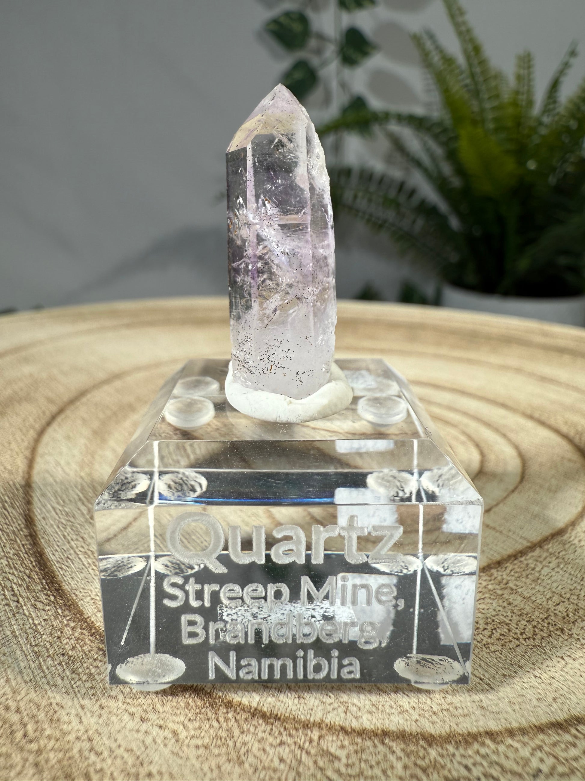 Der Kristall hat eine Libelle (Wasserkammer mit Gasblase) und sitzt auf einem Acrylsockel mit Gravur und ist eine sehr schöne Stufe.