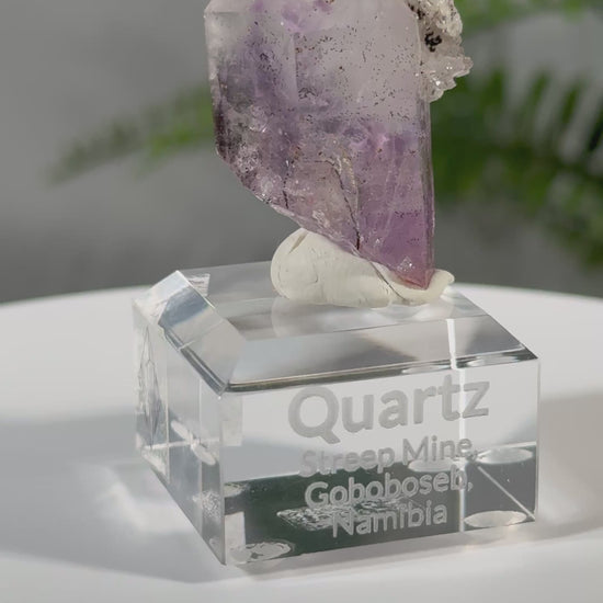 Der Kristall hat zwei Libellen (Wasserkammer mit Gasblase) und sitzt auf einem Acrylsockel mit Gravur und ist eine sehr schöne Stufe.