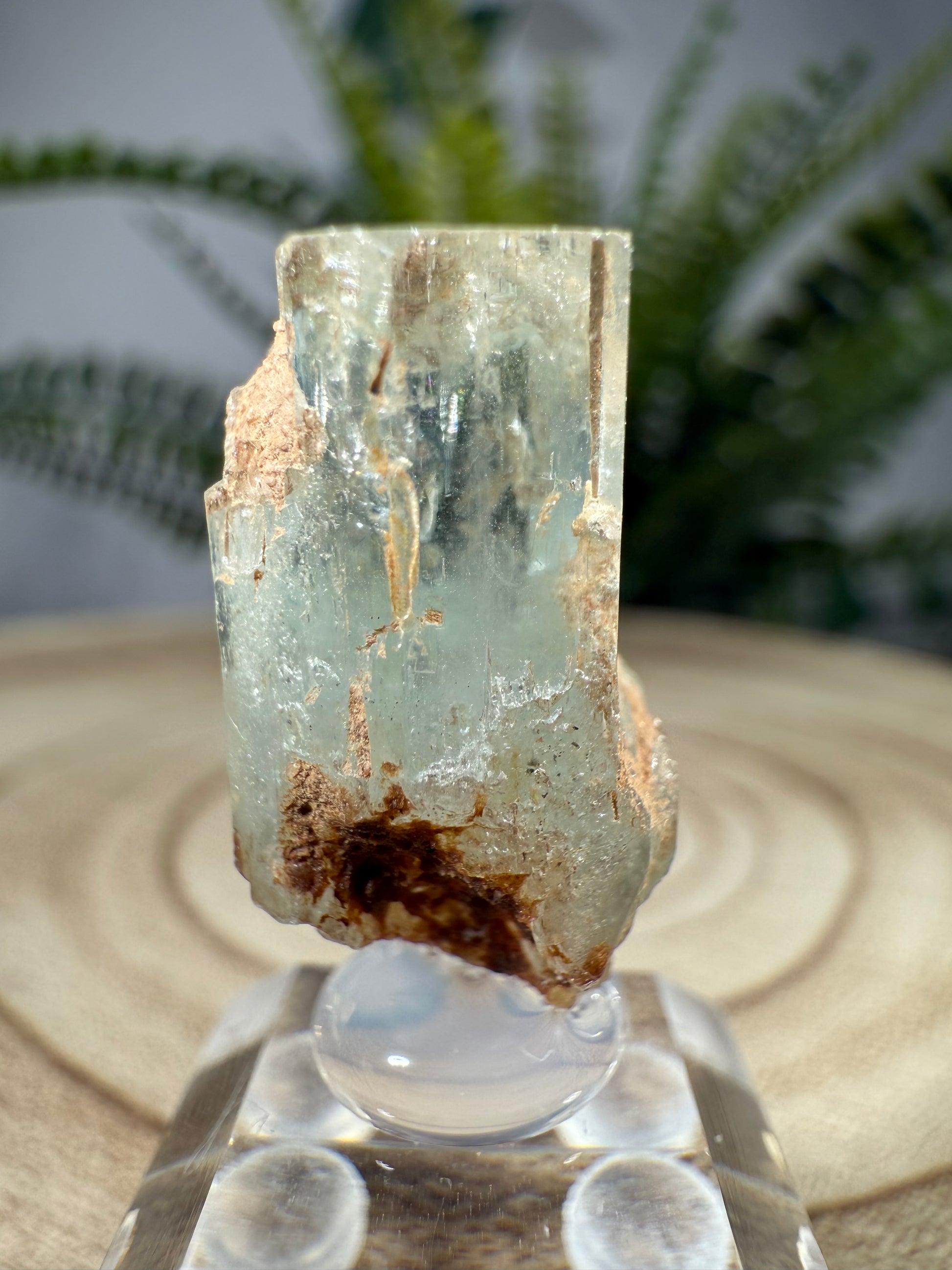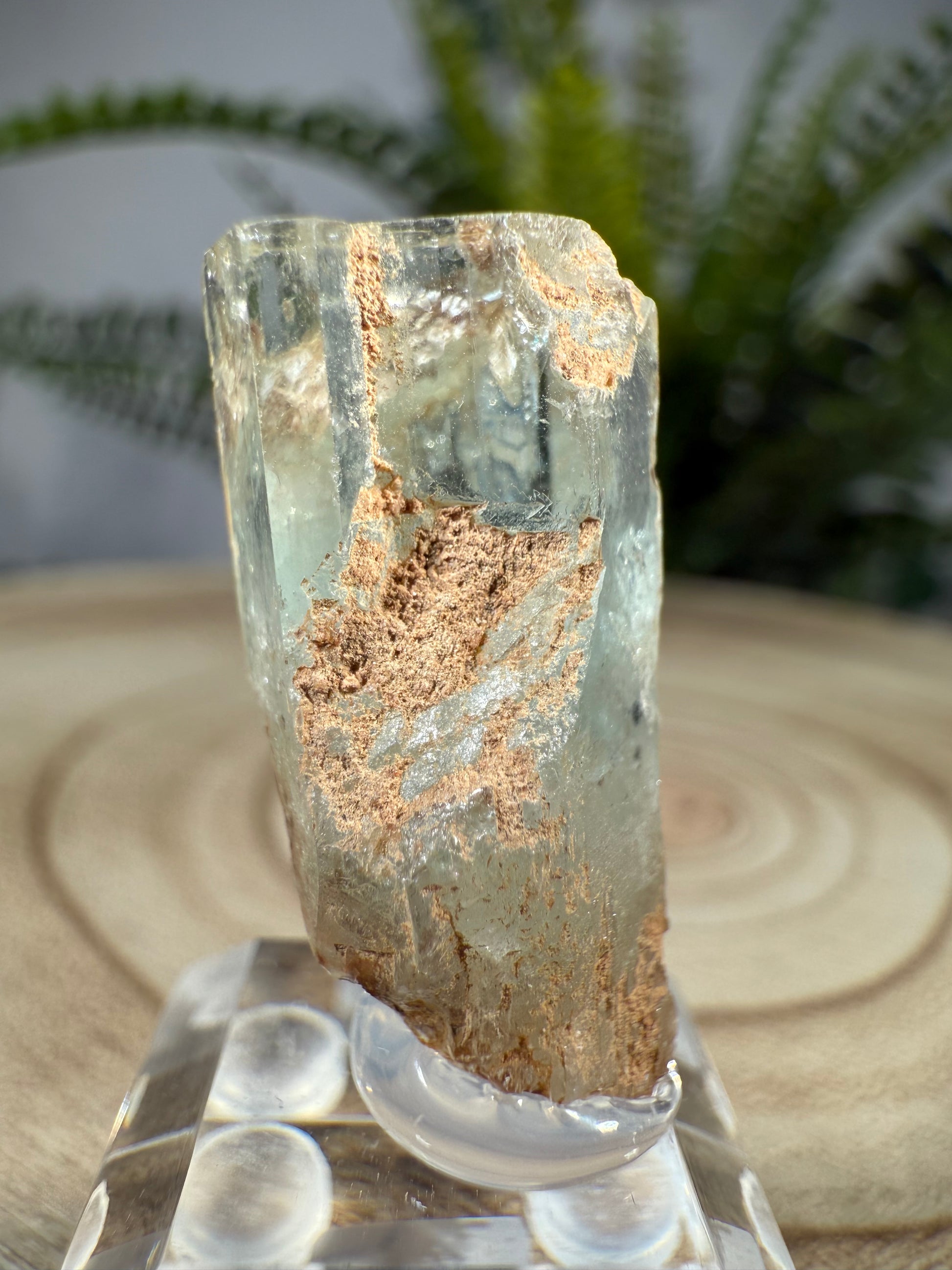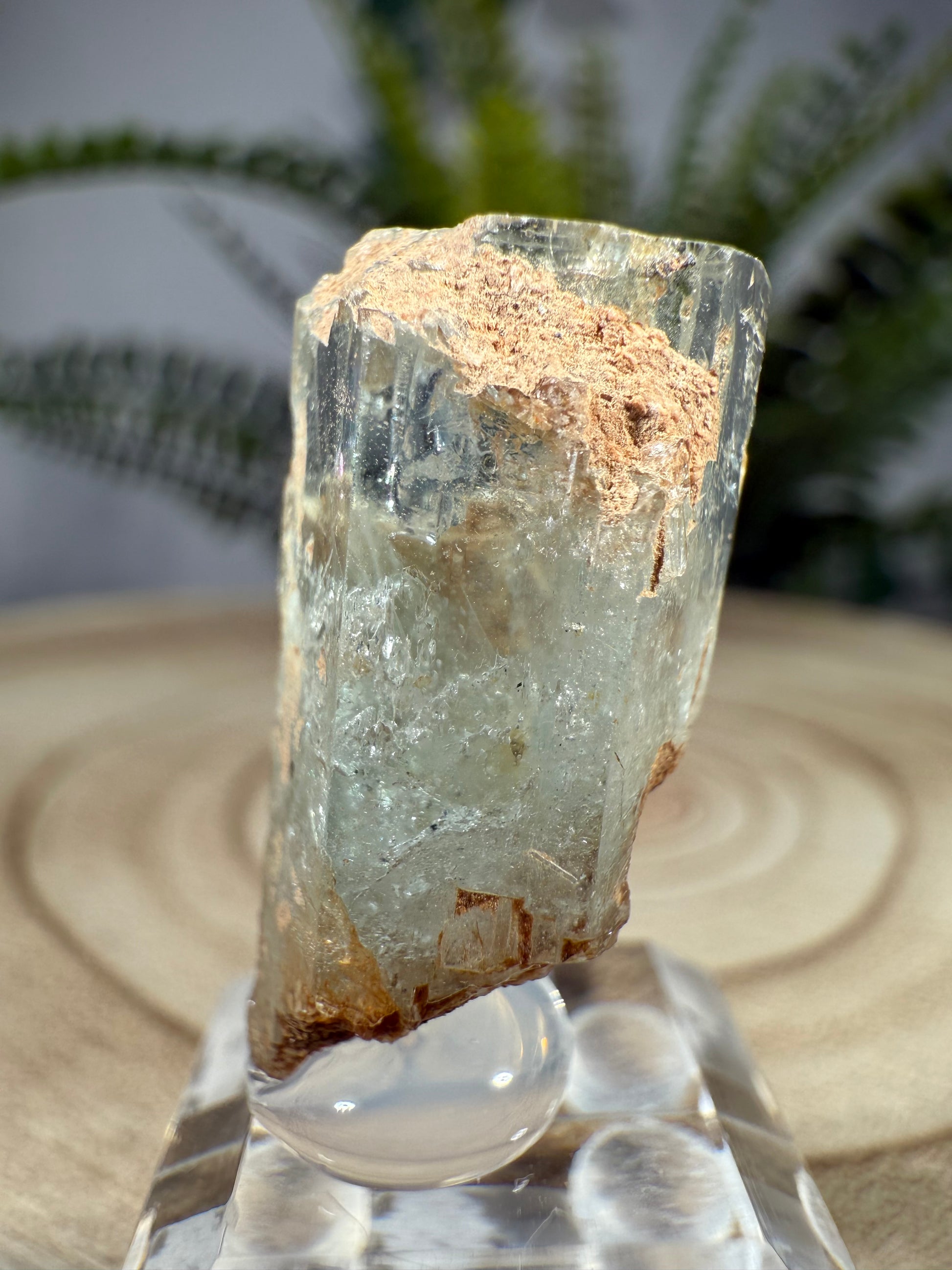 Der Kristall sitzt auf einem Acrylsockel und ist eine sehr schöne Stufe.