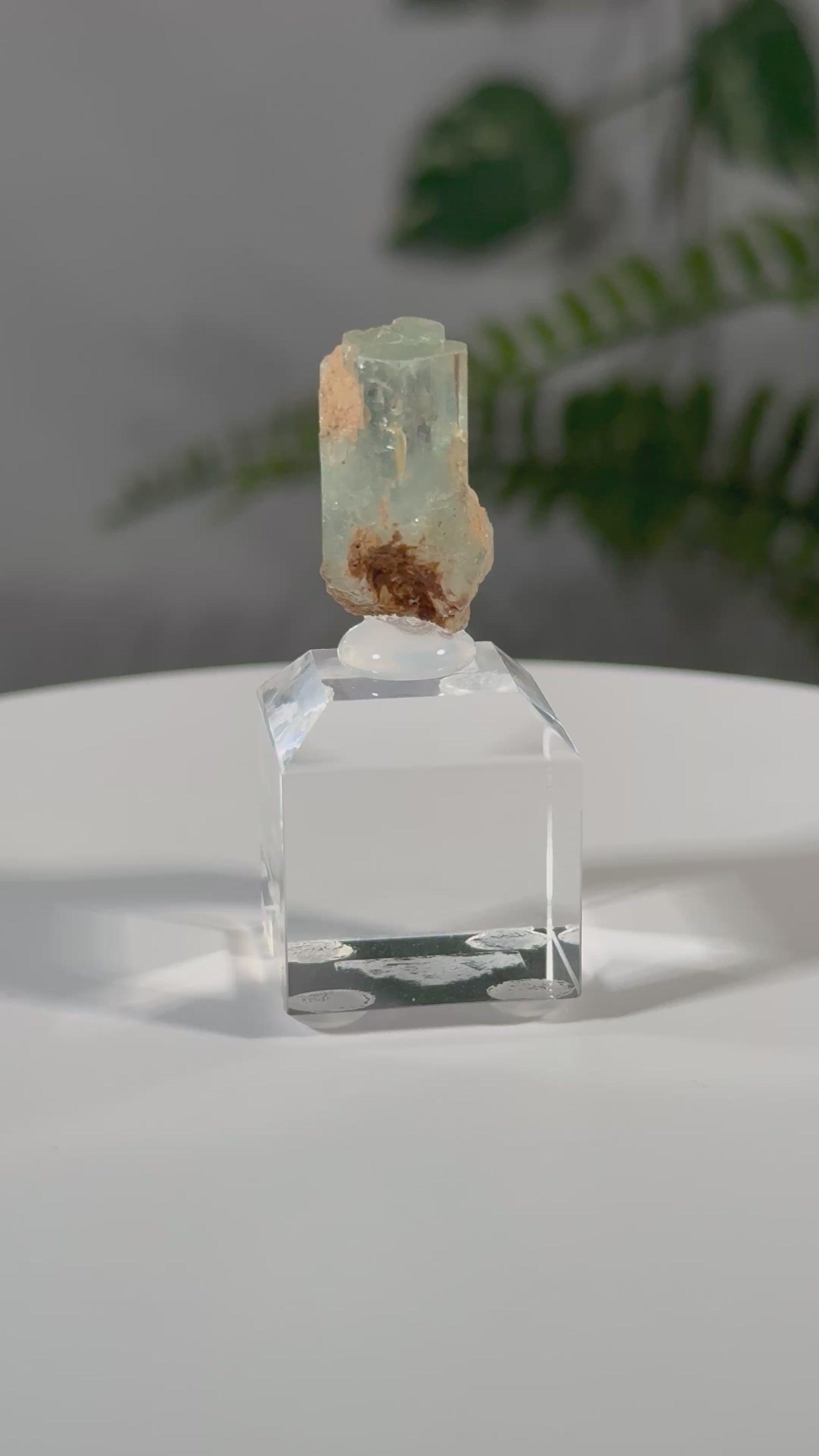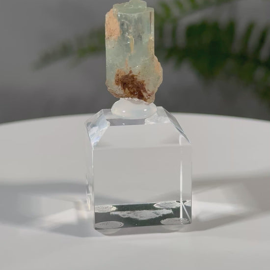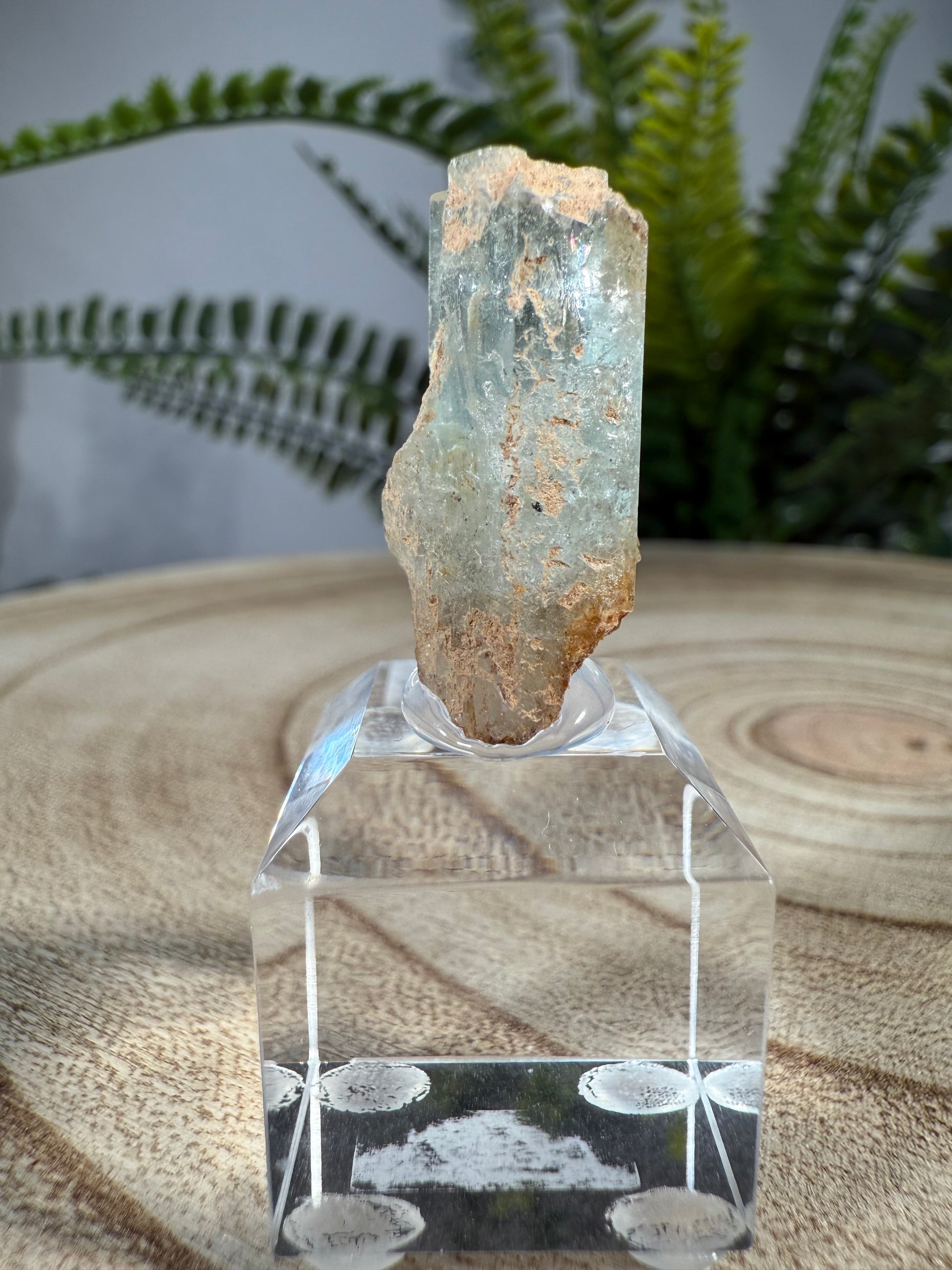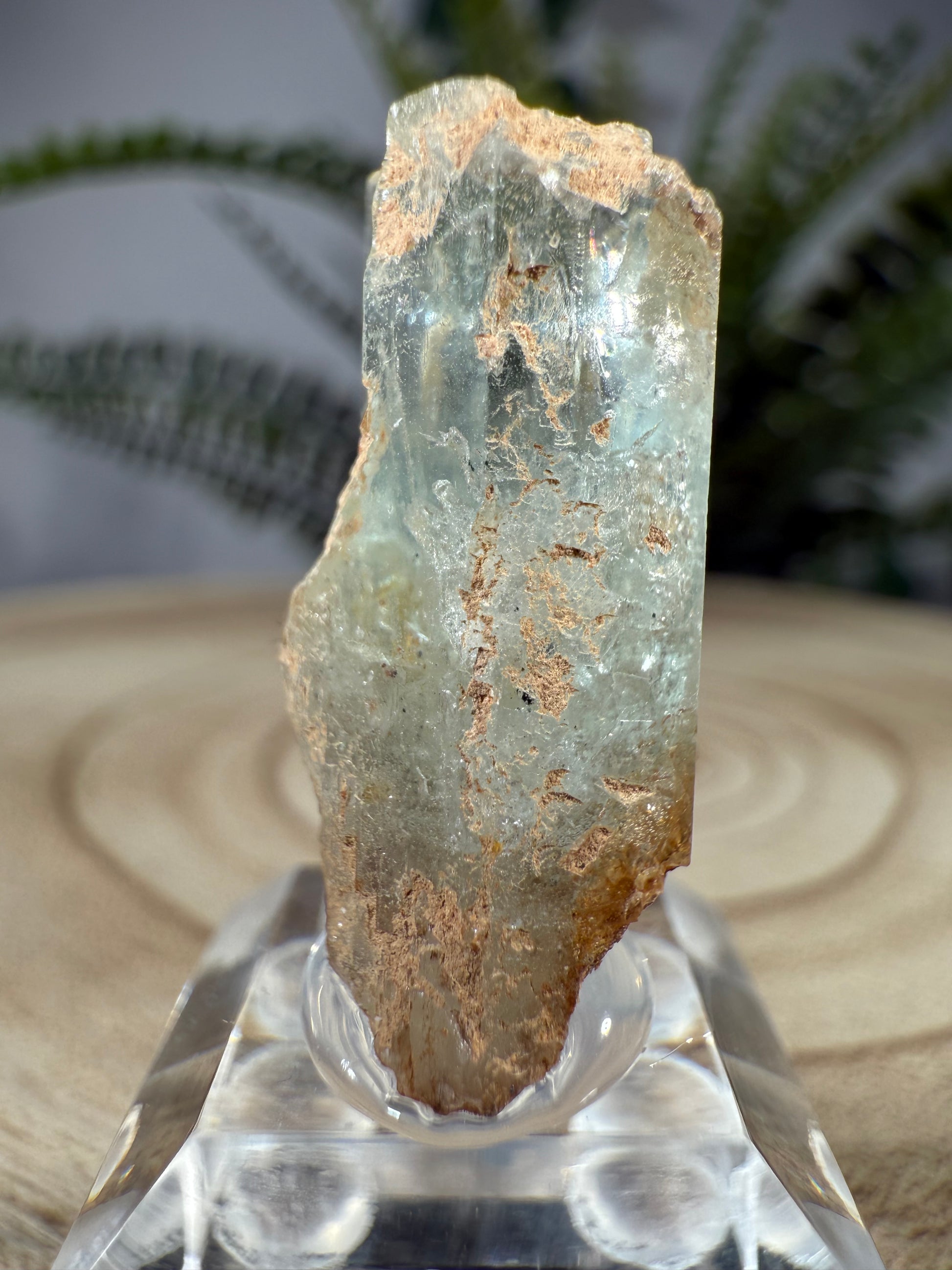 Der Kristall sitzt auf einem Acrylsockel und ist eine sehr schöne Stufe.