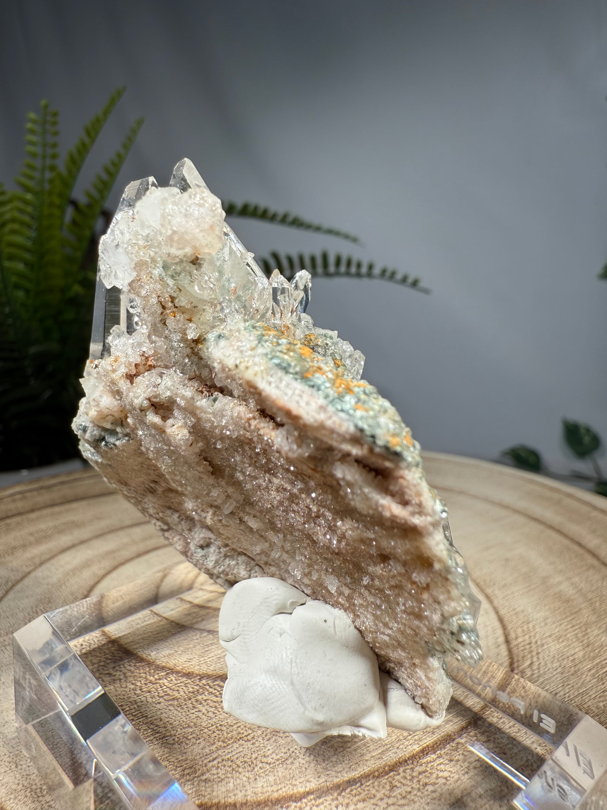 Das Mineral sitzt auf einem Acrylsockel mit Gravur und ist eine sehr schöne Stufe.
