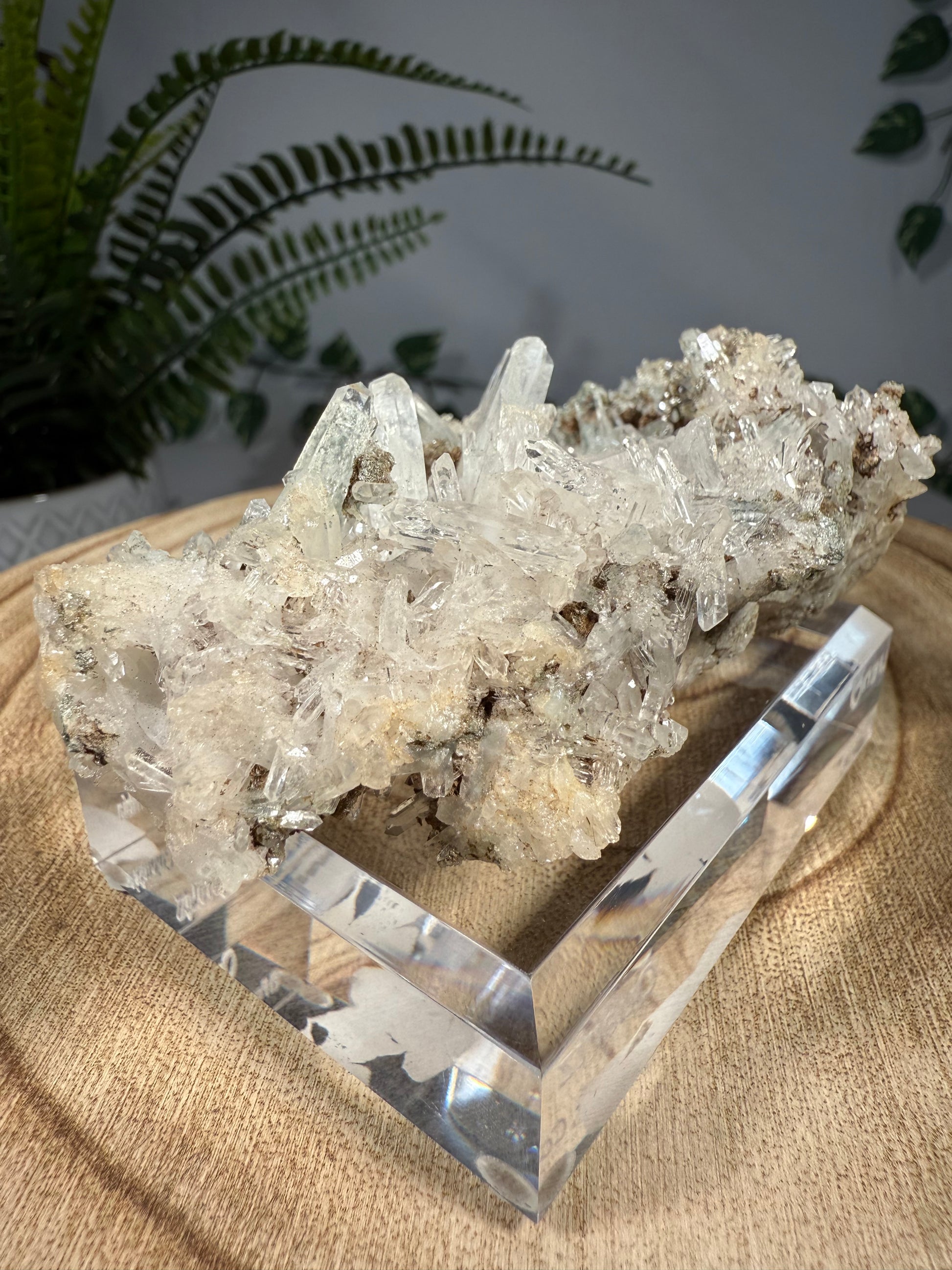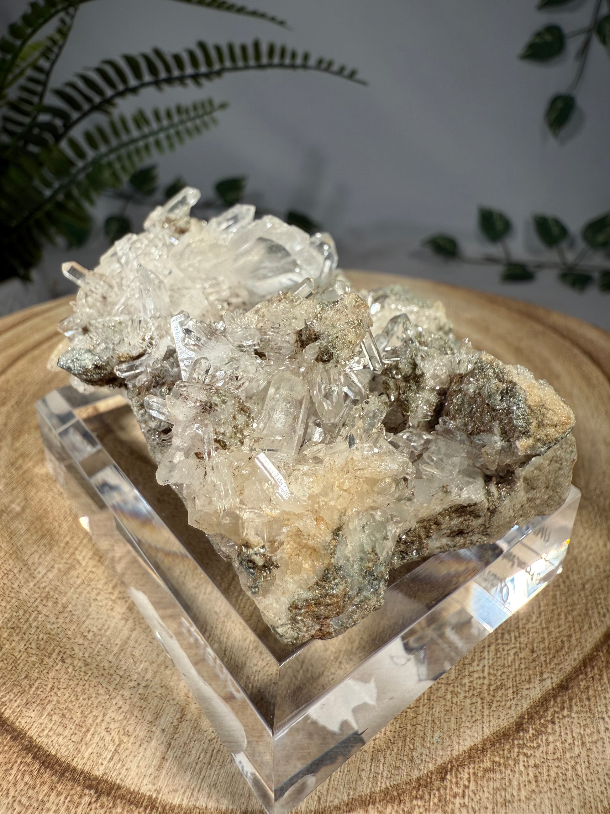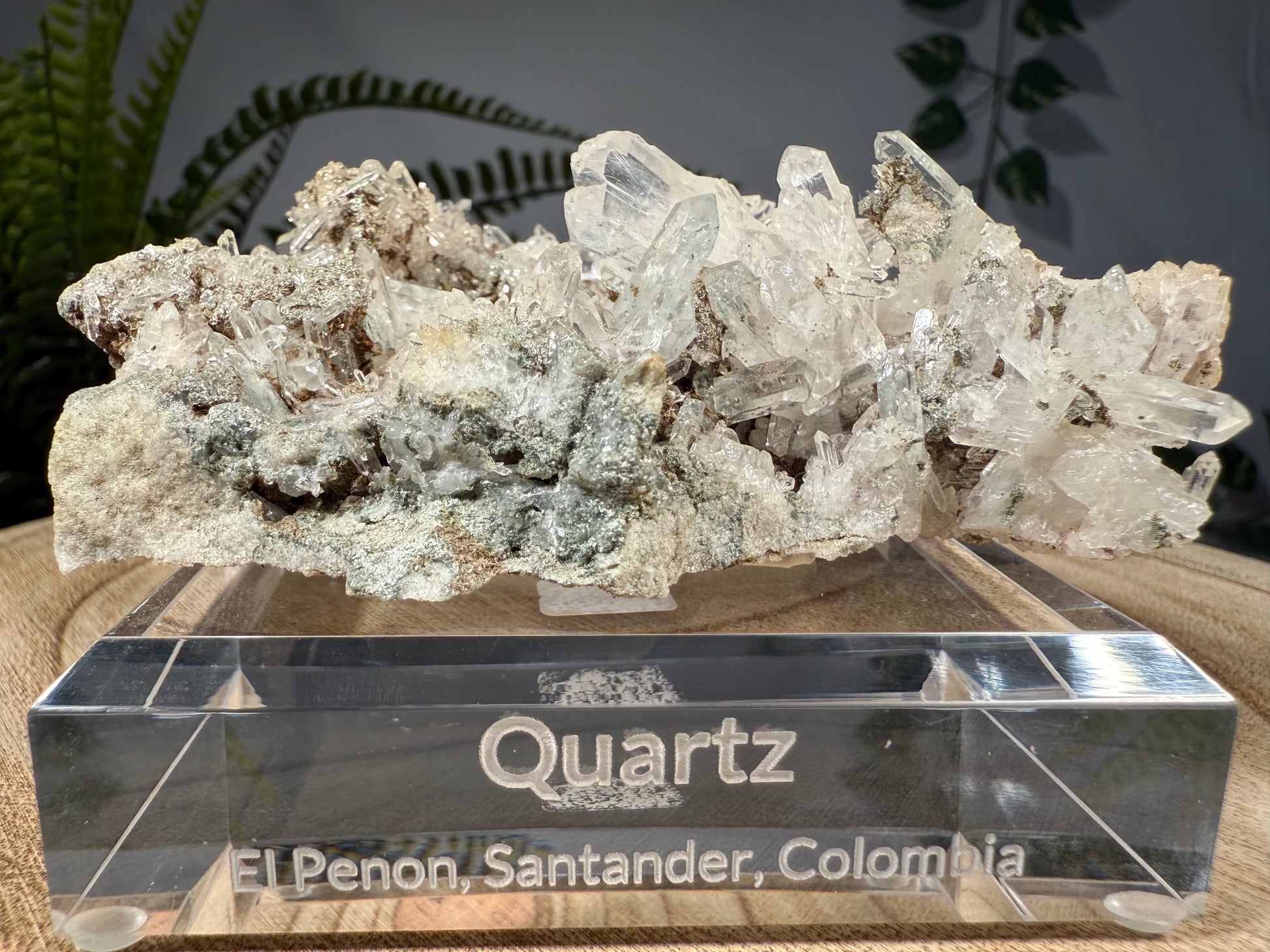 Die Stufe hat einige Fadenquarze und sitzt auf einem Acrylsockel mit Gravur. Es ist eine sehr schöne Stufe.