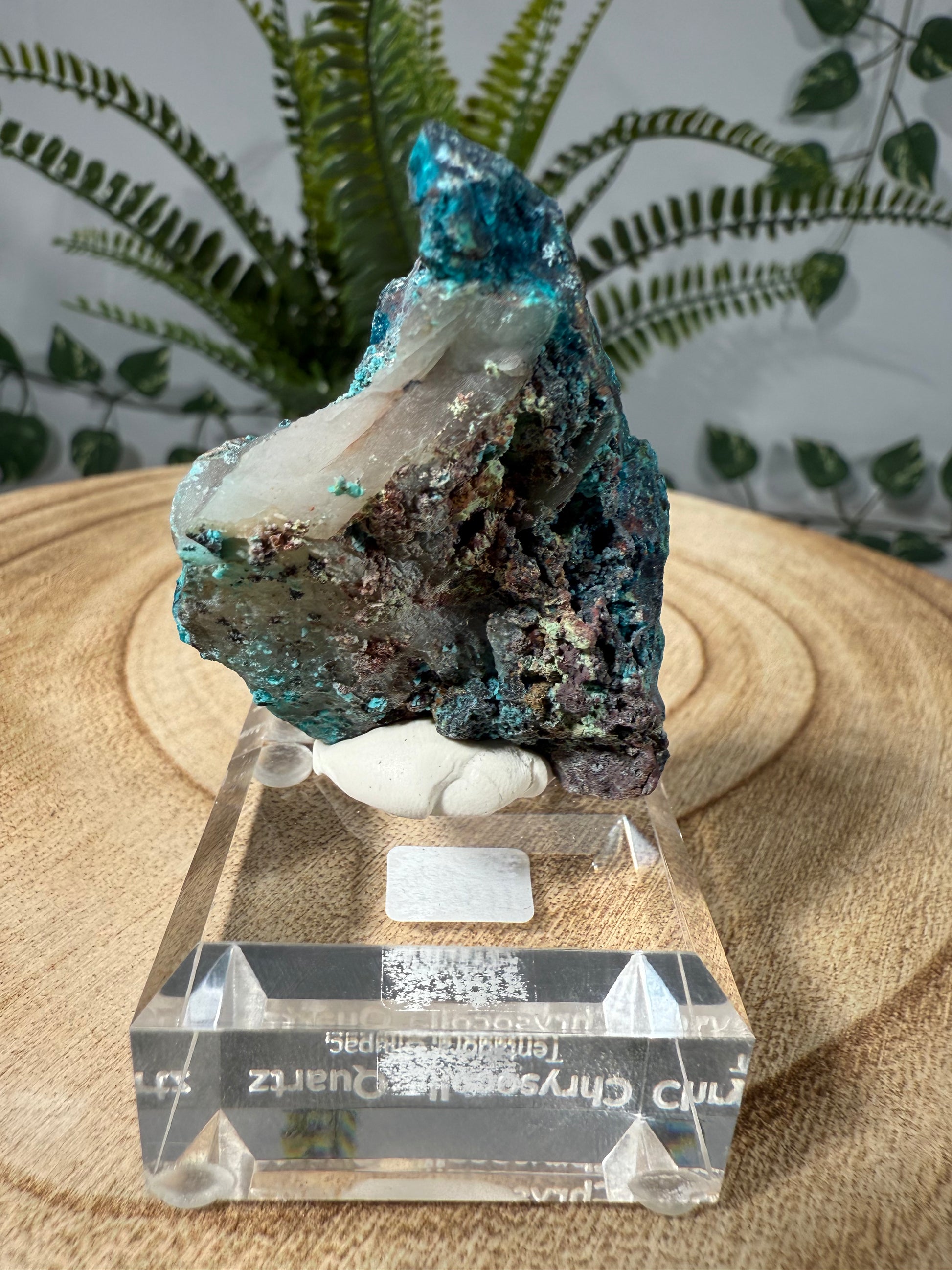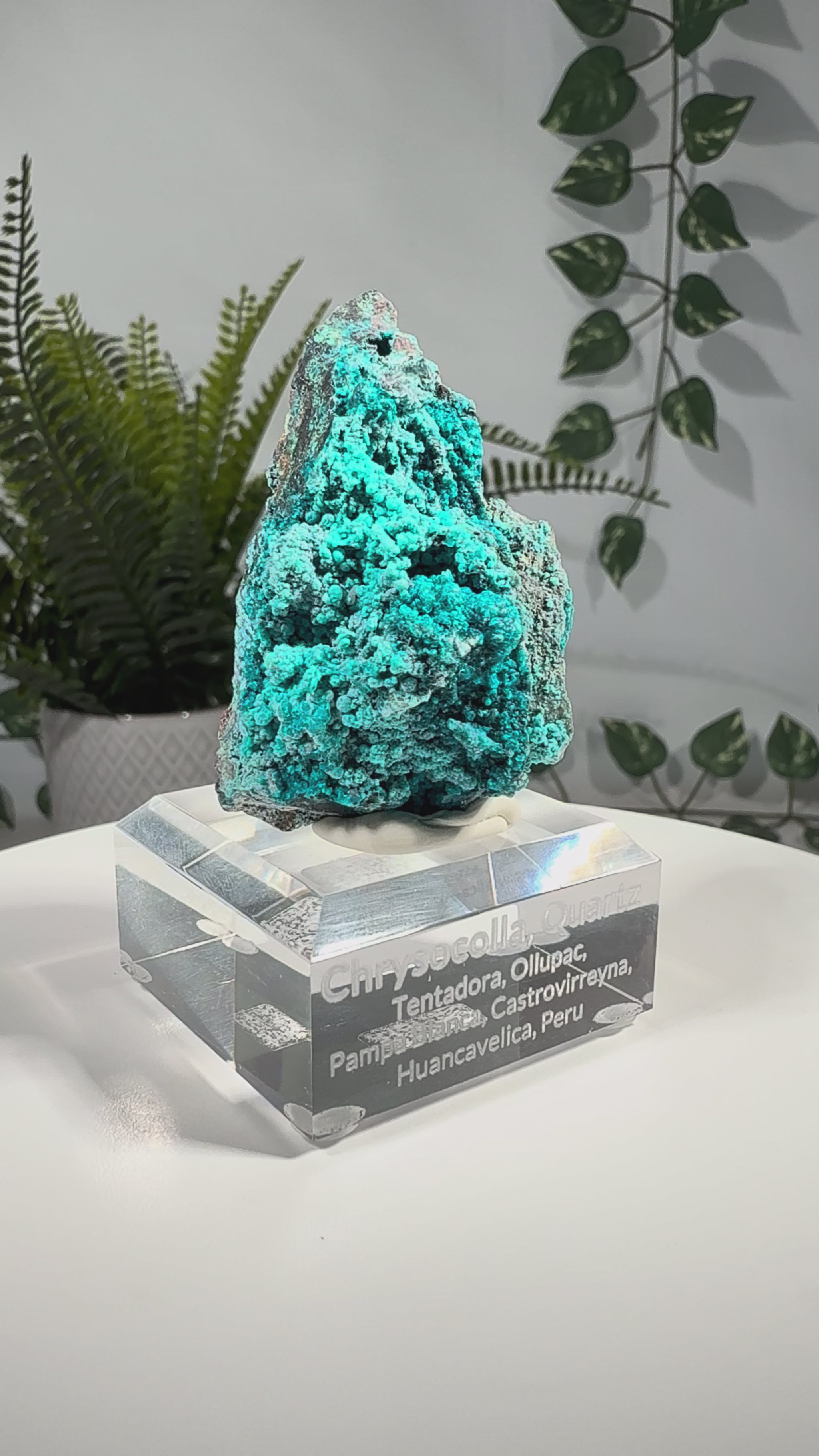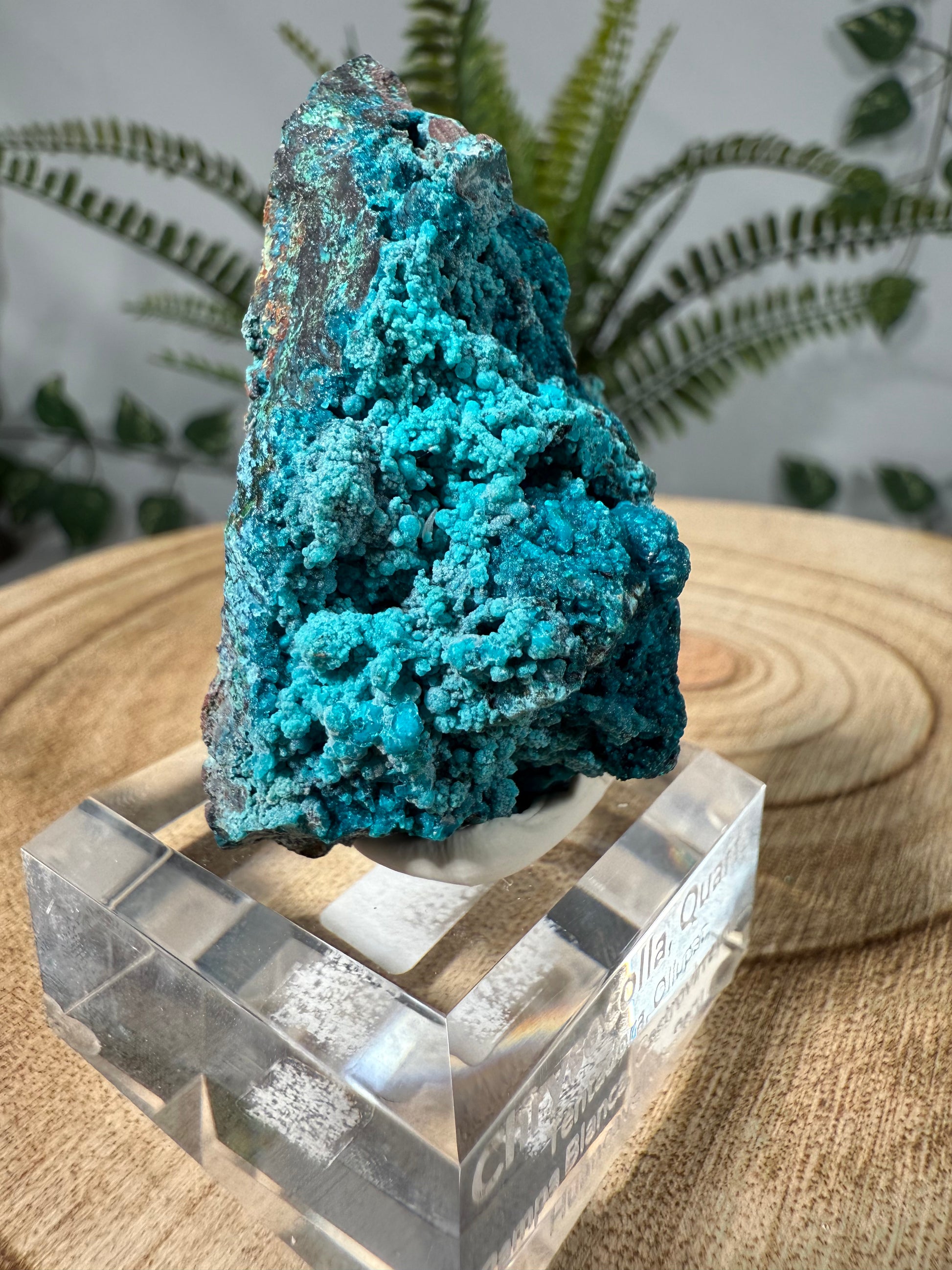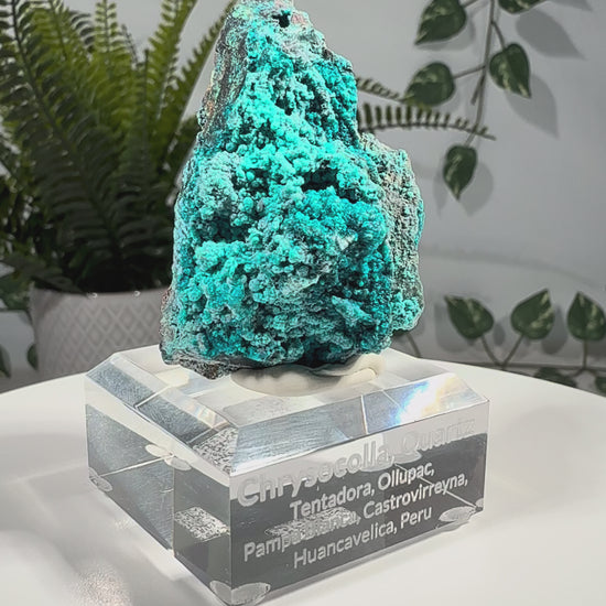 Der Chrysokoll sitzt auf einem Acrylsockel mit Gravur und ist eine sehr schöne Stufe.