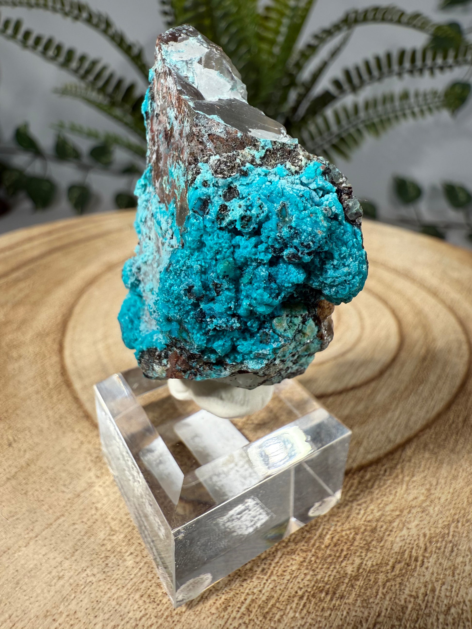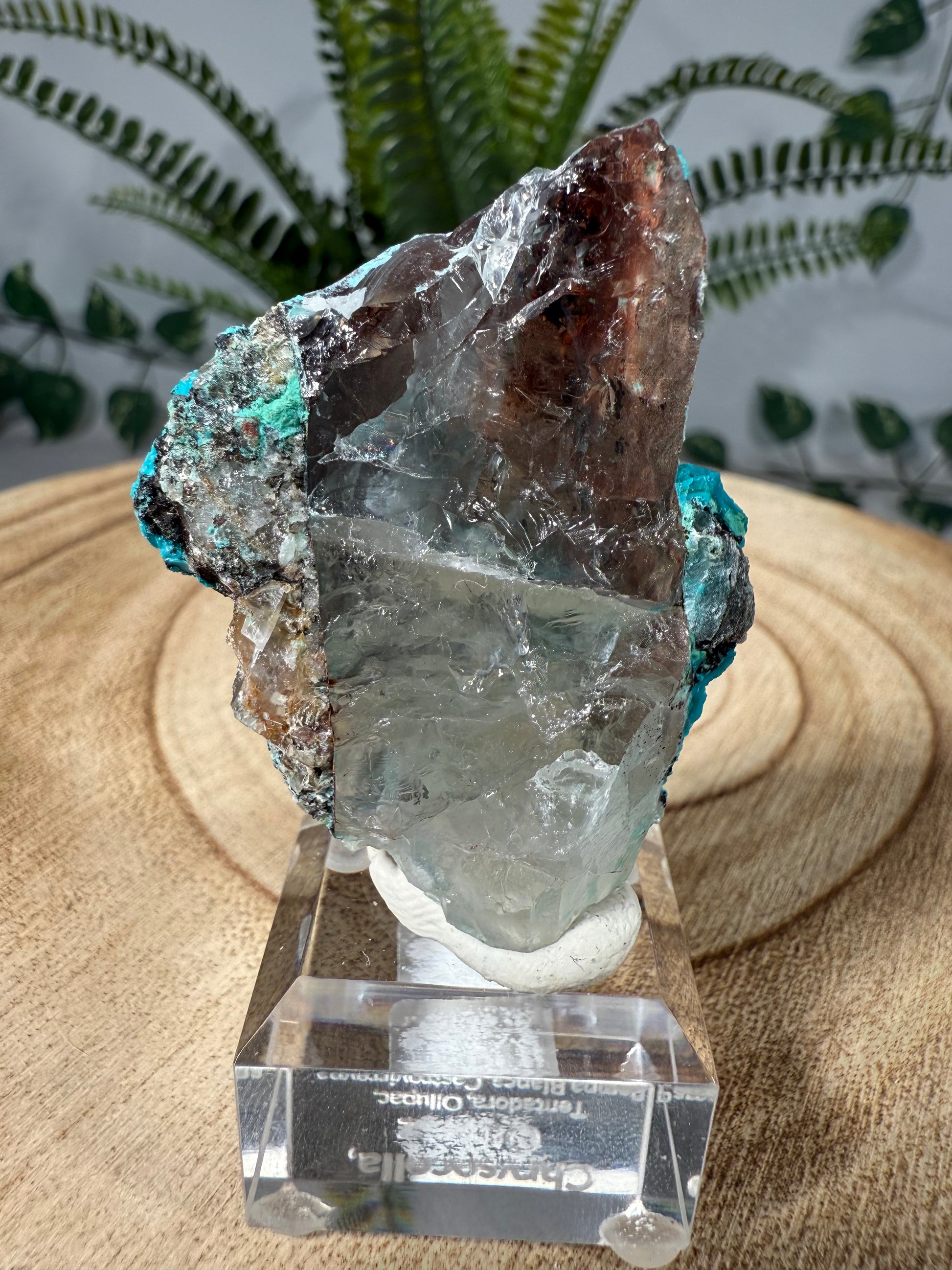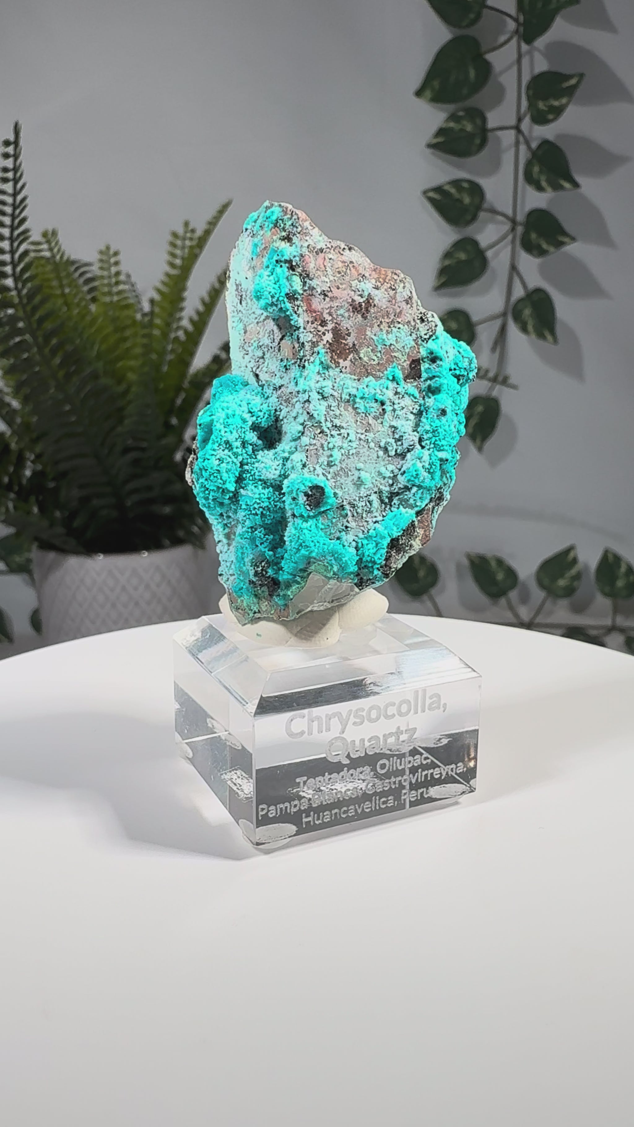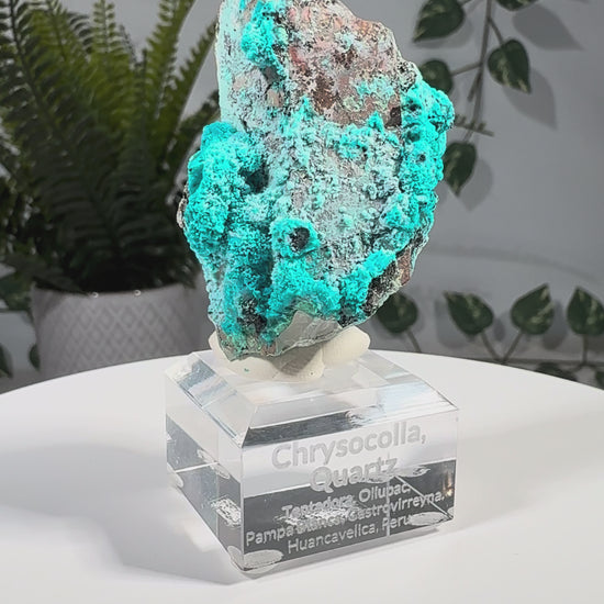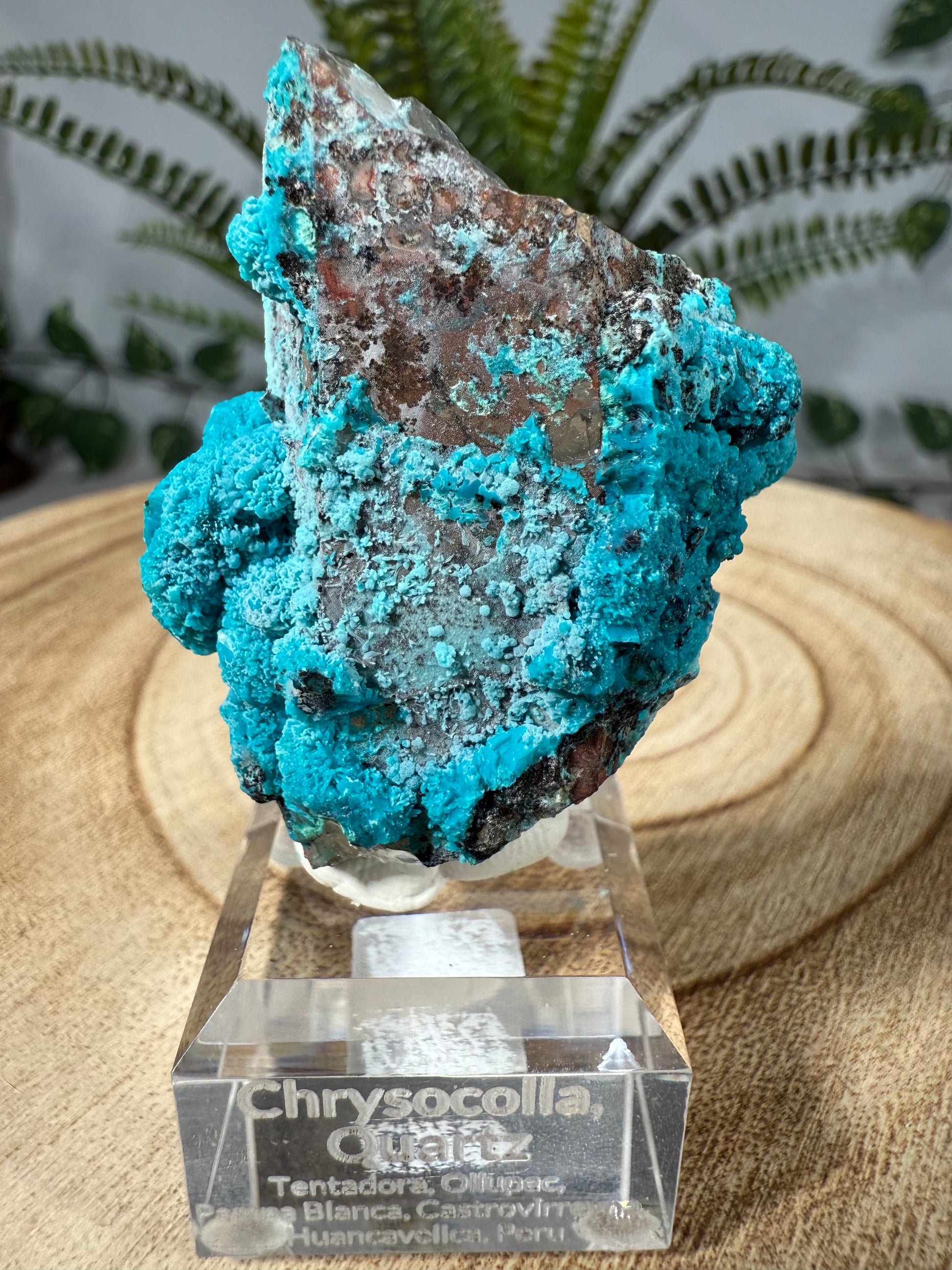 Der Chrysokoll sitzt auf einem Acrylsockel mit Gravur und ist eine sehr schöne Stufe.