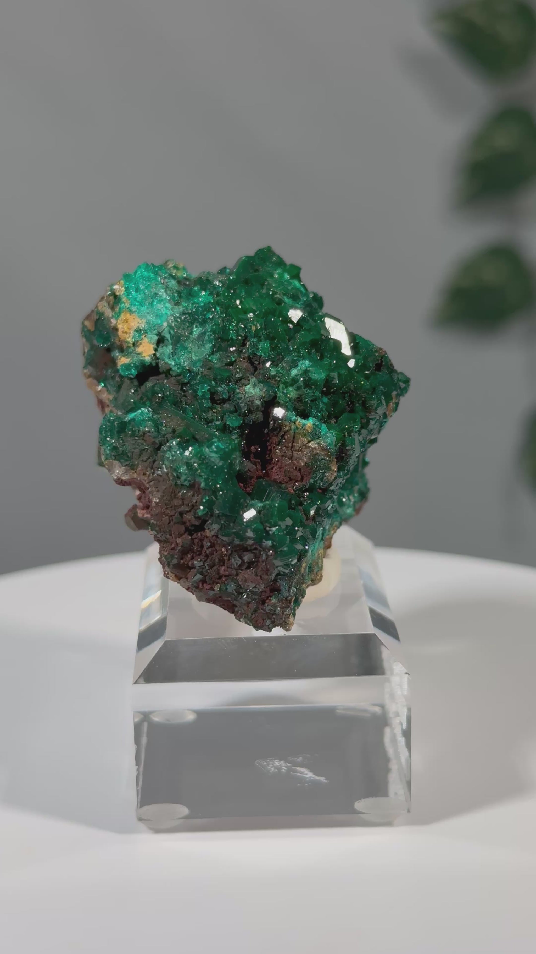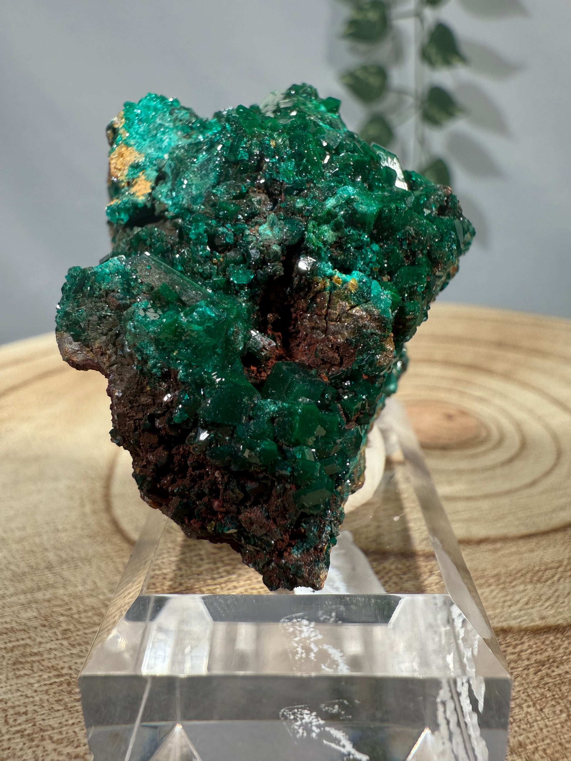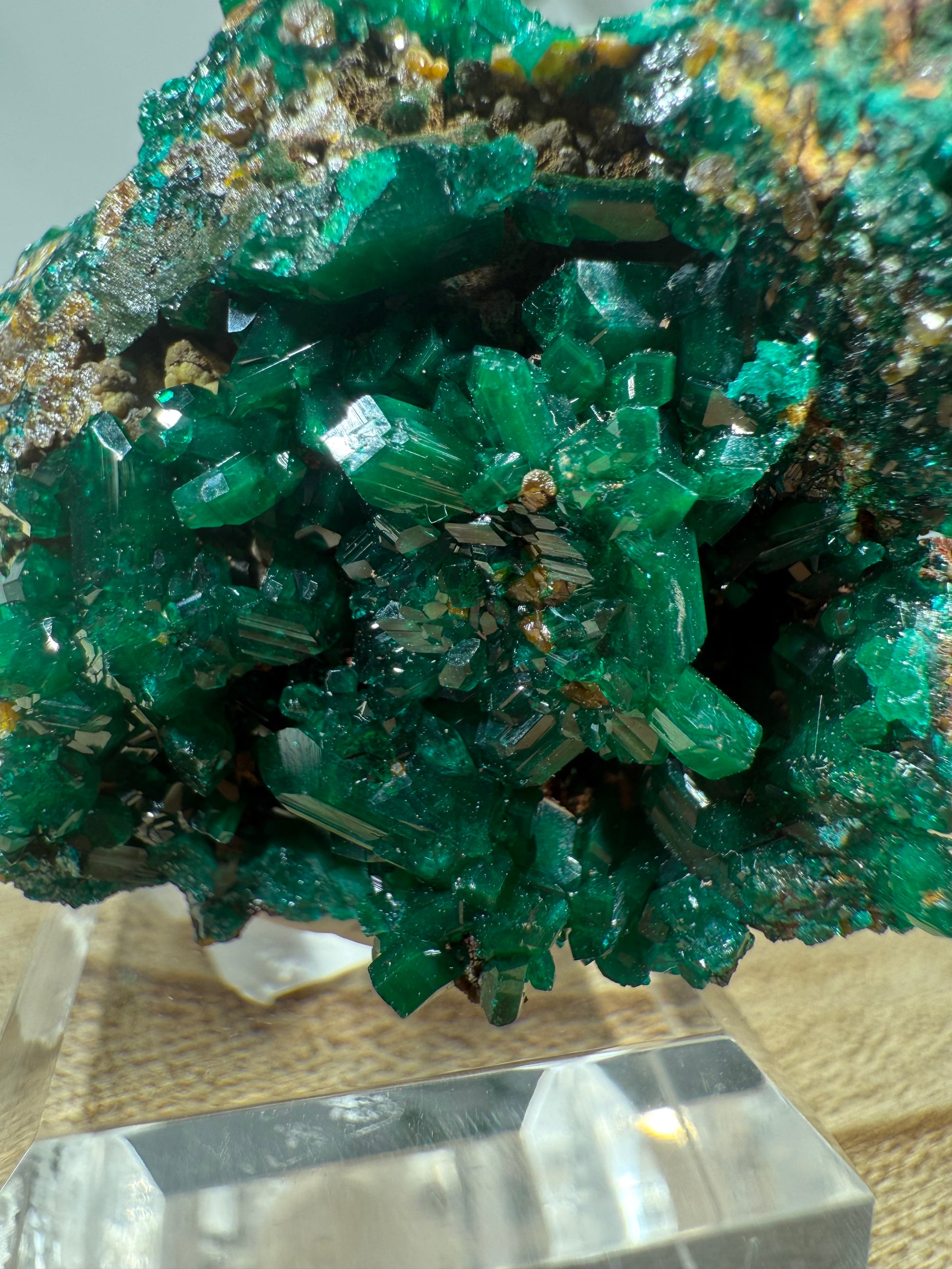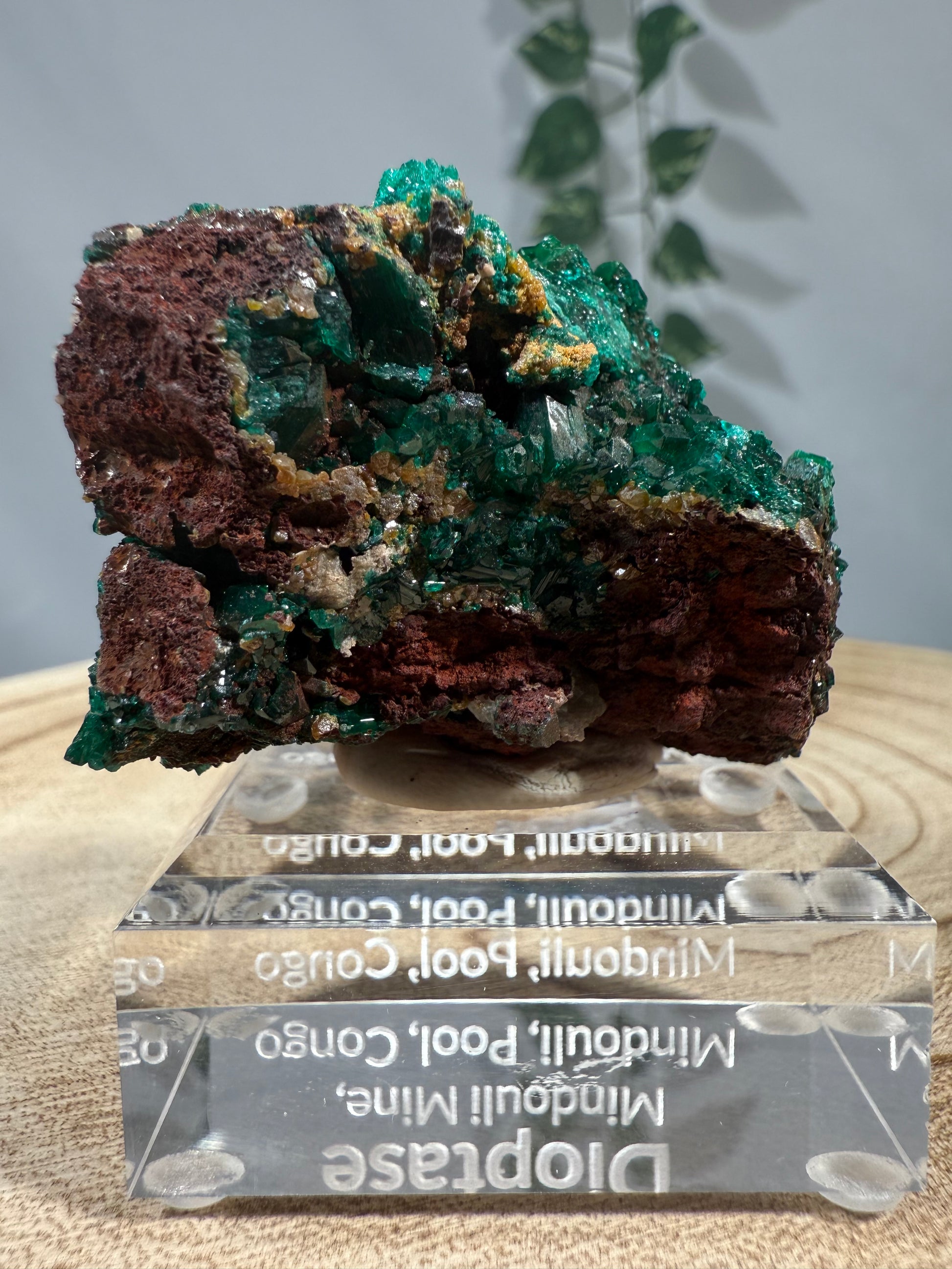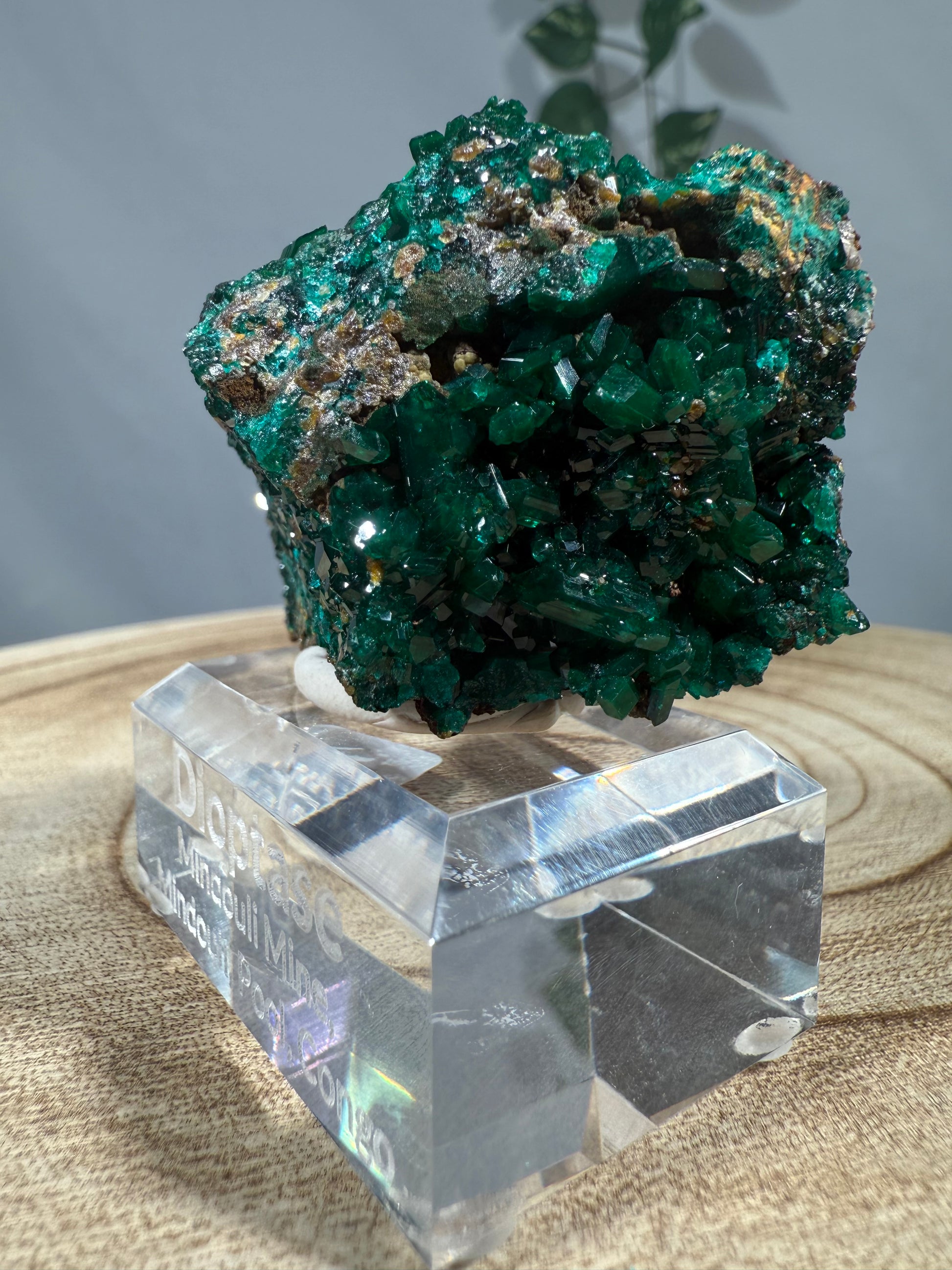 Das Mineral sitzt auf einem Acrylsockel mit Gravur und ist eine schöne Stufe.