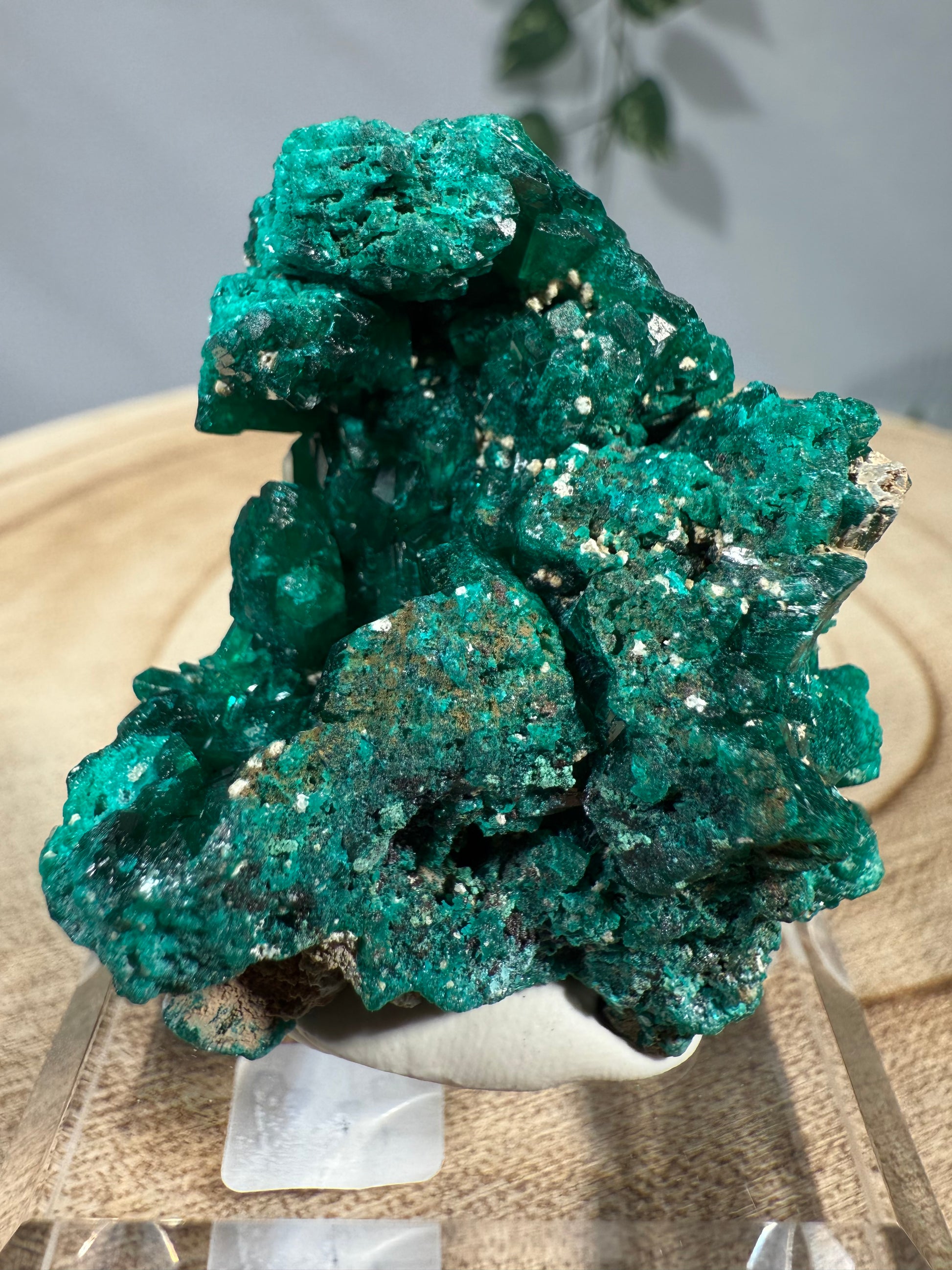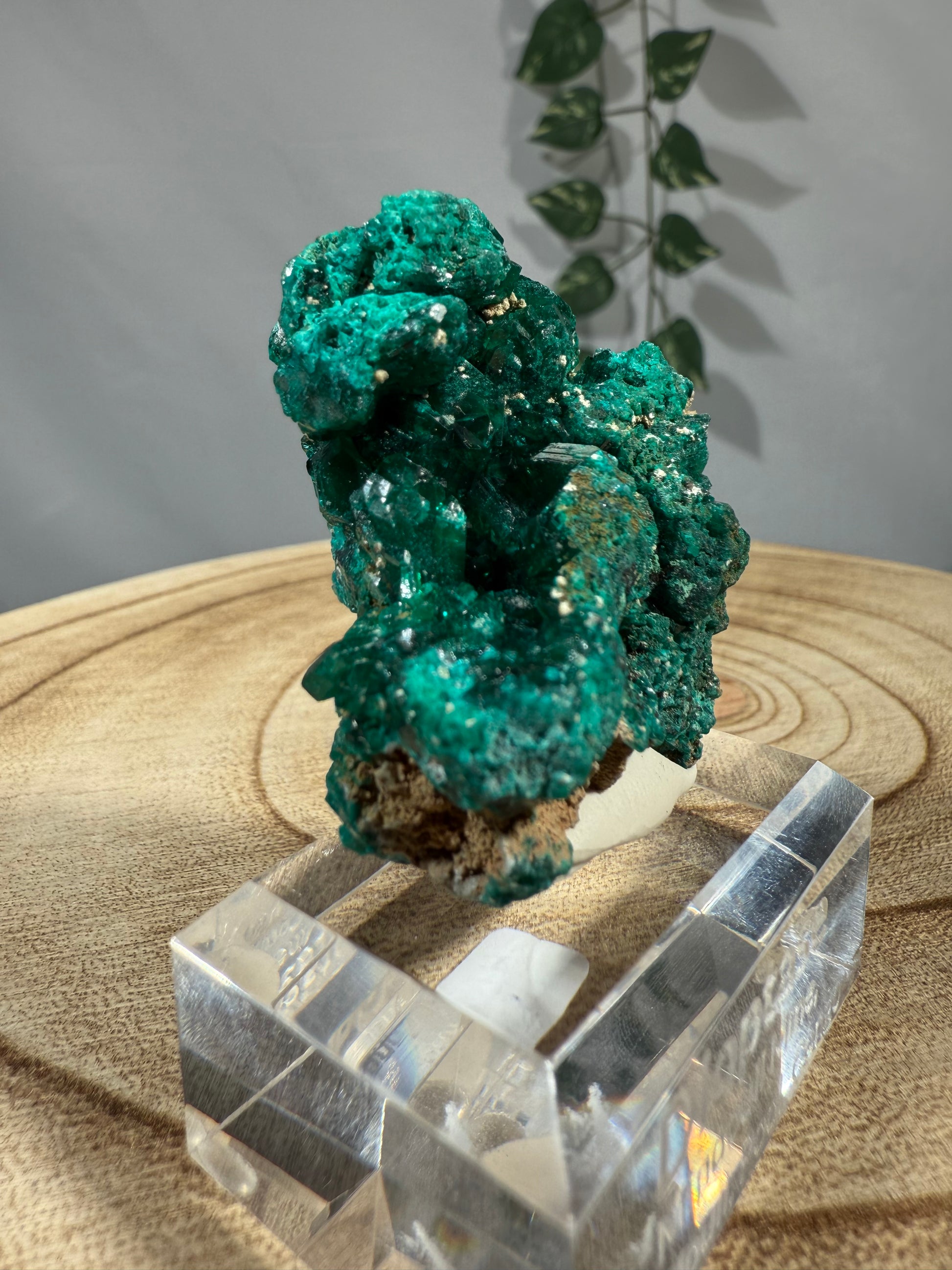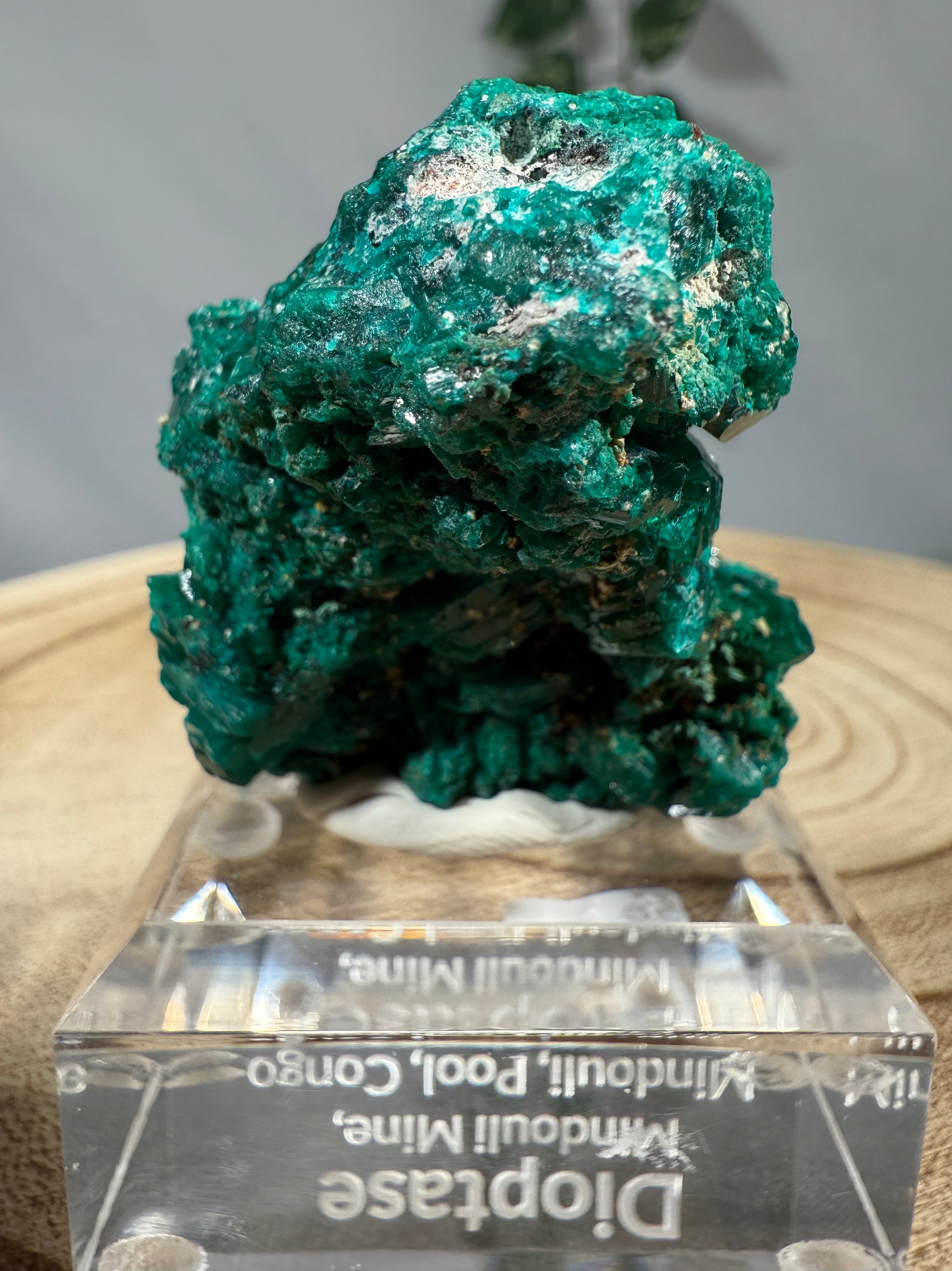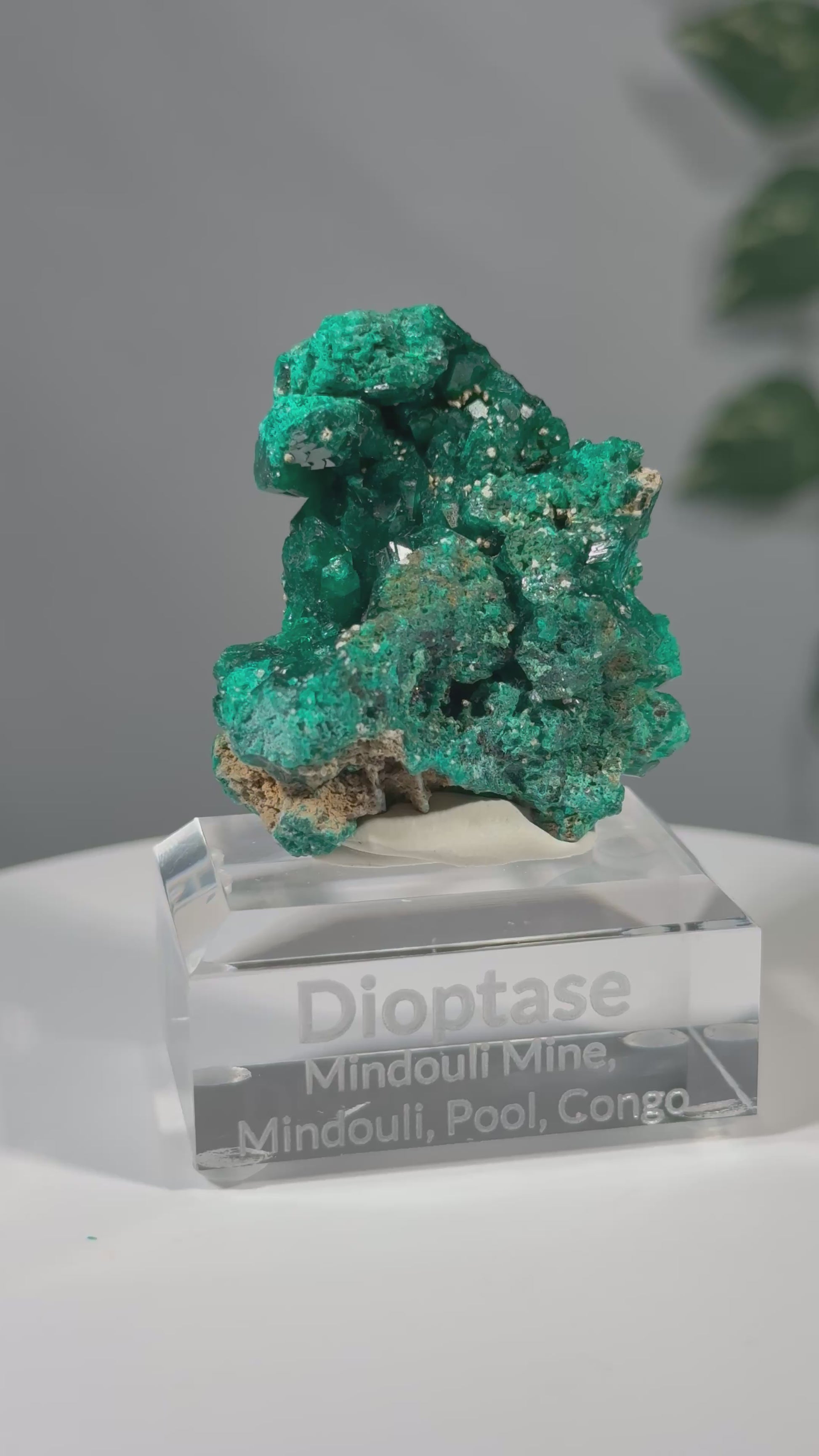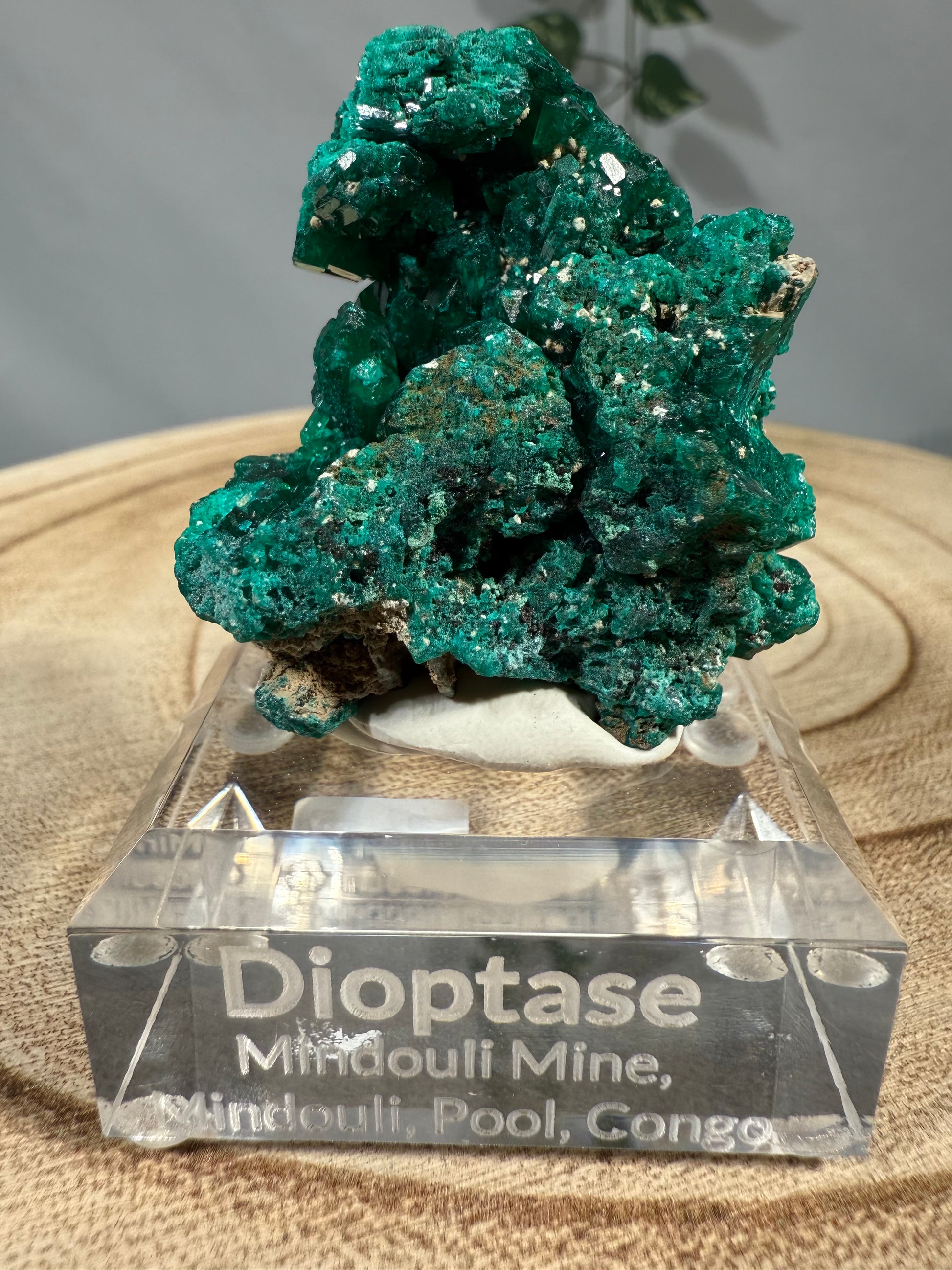 Das Mineral sitzt auf einem Acrylsockel mit Gravur und ist eine schöne Stufe.