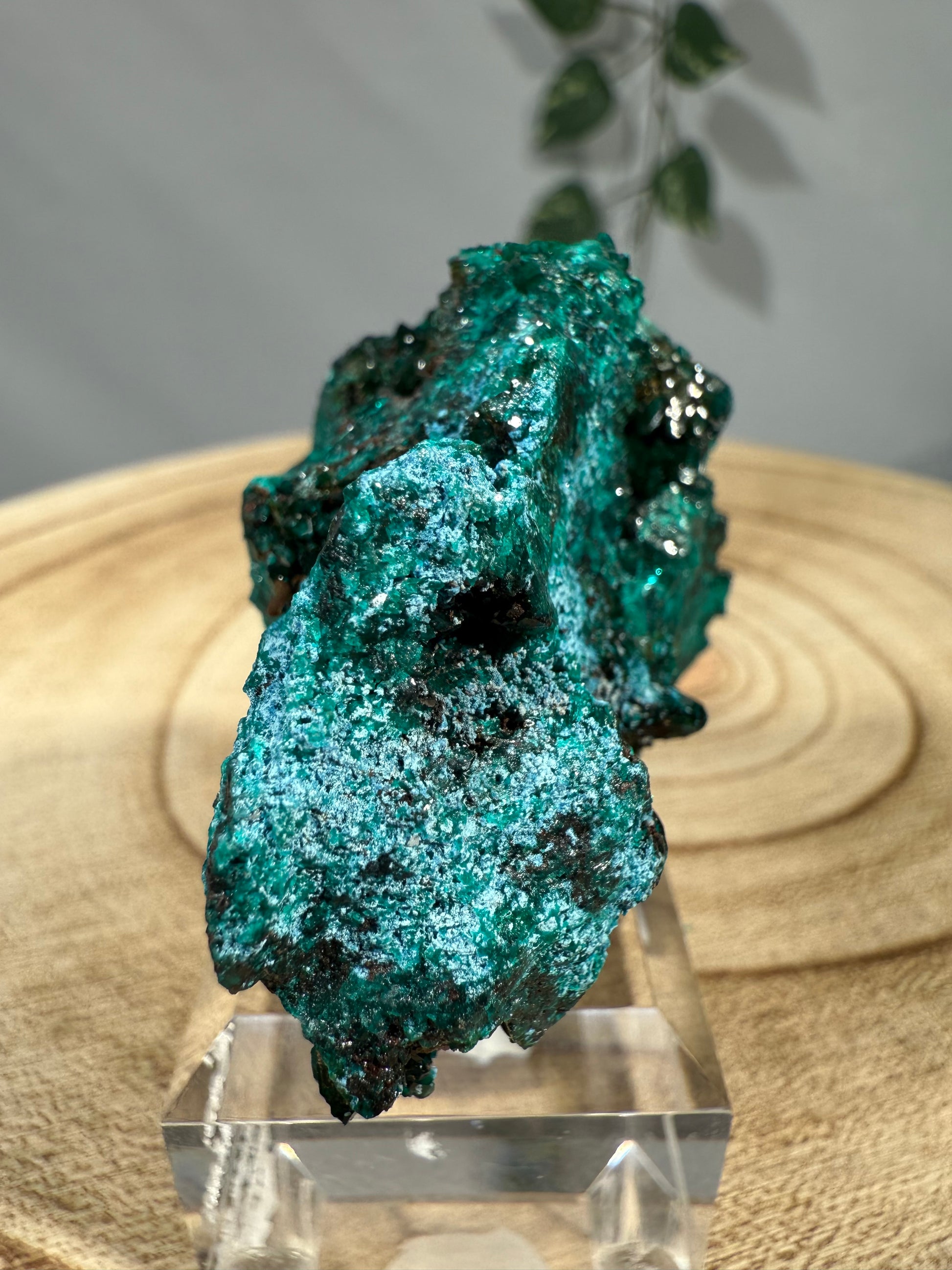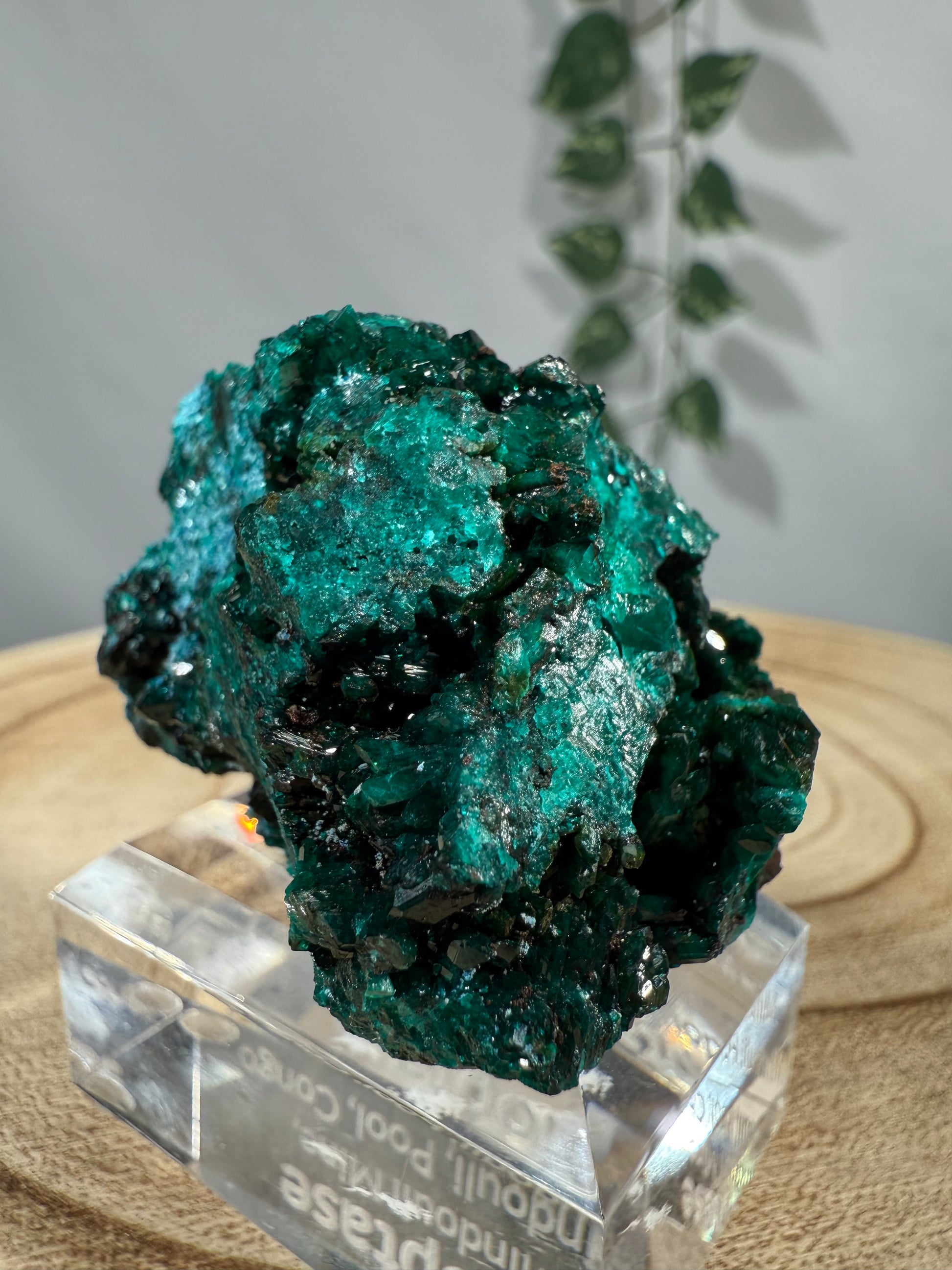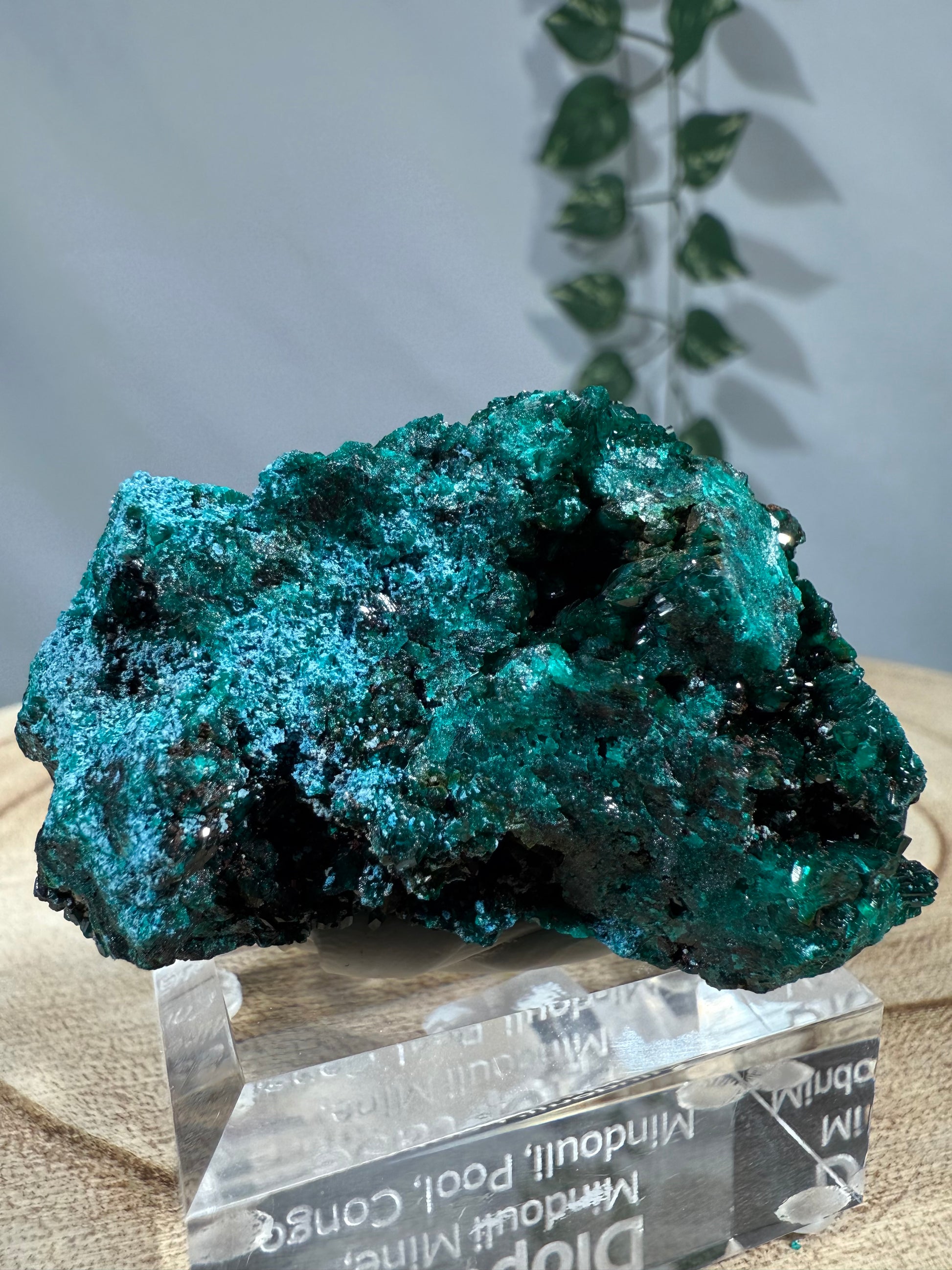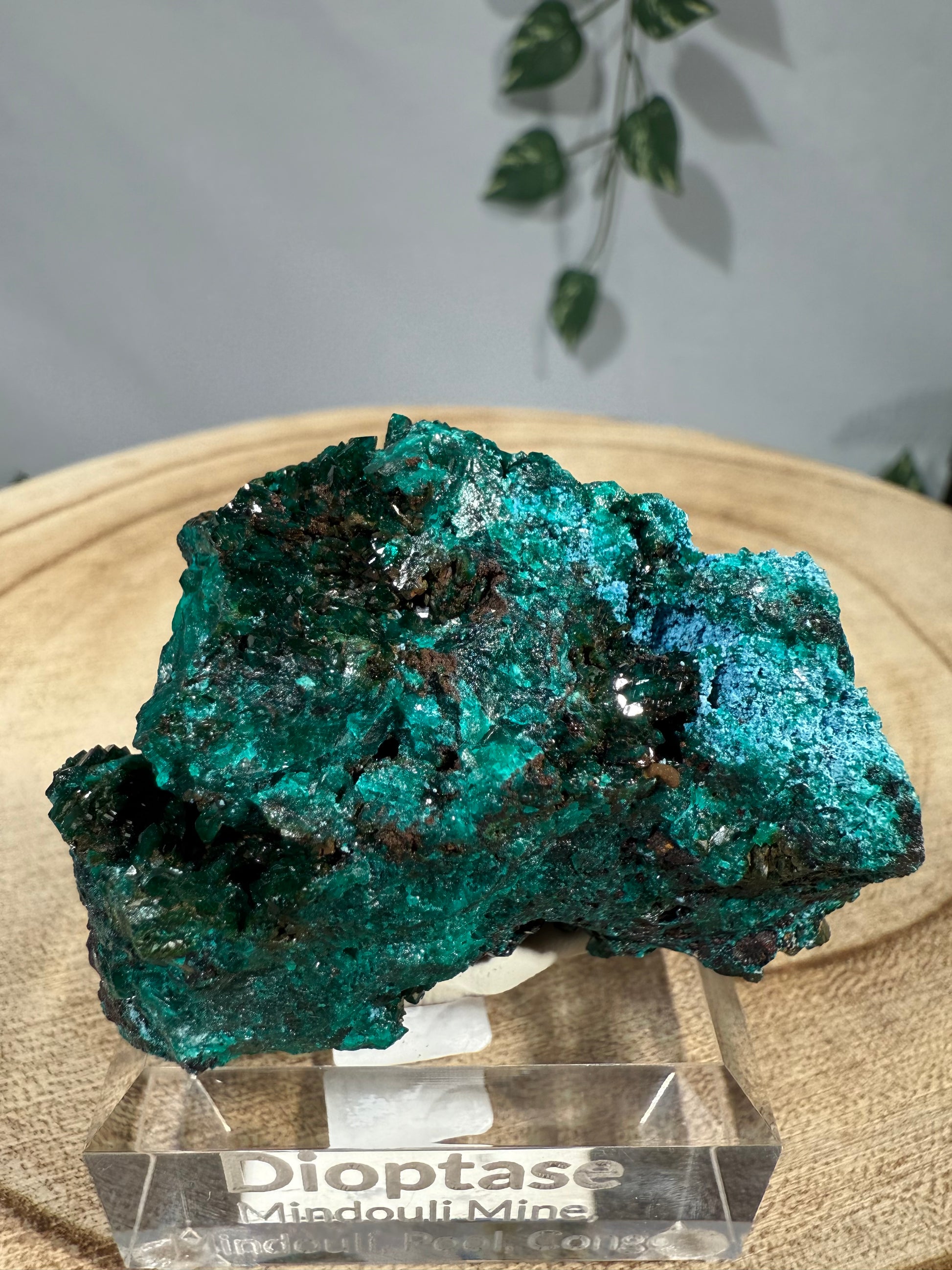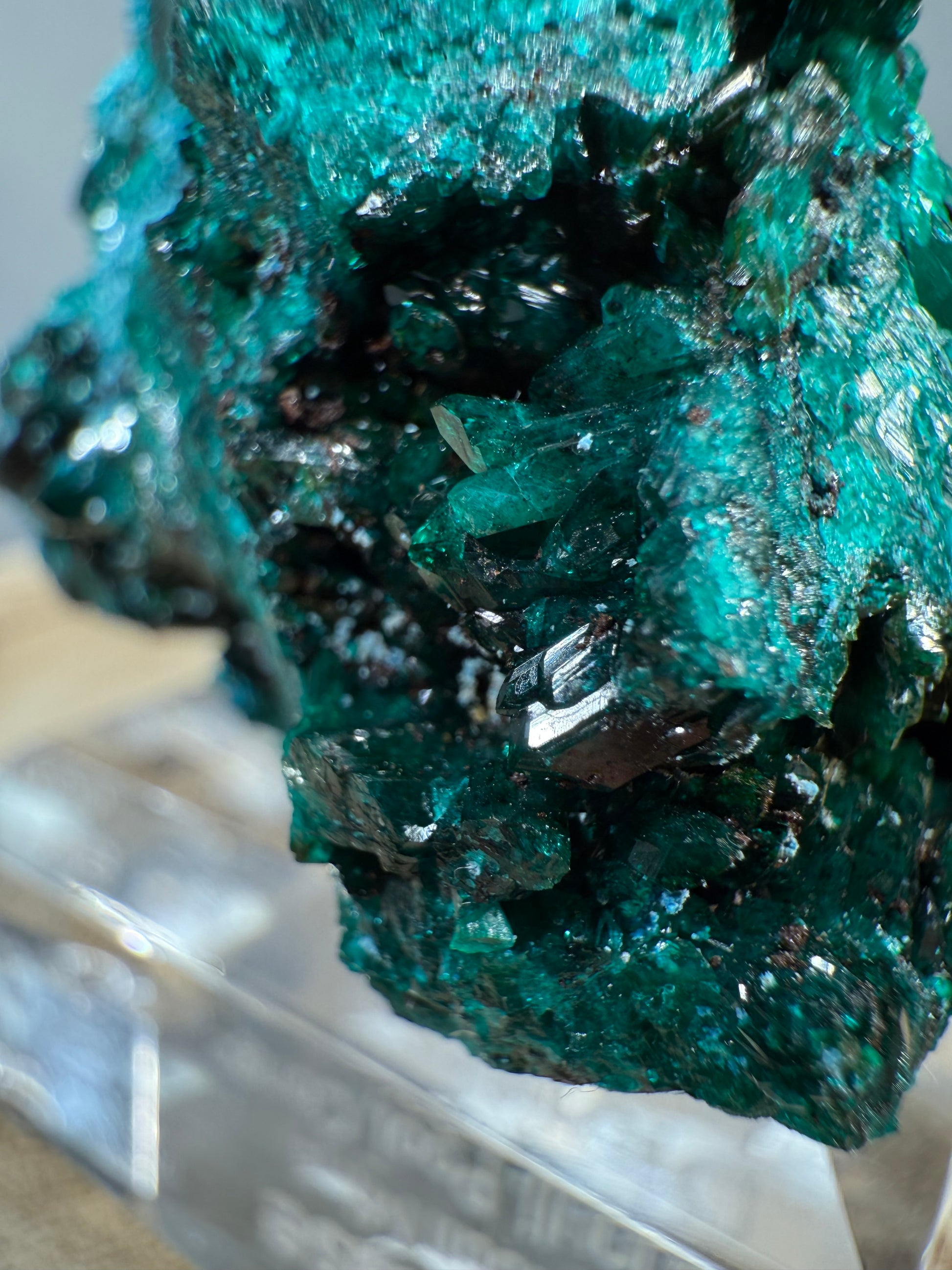 Das Mineral sitzt auf einem Acrylsockel mit Gravur und ist eine schöne Stufe.