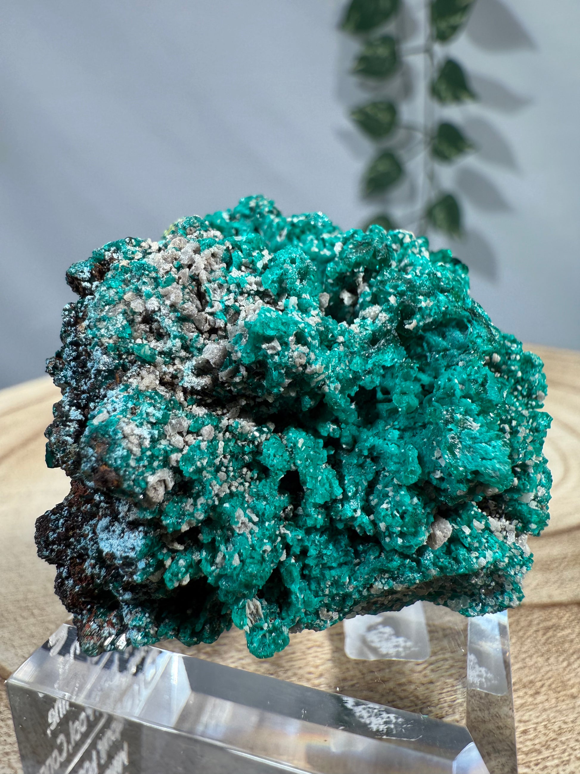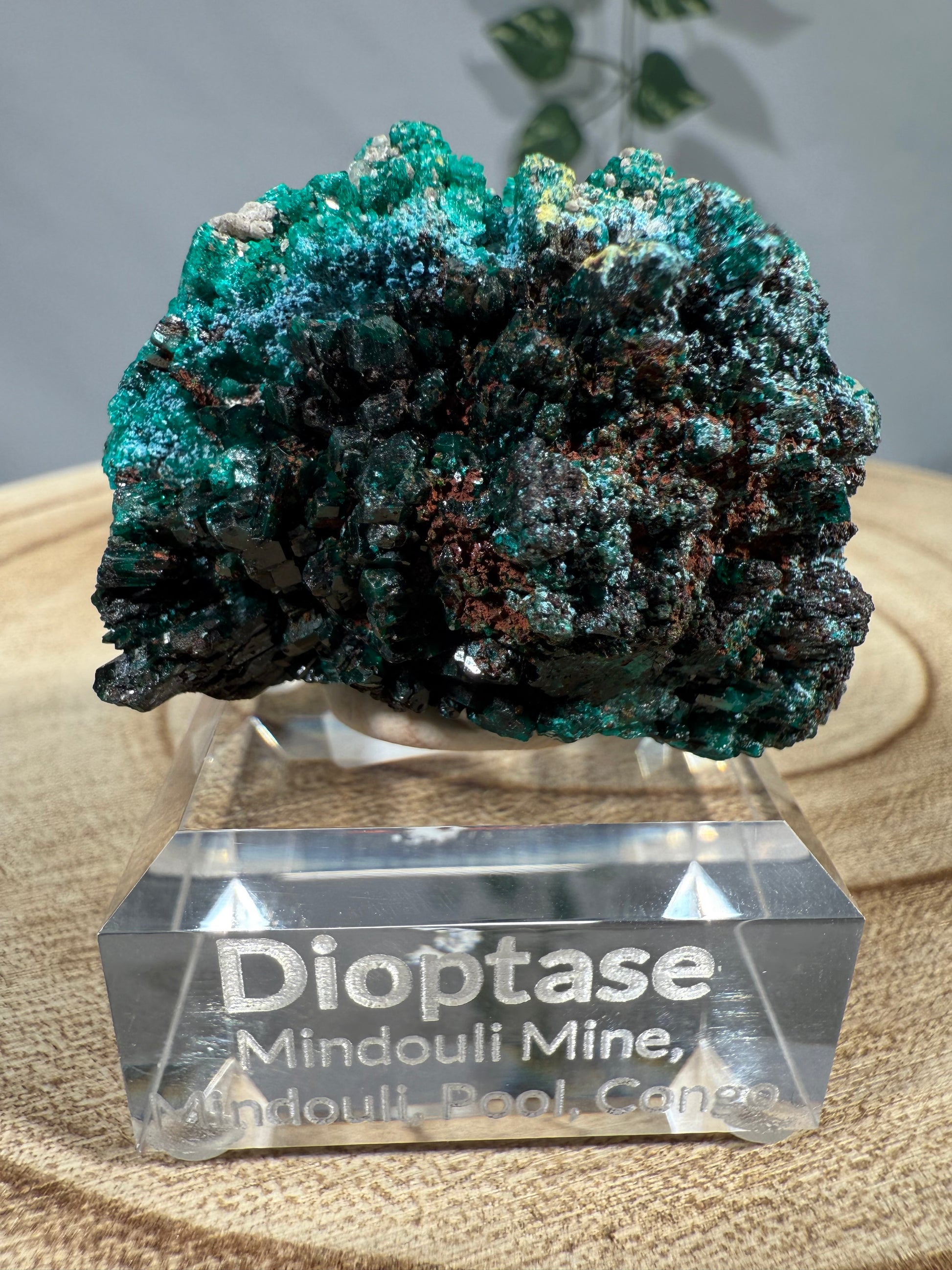 Das Mineral sitzt auf einem Acrylsockel mit Gravur und ist eine schöne Stufe.