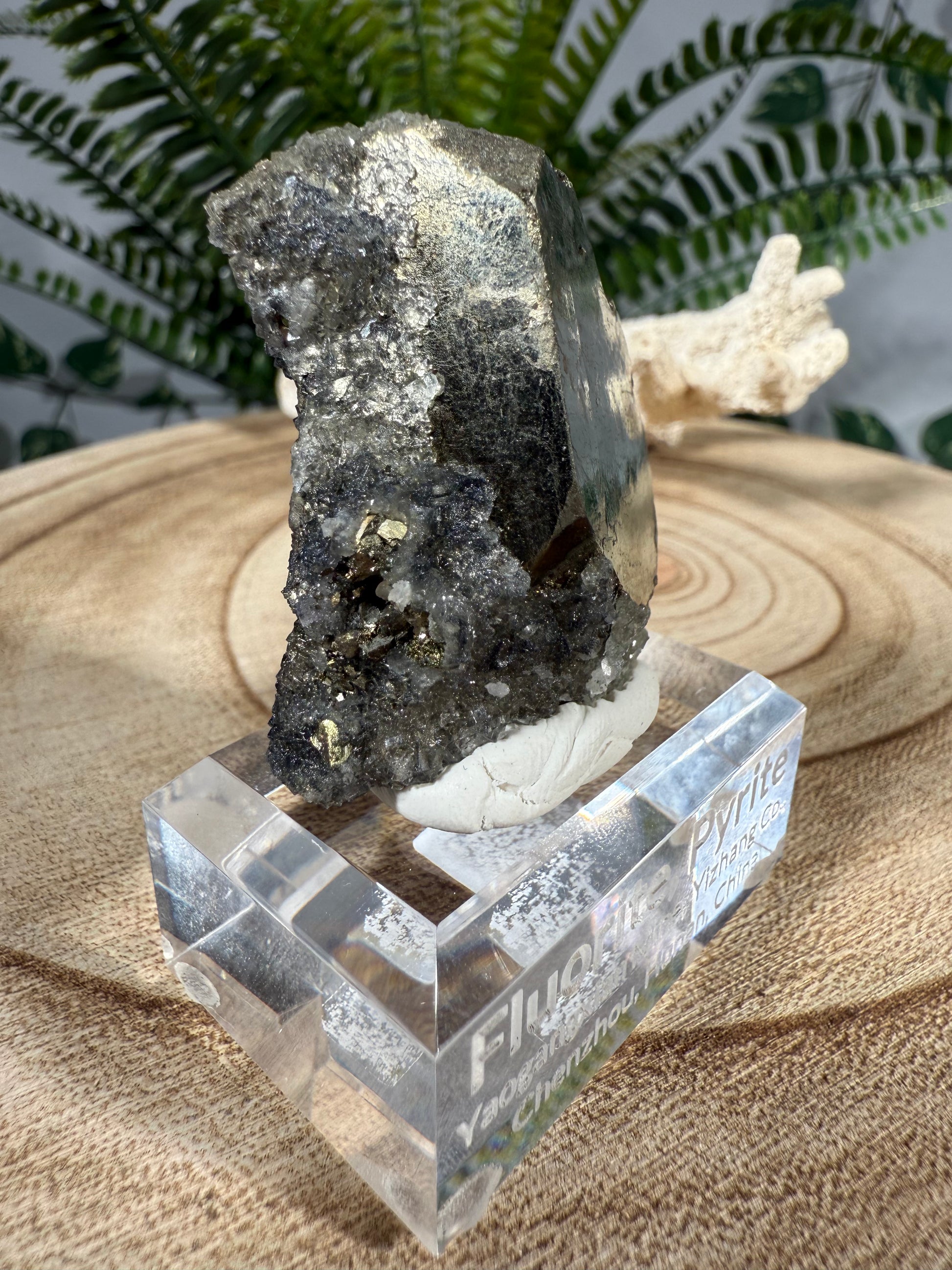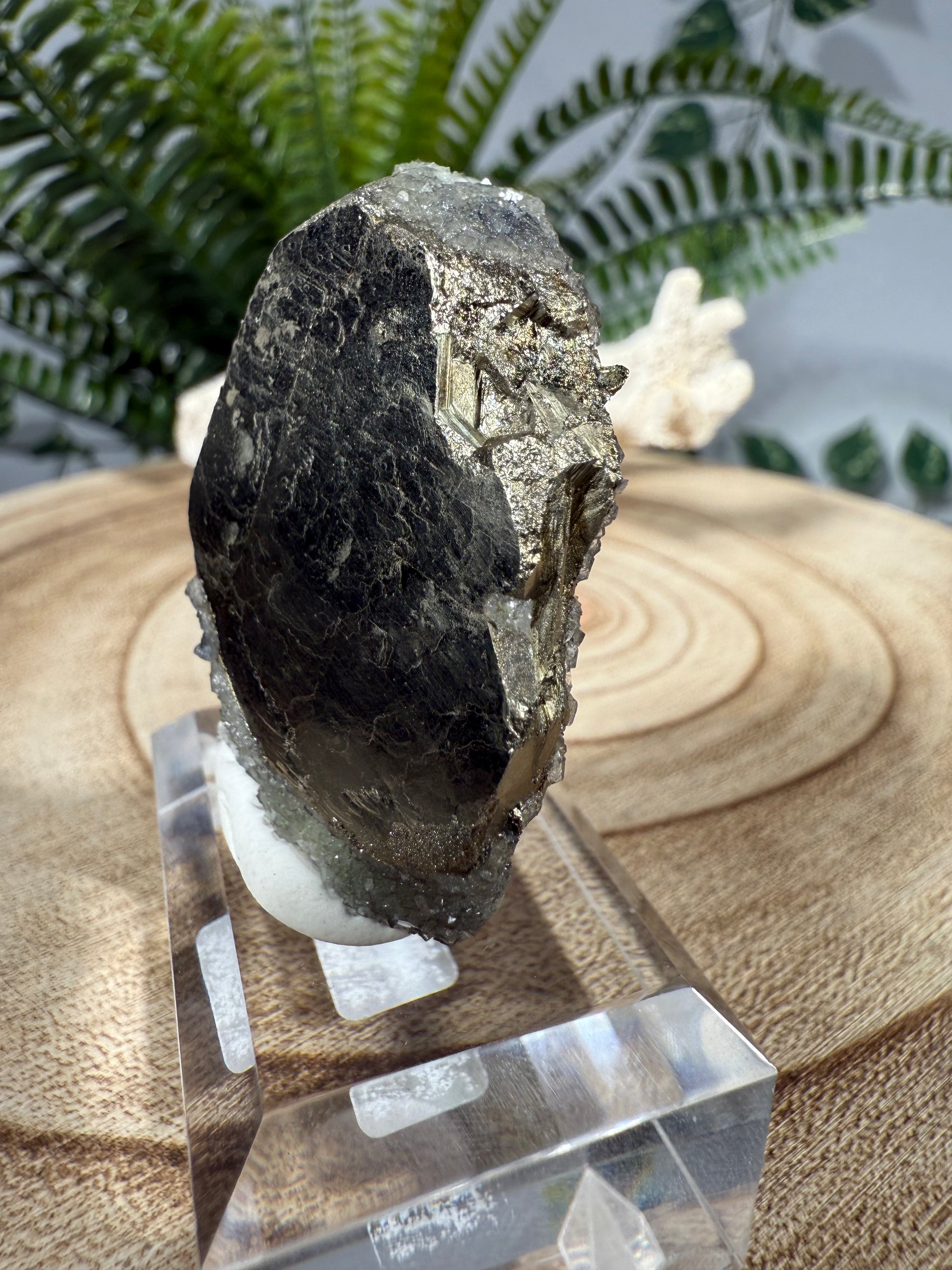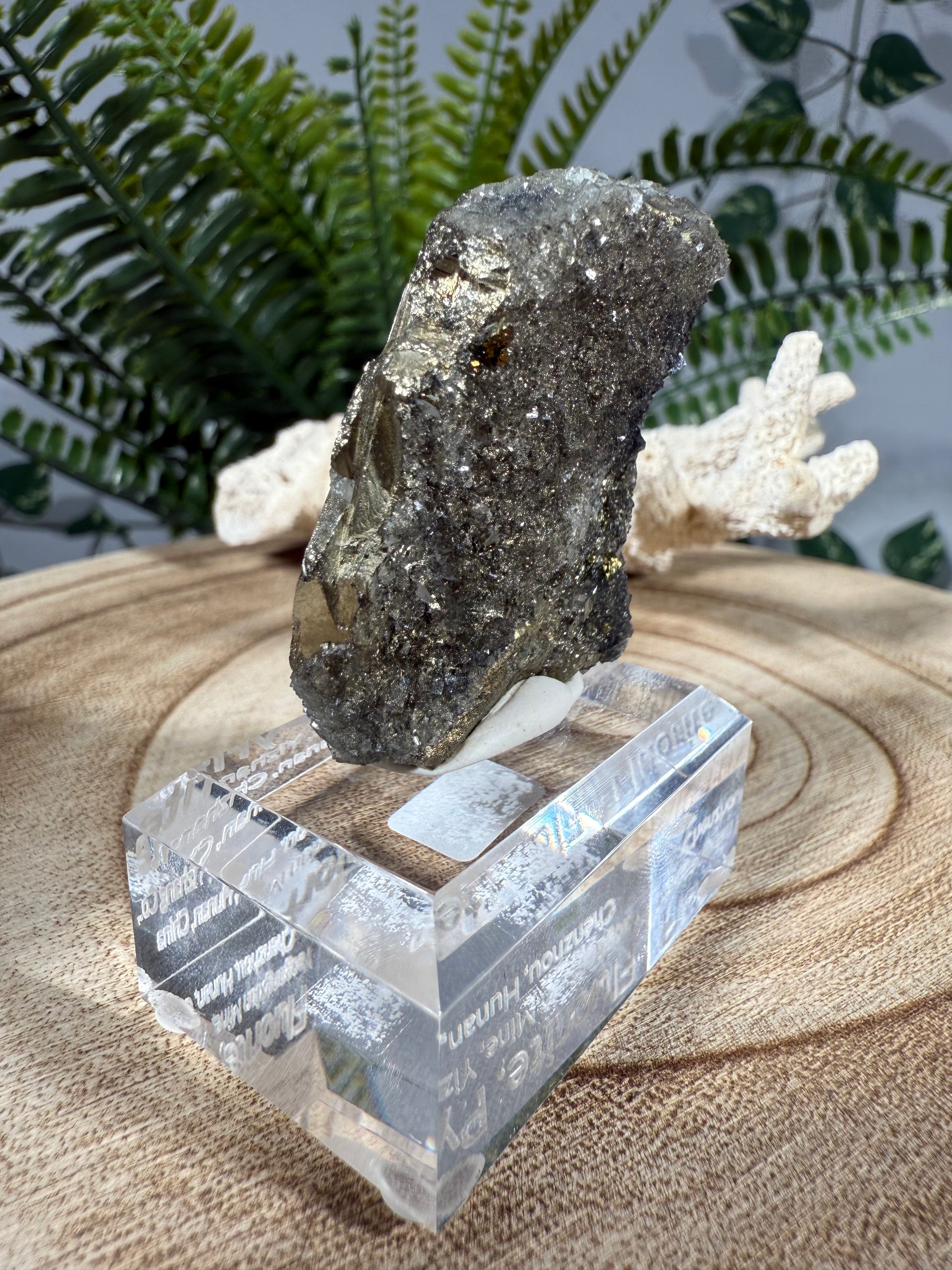 Der Pyrit sitzt auf einem Acrylsockel mit Gravur und ist eine sehr schöne Stufe.