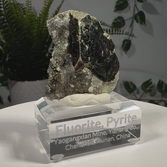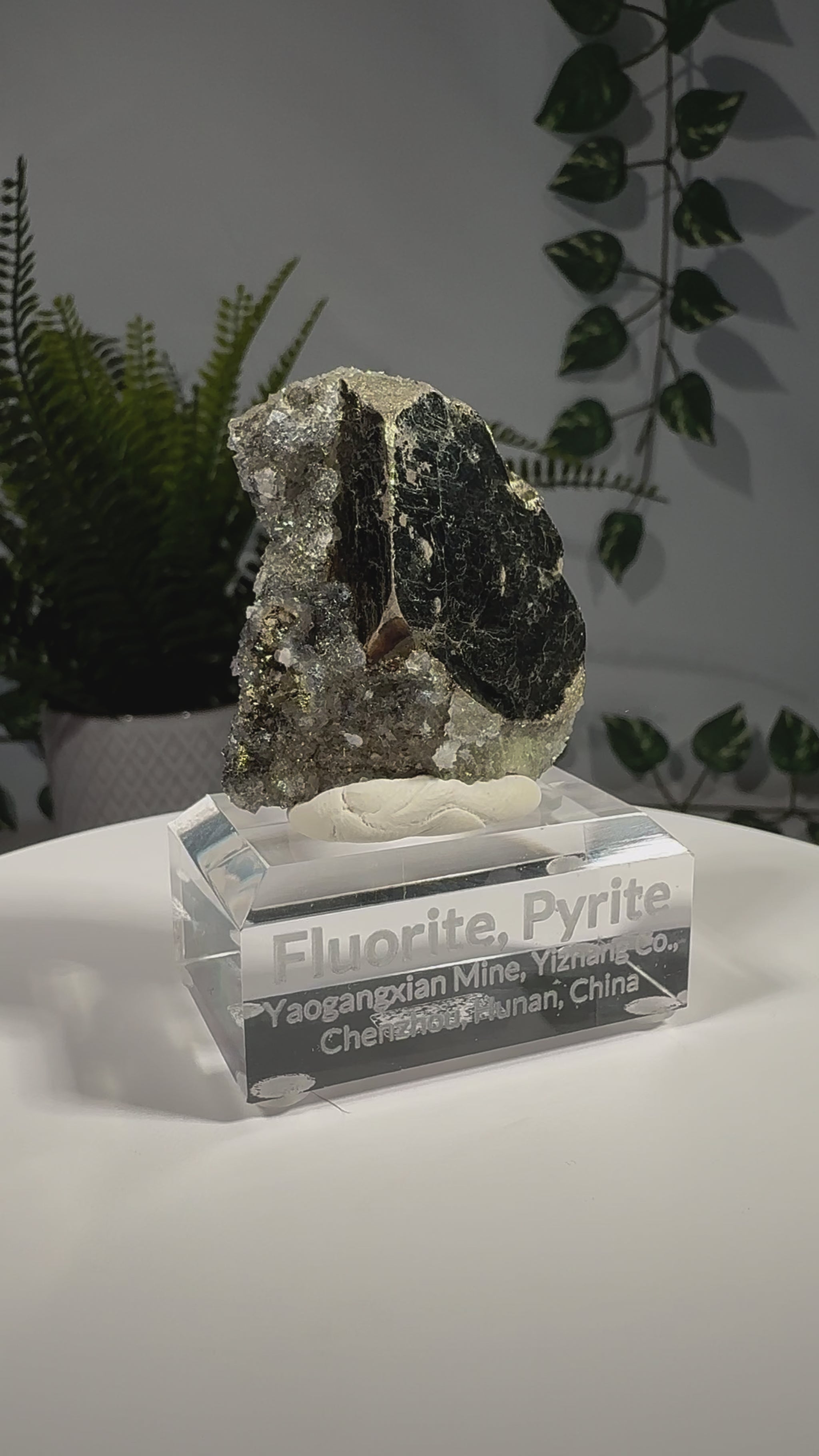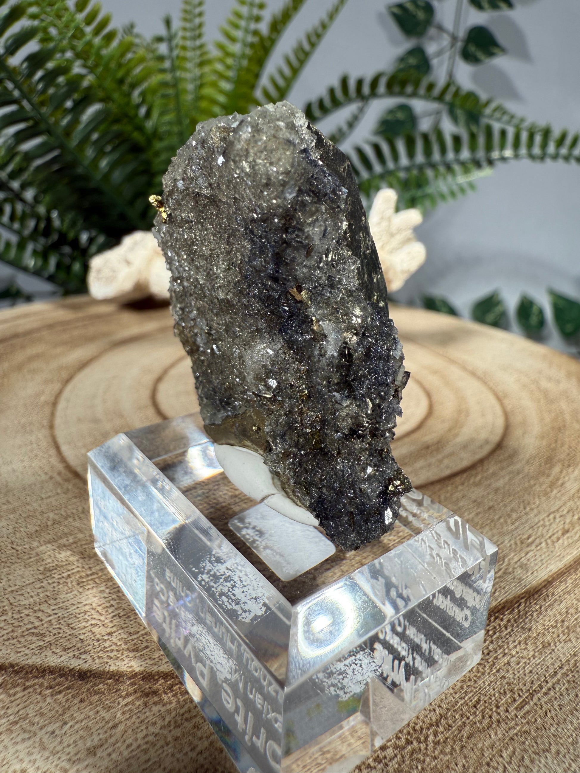 Der Pyrit sitzt auf einem Acrylsockel mit Gravur und ist eine sehr schöne Stufe.