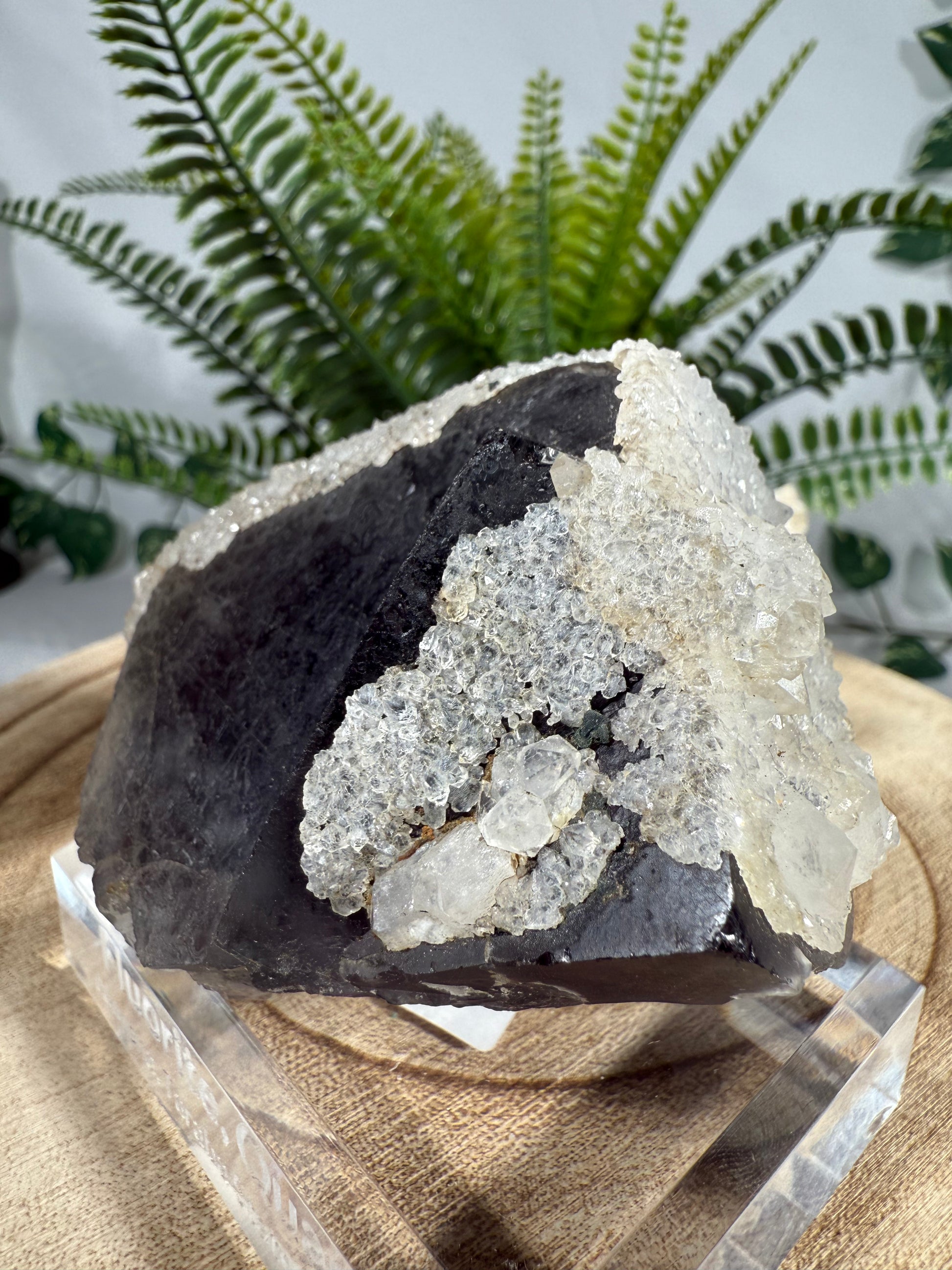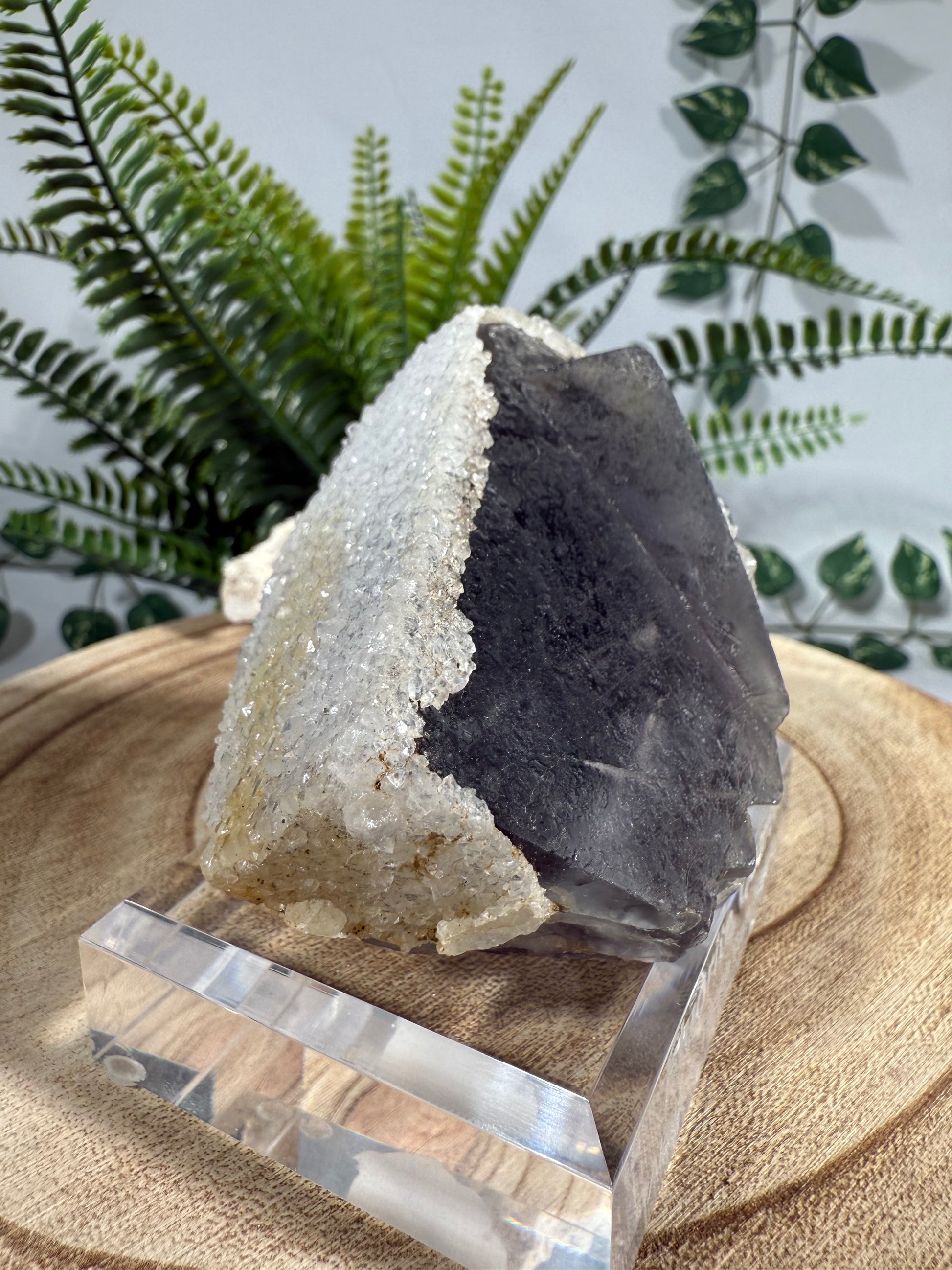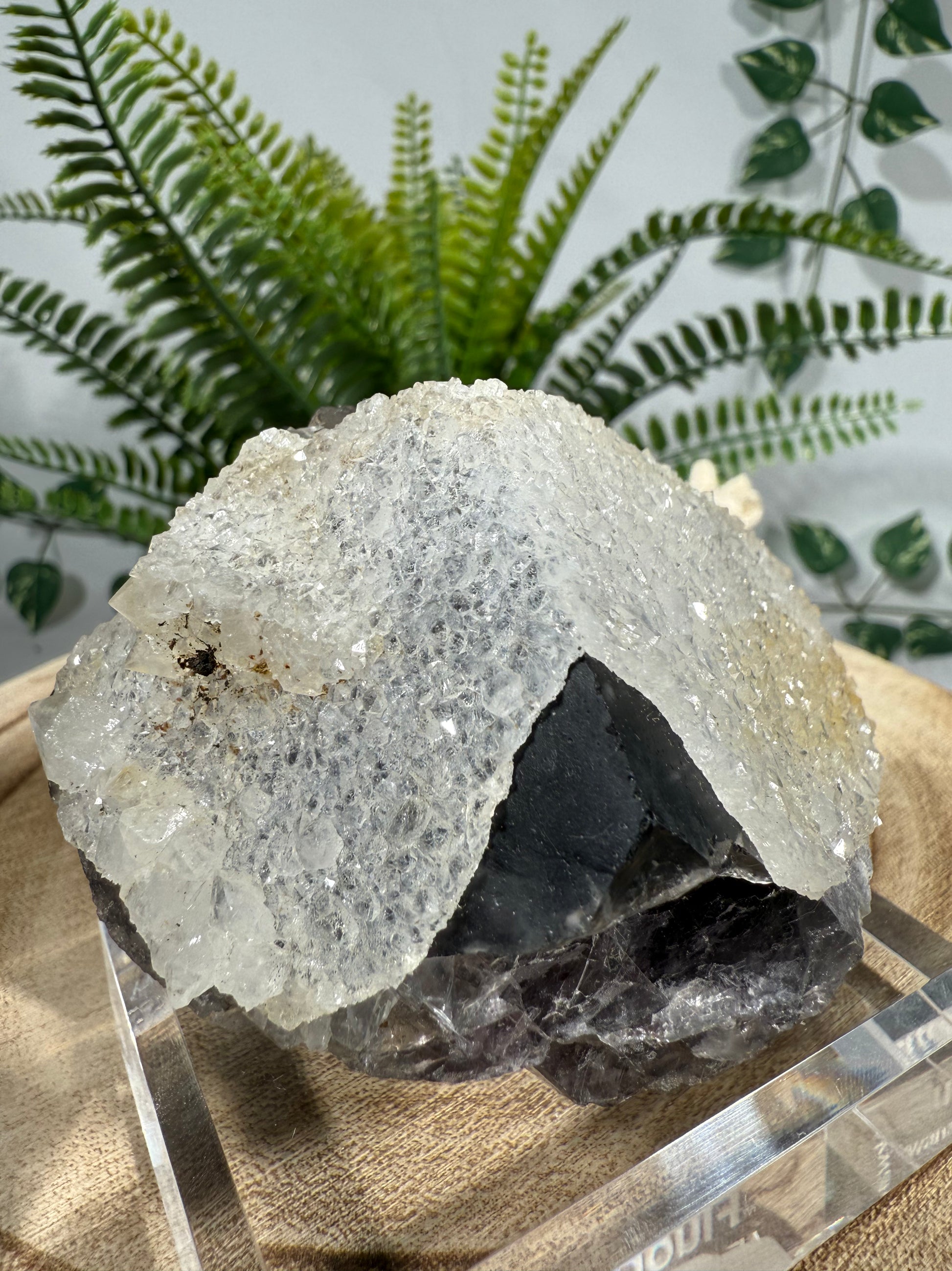 Der Kristall sitzt auf einem Acrylsockel mit Gravur und ist eine sehr schöne Stufe. Der Fluorit ändert seine Farbe zu einem intensiveren Lila im Sonnenlicht.