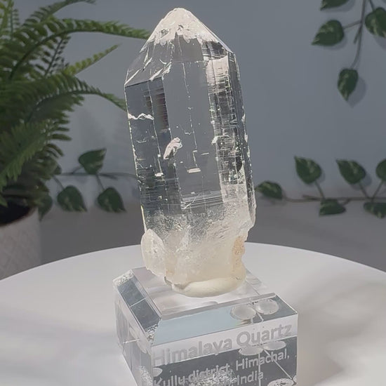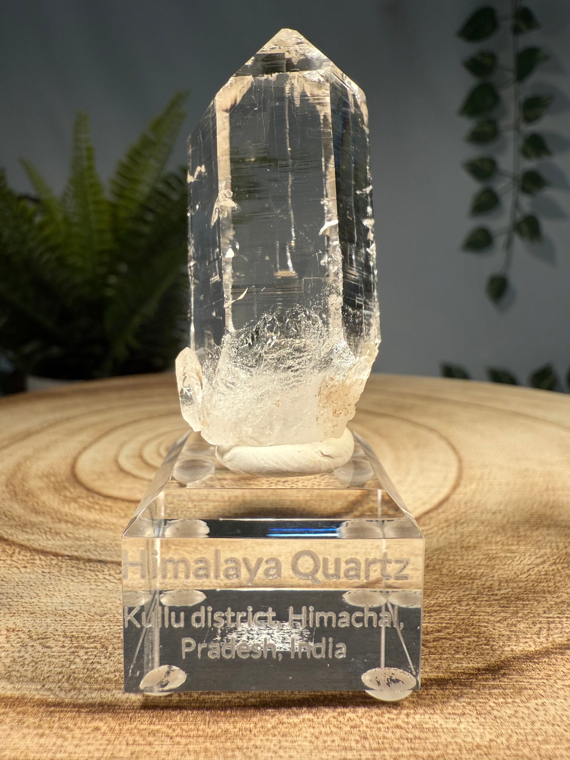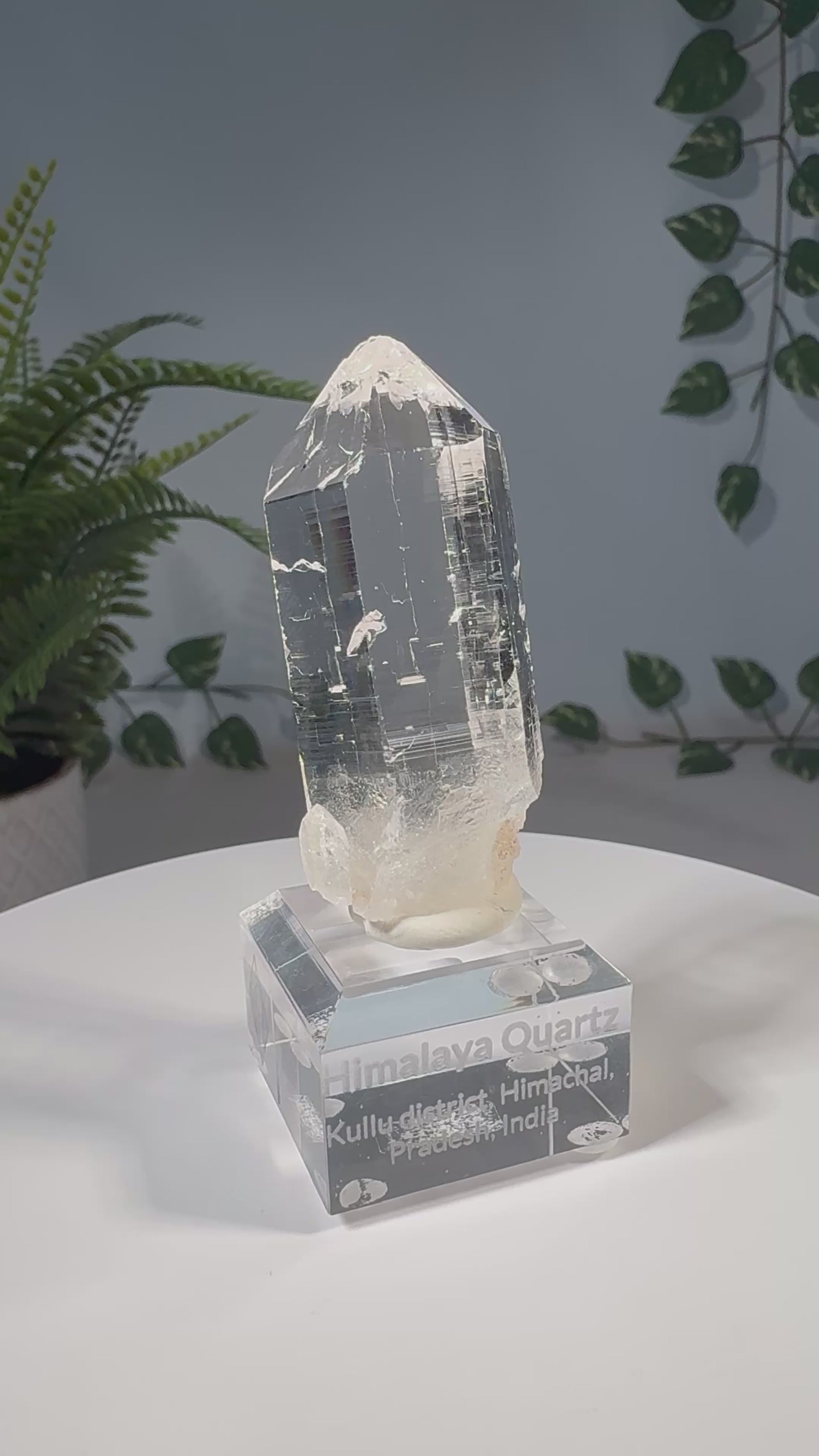 Der Kristall ist sehr klar und hat eine wunderbare Qualität. Die Spitze des Kristalls ist beschädigt, was durch die Einschlüsse in der Spitze nicht so sehr auffällt. Die Spitze sitzt auf einem gravierten Sockel.