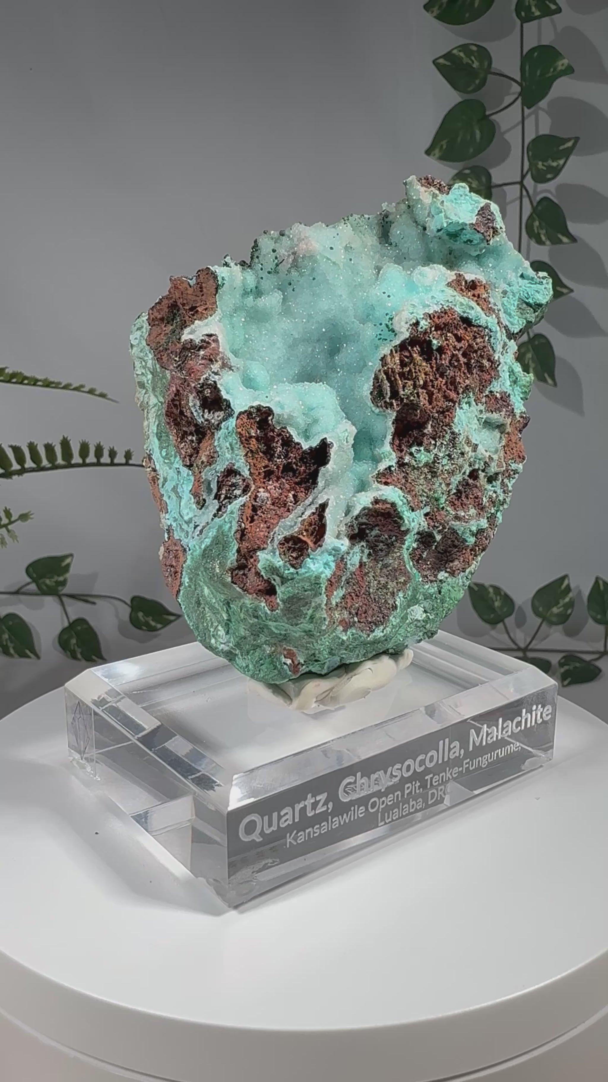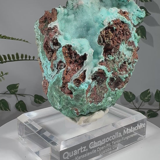 Quarz nach Chrysokoll nach Malachit von Kansalawile Open Pit, Tenke-Fungurume, Lualaba, Demokratische Republik Kongo.
