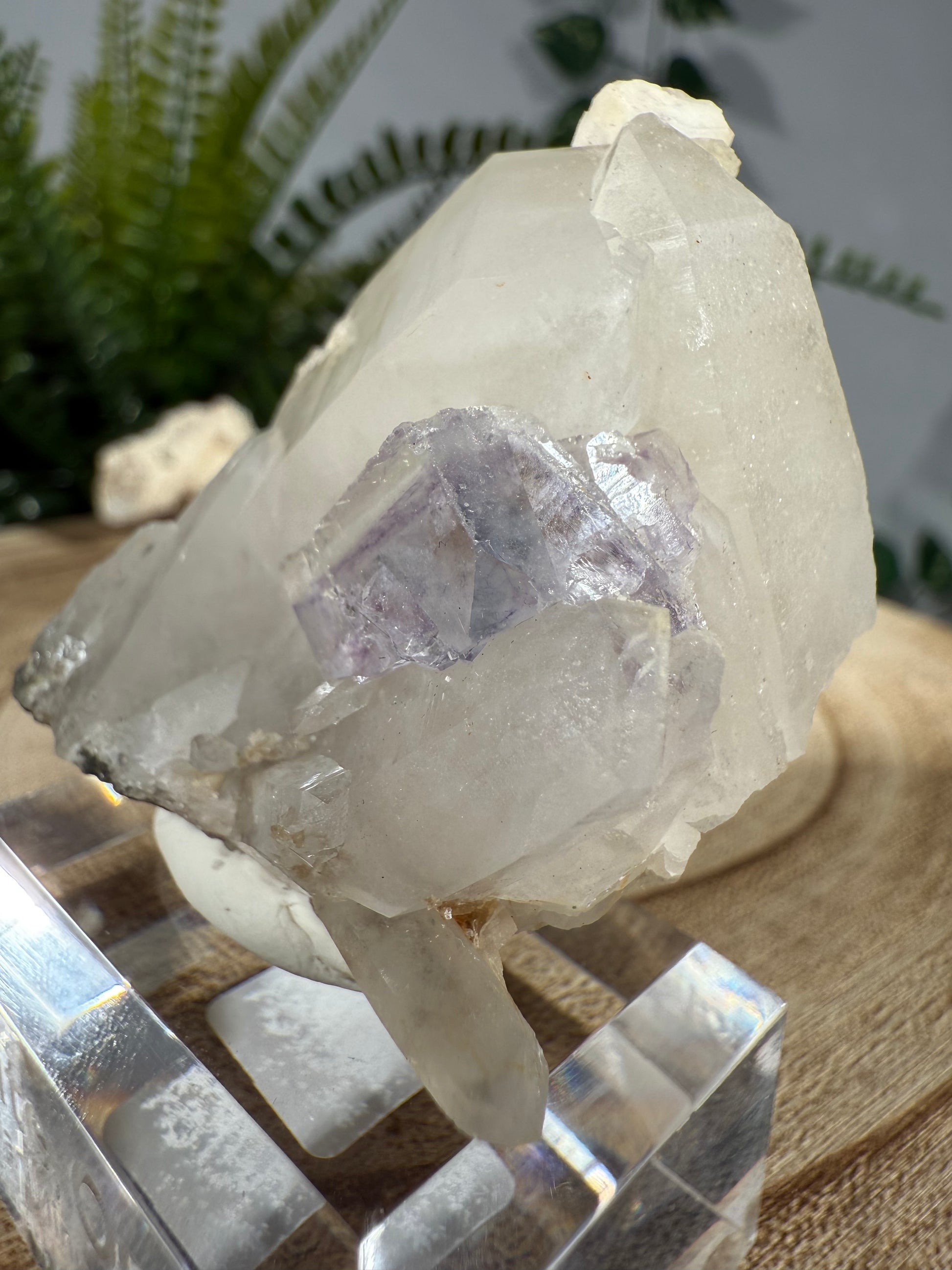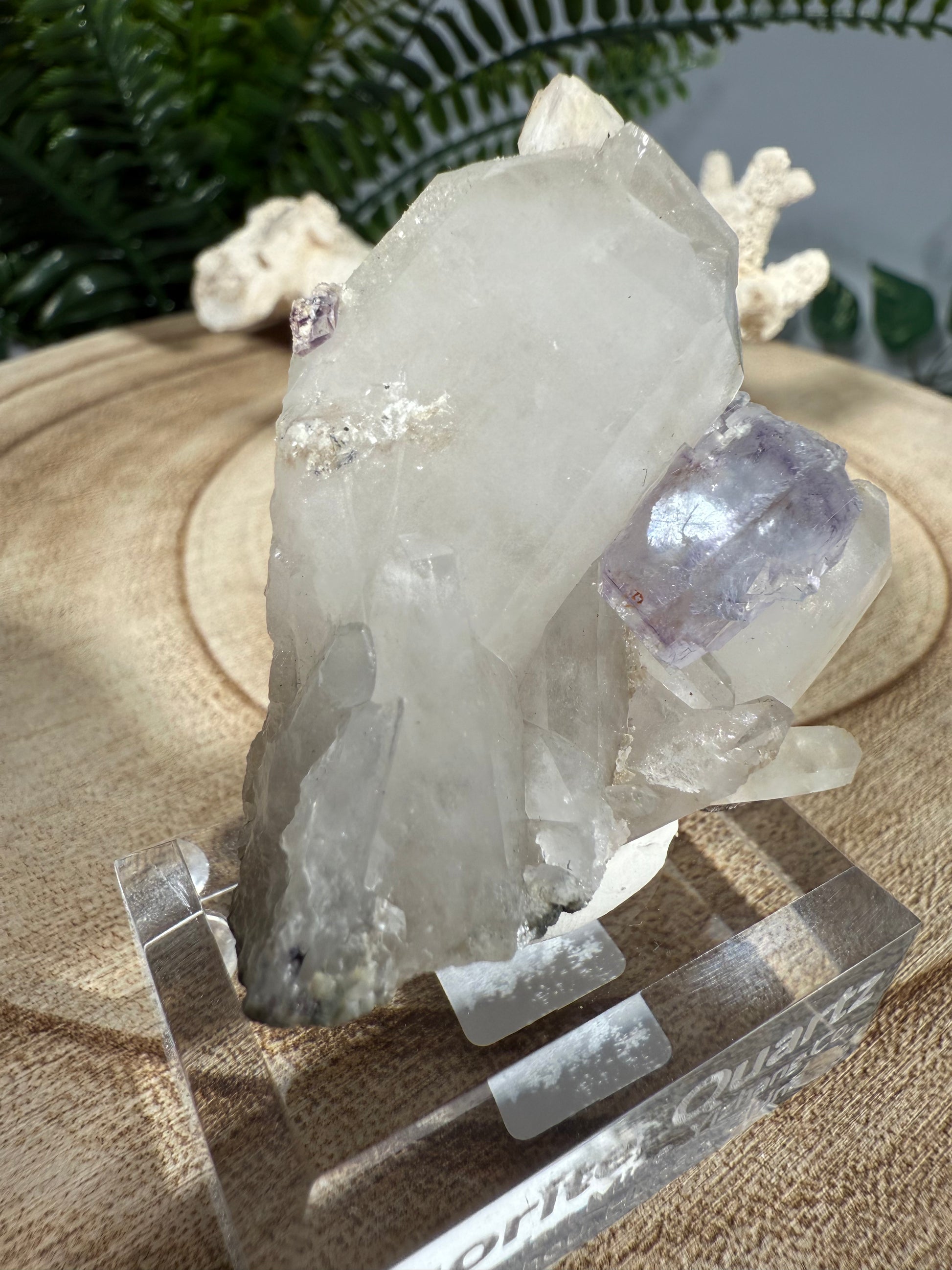 Der Fluorit sitzt auf einem Acrylsockel mit Gravur und ist eine sehr schöne Stufe.