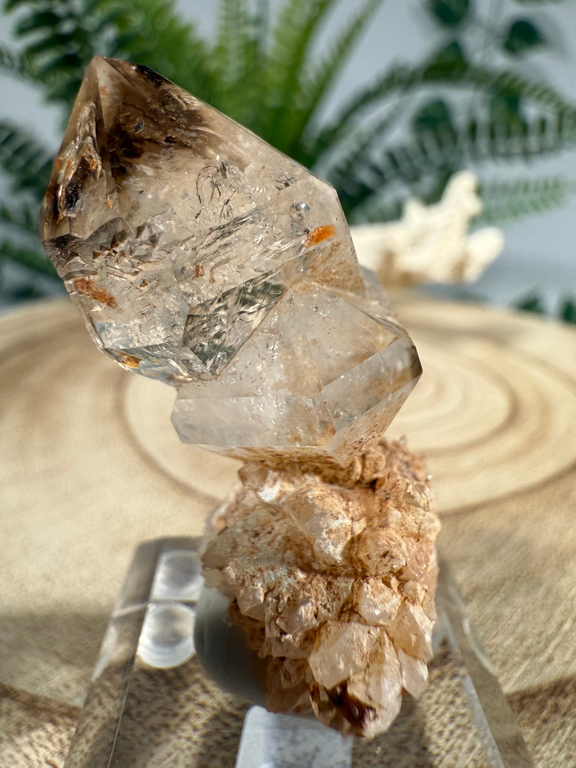 Der Kristall sitzt auf einem Acrylsockel mit Gravur und ist eine sehr schöne Stufe.
