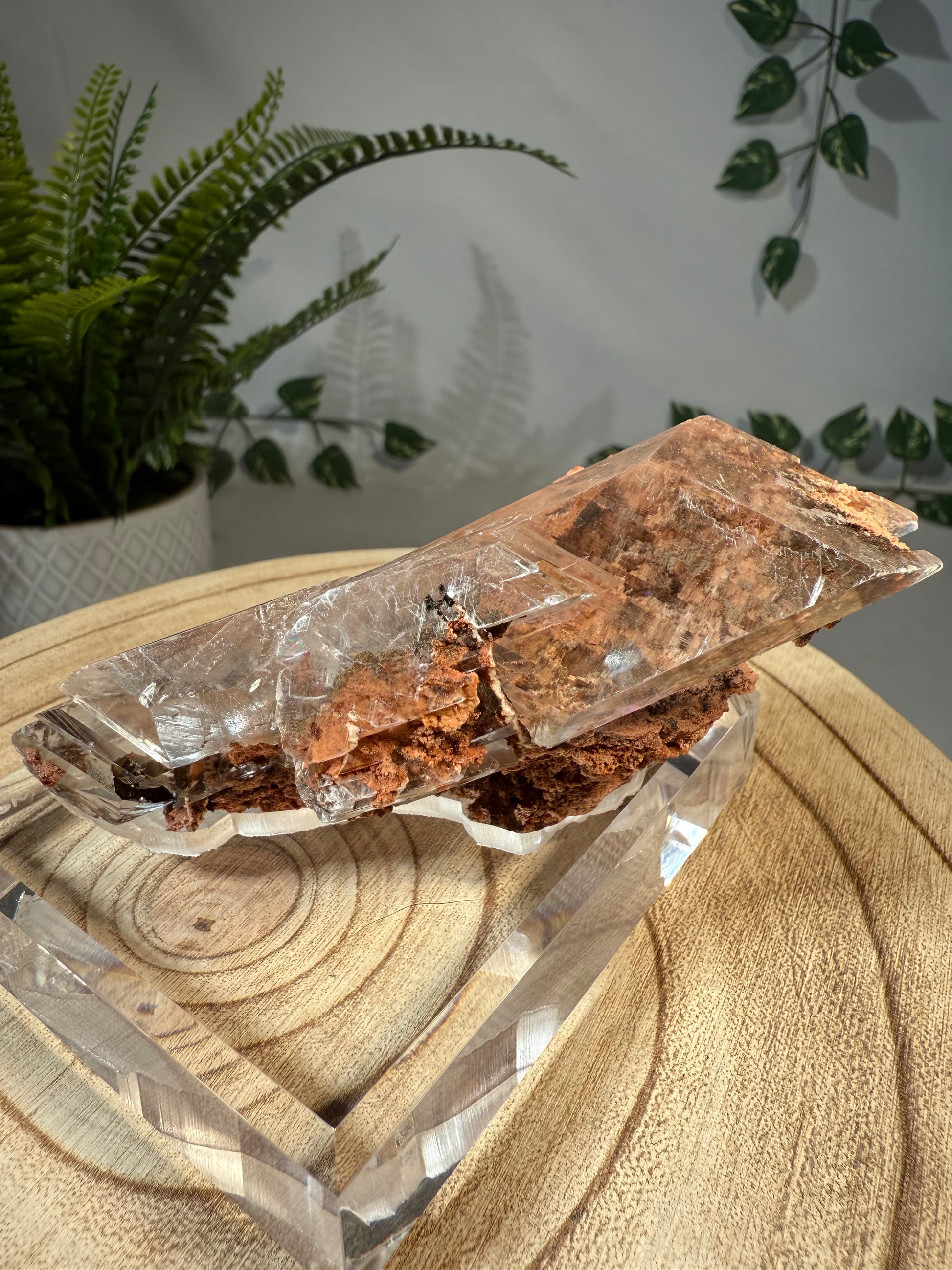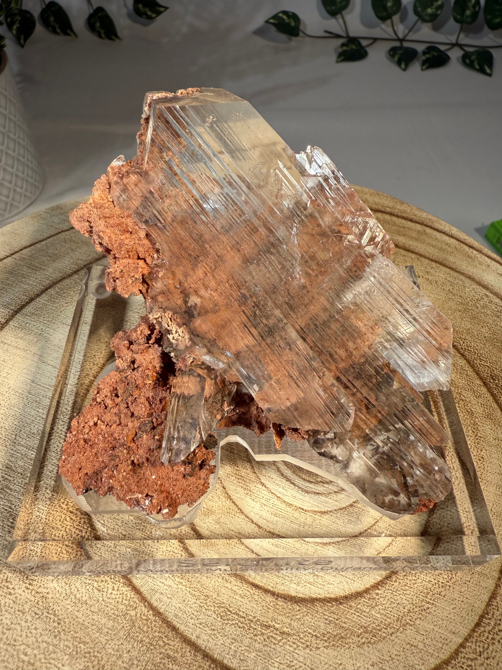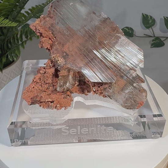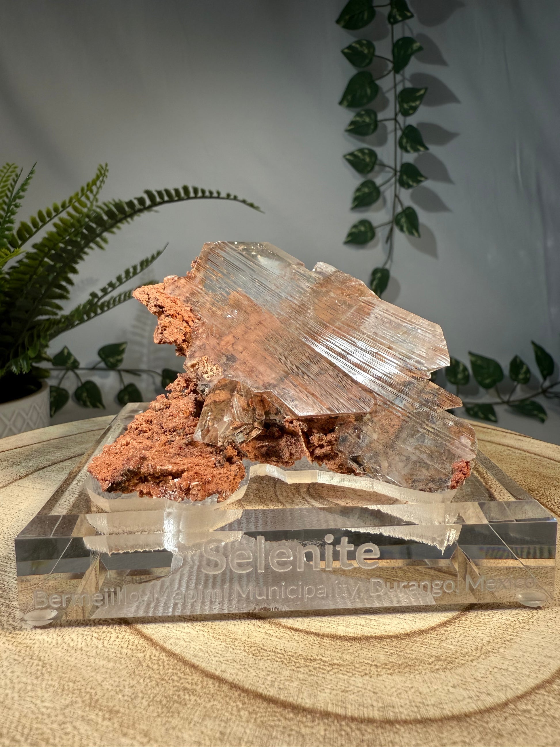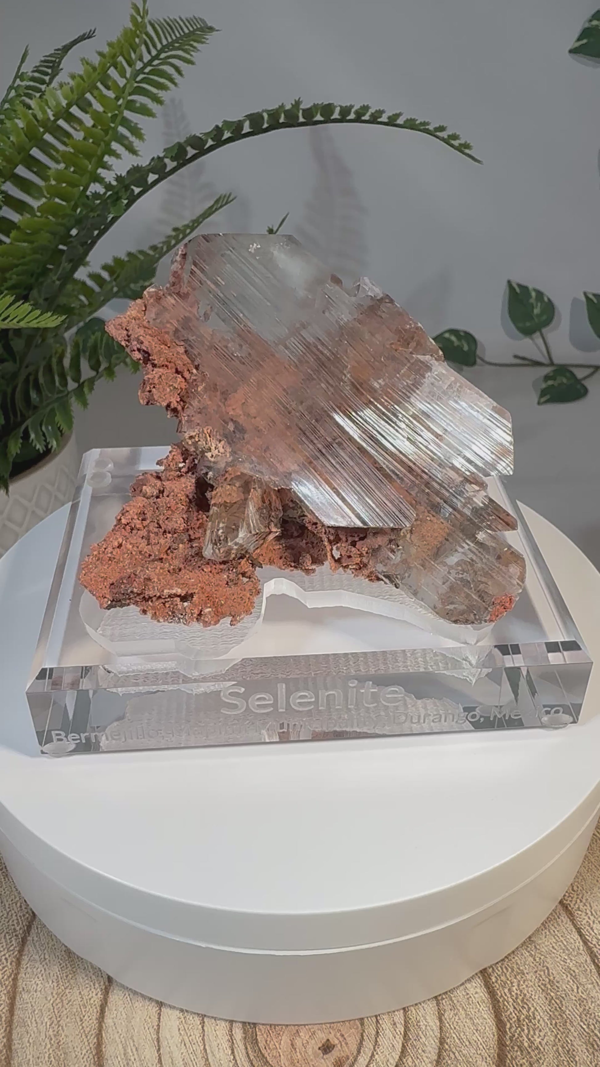 Der Selenit ist schön transparent wodurch die Inklusionen gut erkennbar sind. Ein Custom Acrylsockel mit Gravur ist im Preis mit inbegriffen. Ein Statement für jede Sammlung.