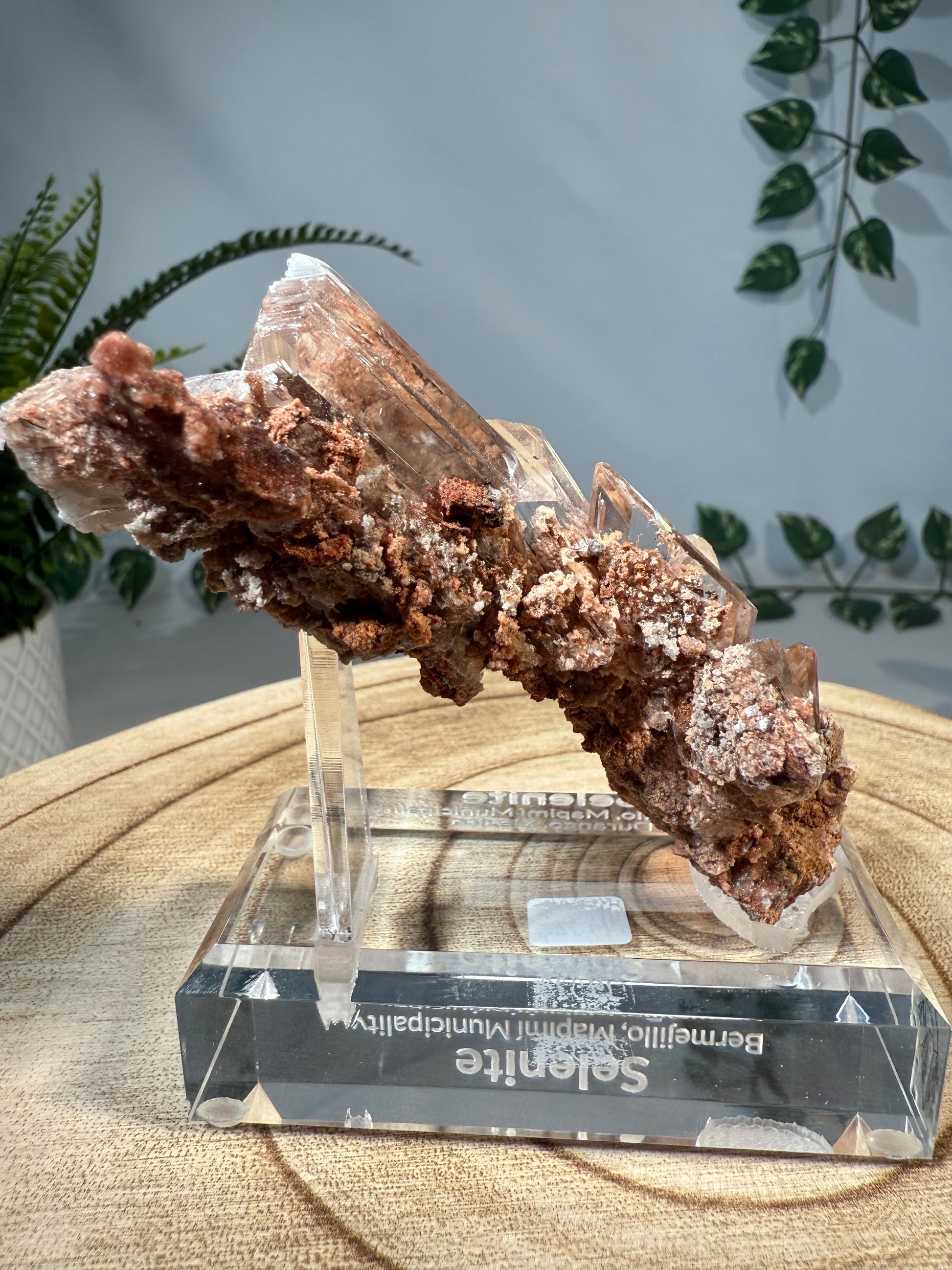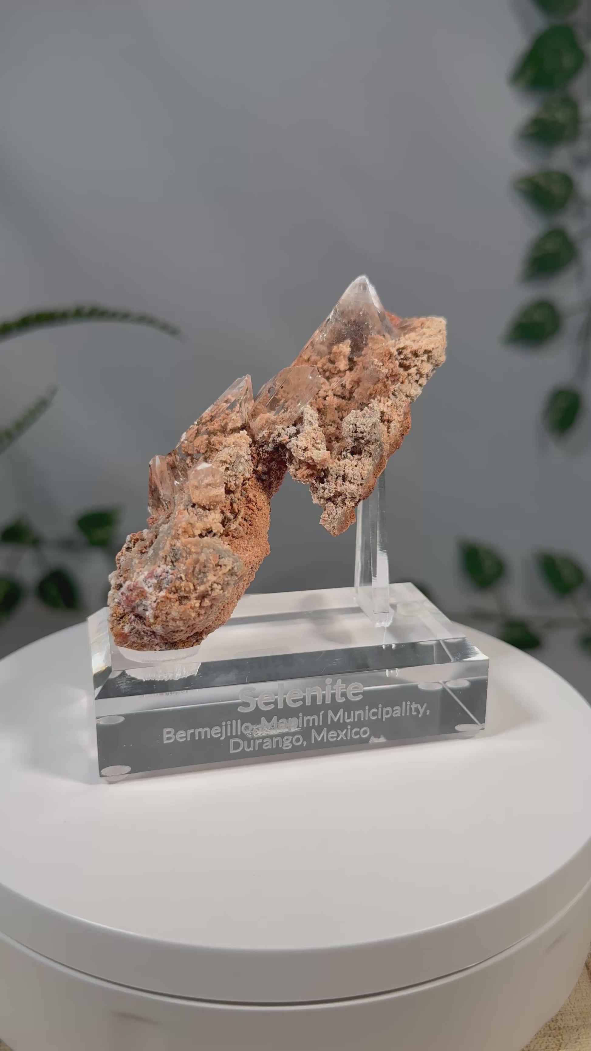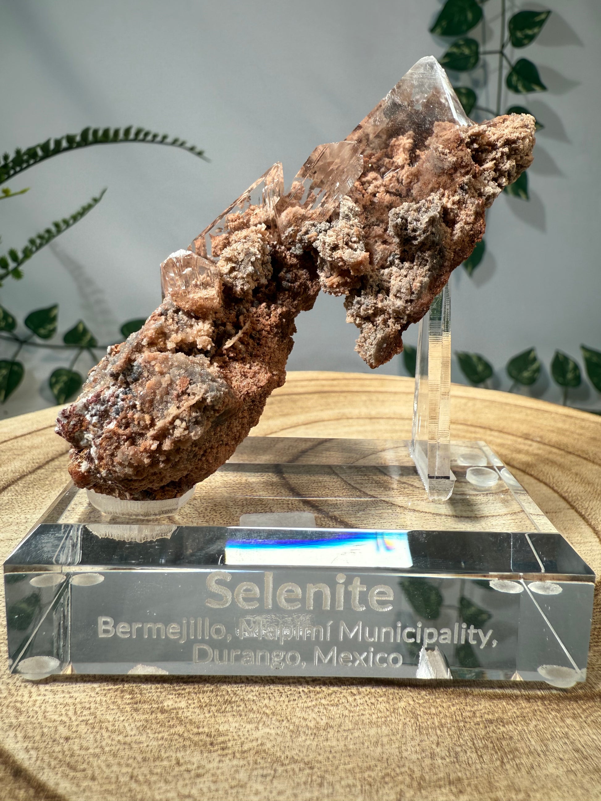 Der Selenit ist schön transparent wodurch die Inklusionen gut erkennbar sind. Ein Custom Acrylsockel mit Gravur ist im Preis mit inbegriffen. Ein Statement für jede Sammlung.