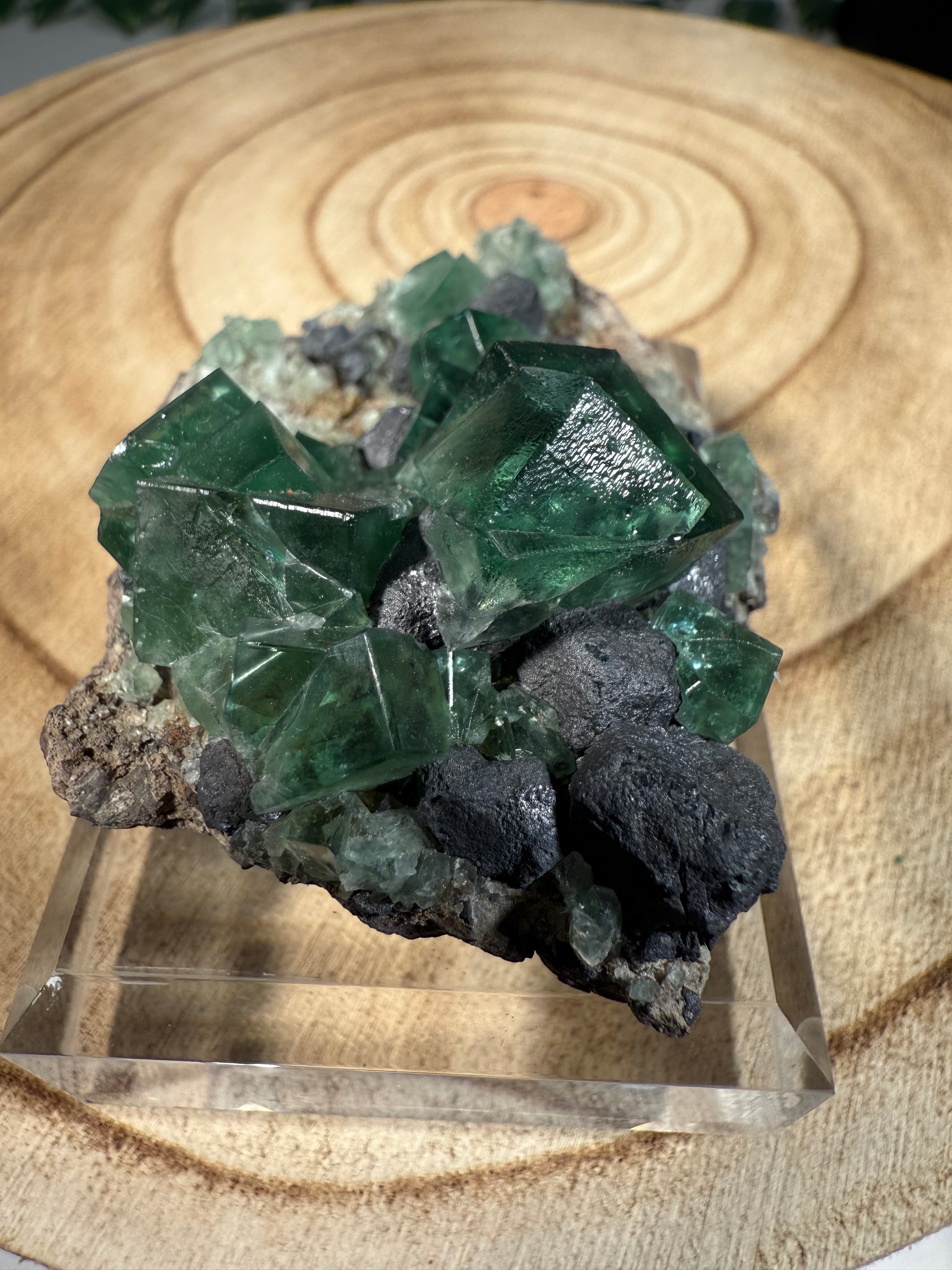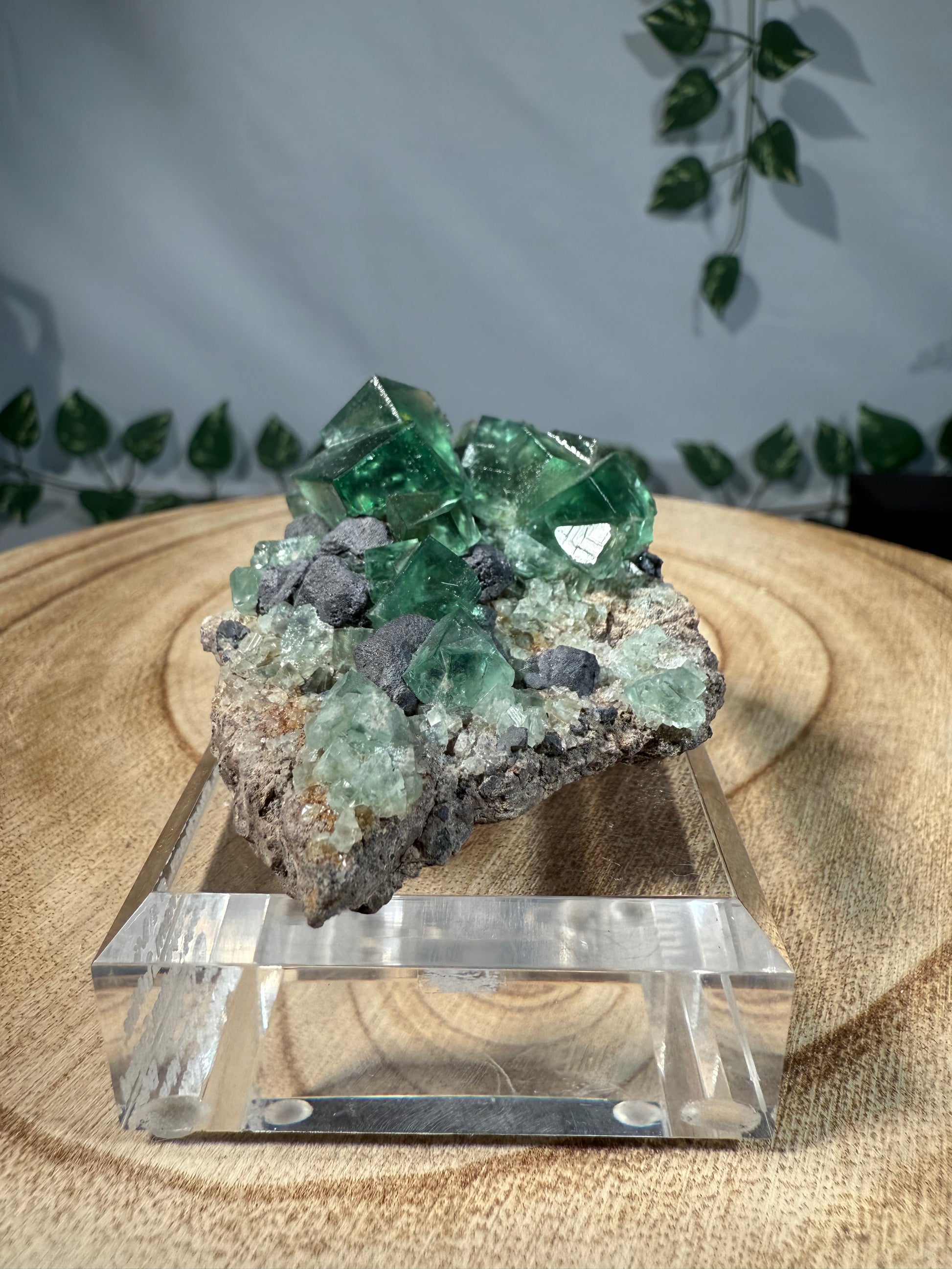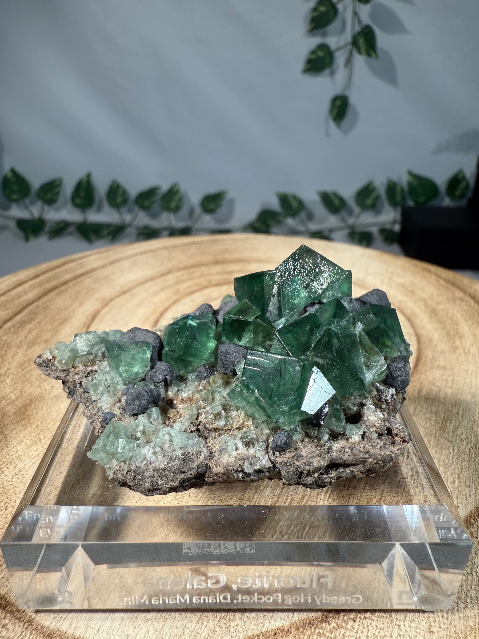 Die Kristalle sind sehr klar und haben eine wunderschöne Farbe. Die Stufe sitzt auf einem gravierten Acrylsockel.