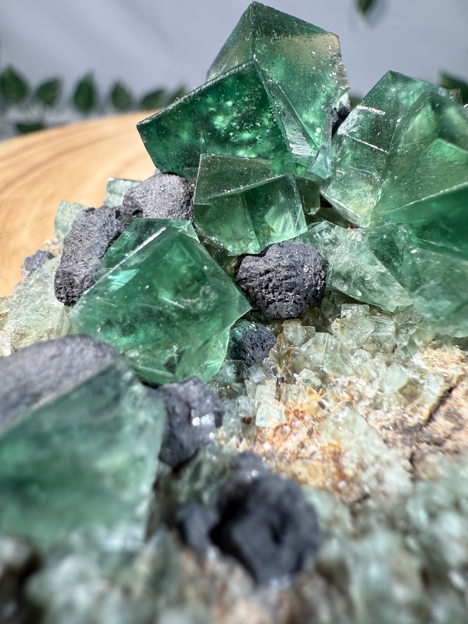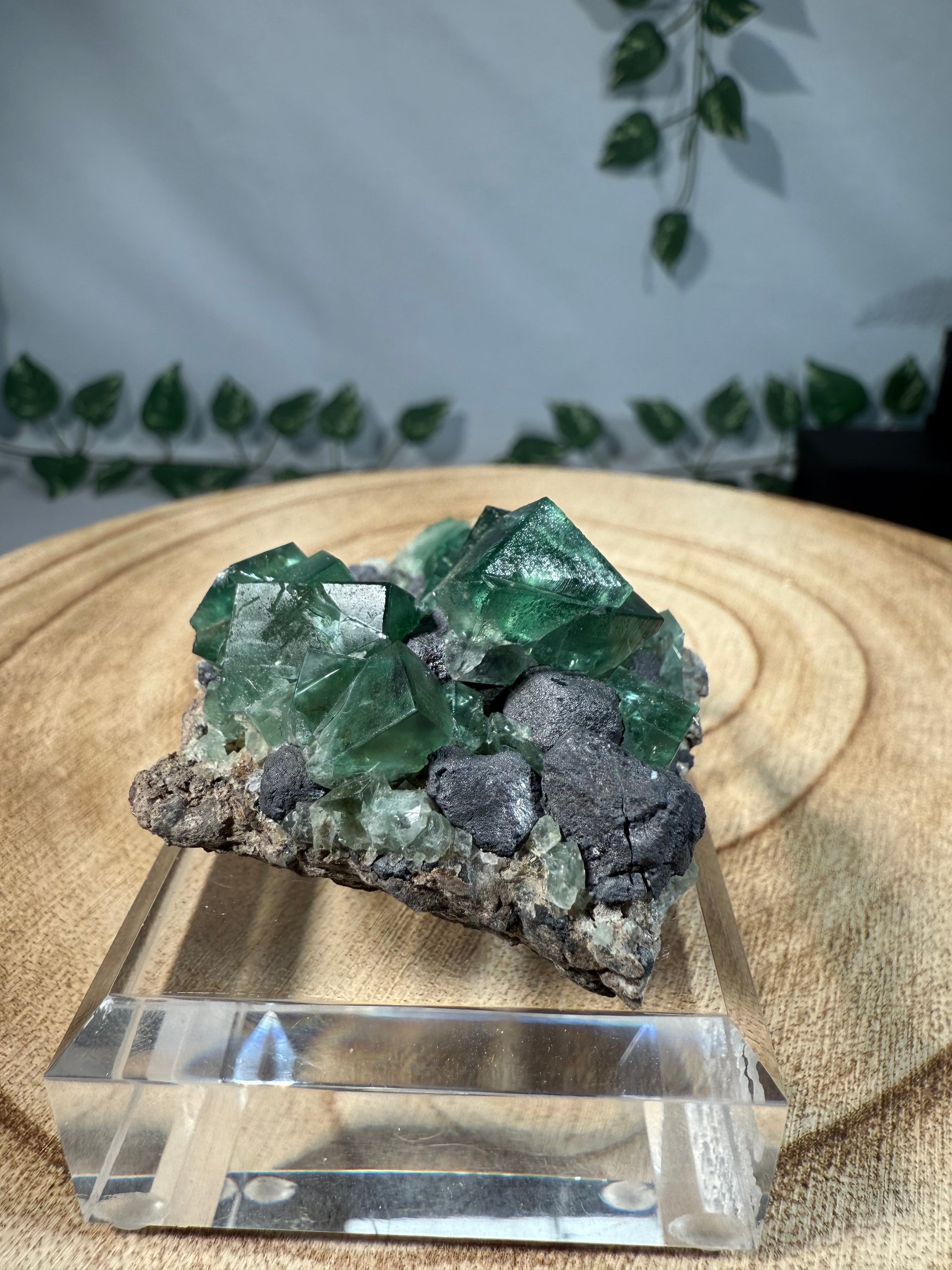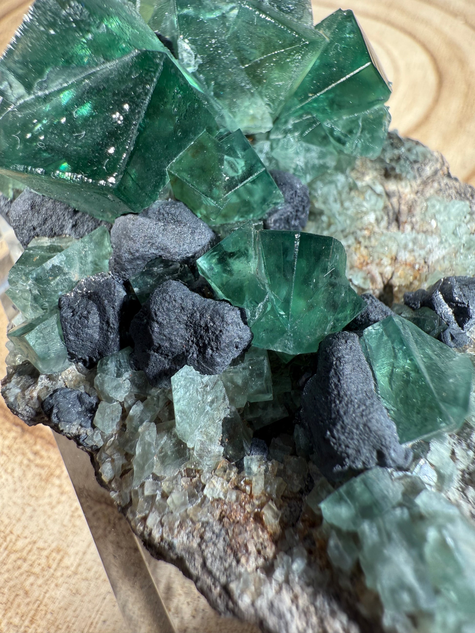Die Kristalle sind sehr klar und haben eine wunderschöne Farbe. Die Stufe sitzt auf einem gravierten Acrylsockel.