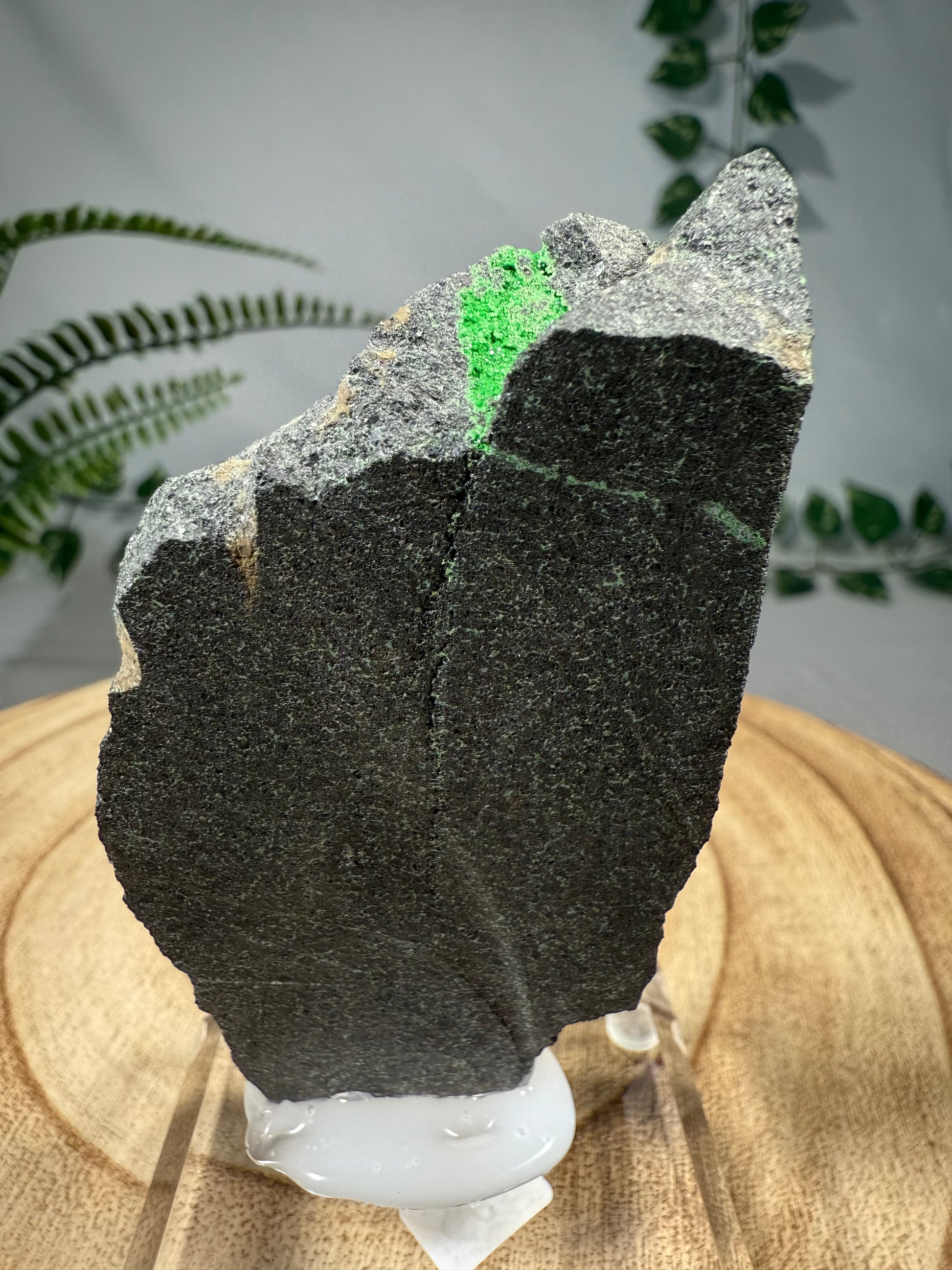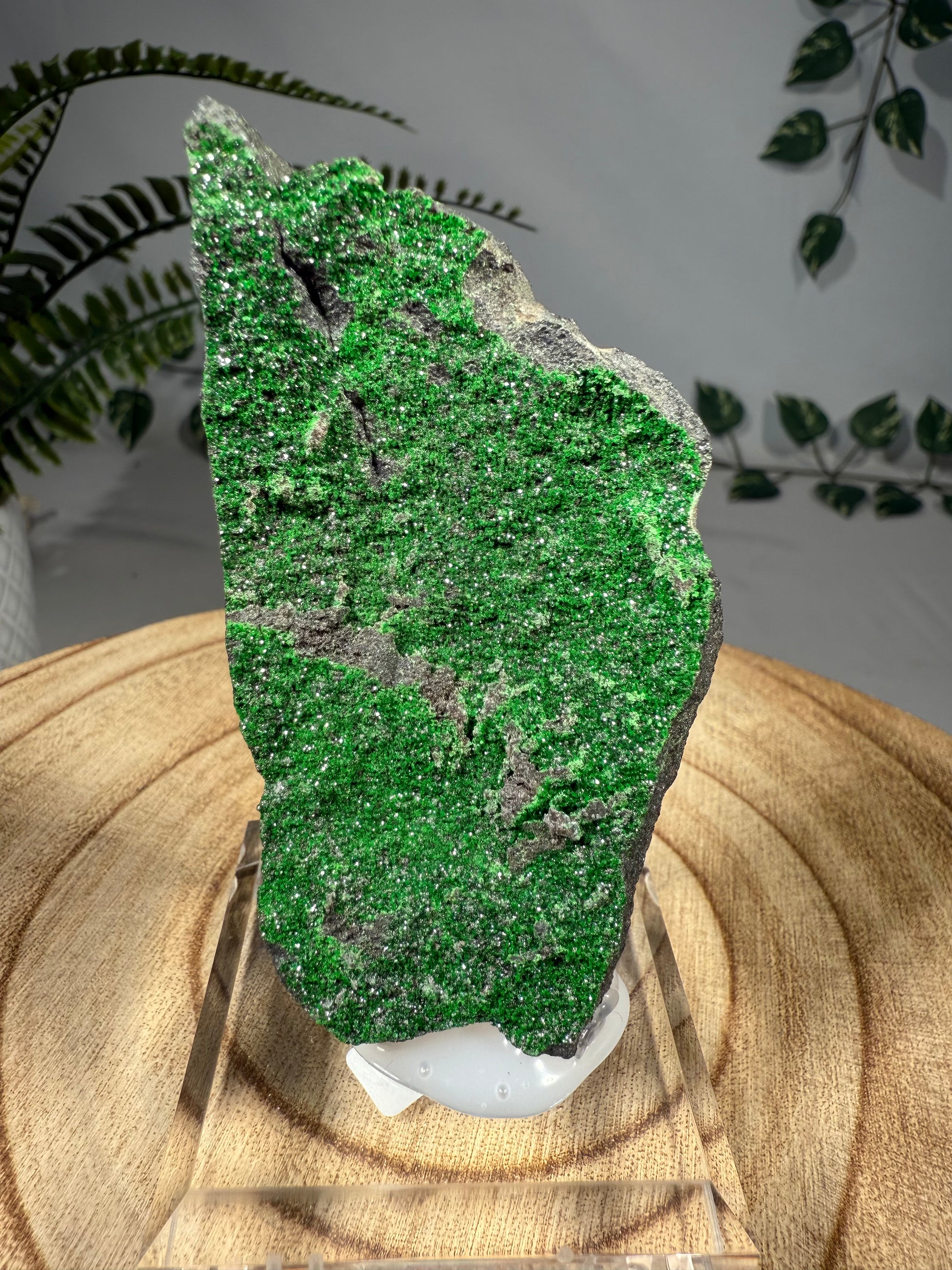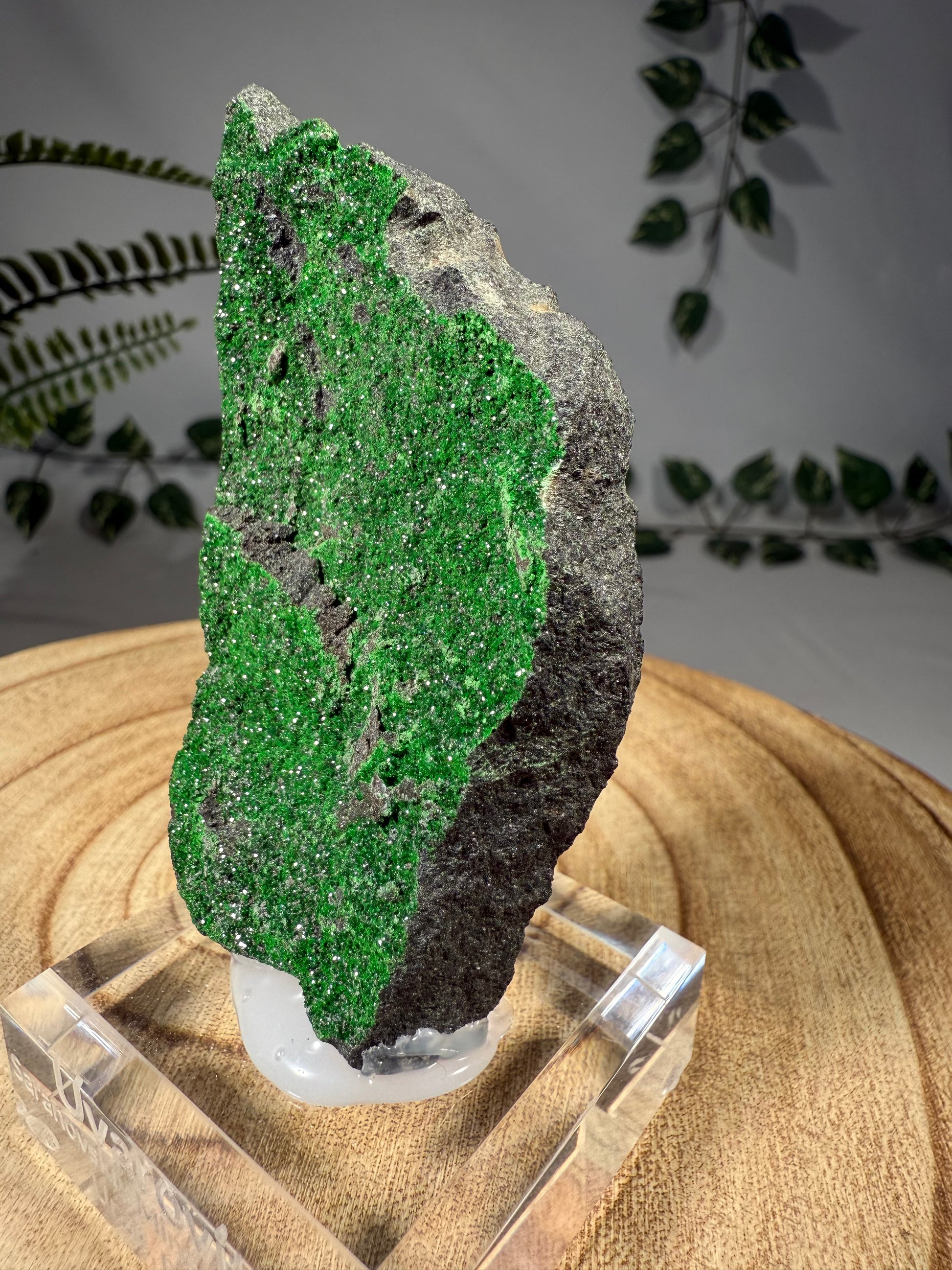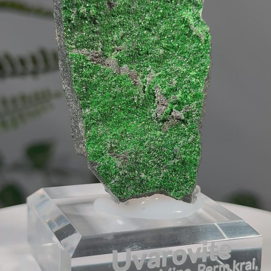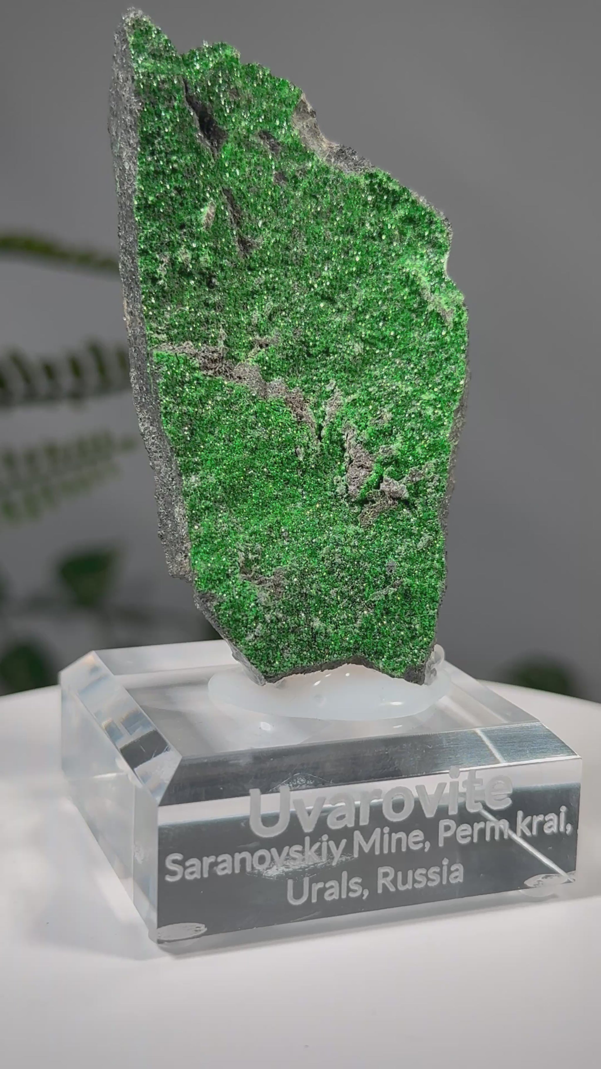 Der Uwarowit sitzt auf einem Acrylsockel mit Gravur. Ein wunderschönes Stück.
