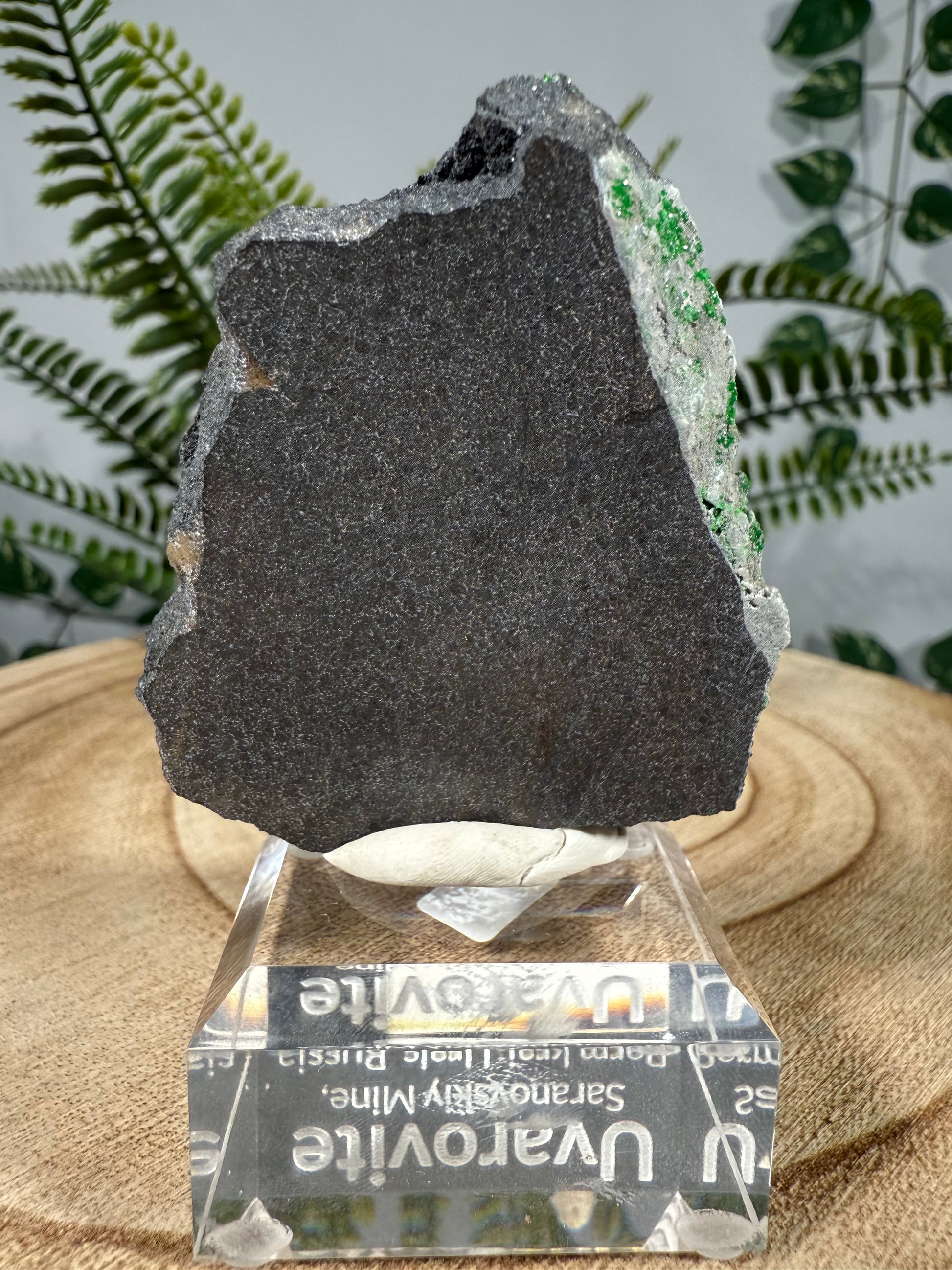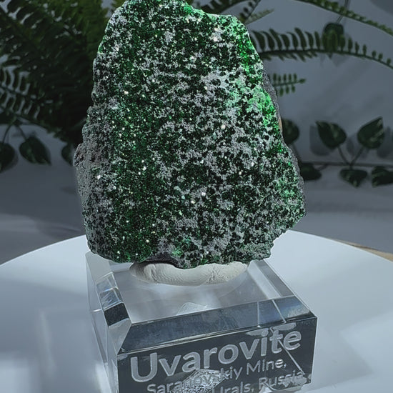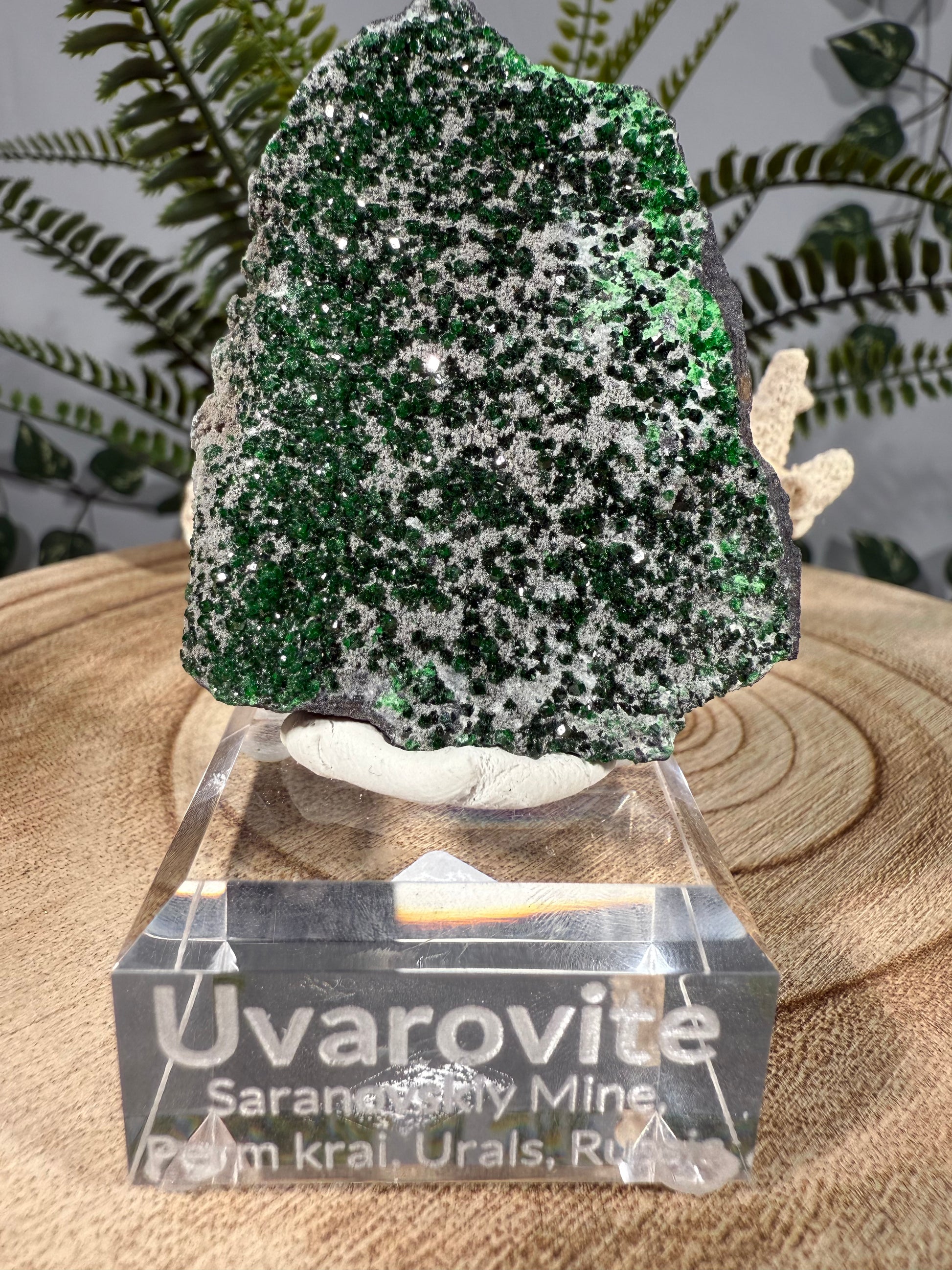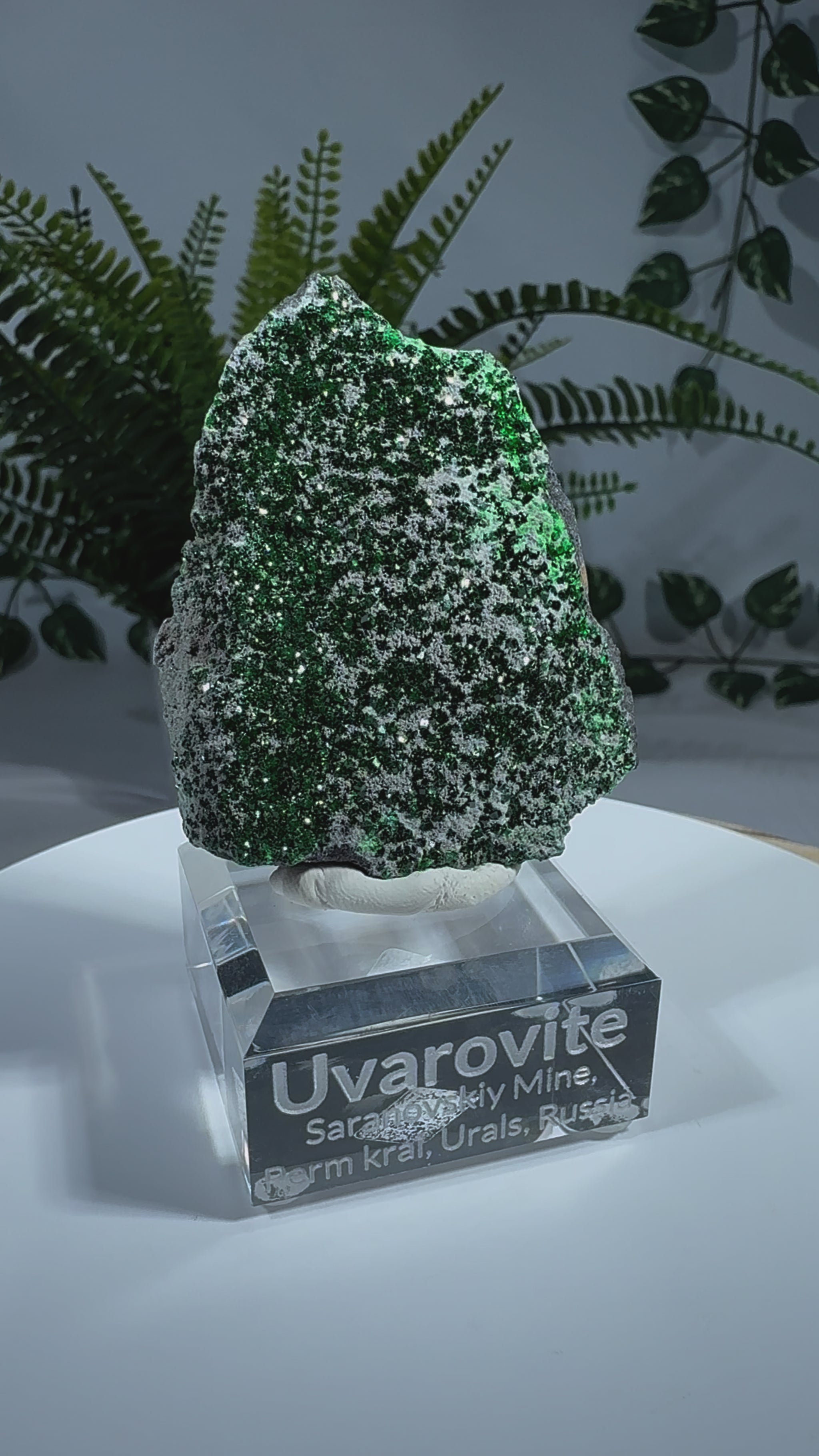 Der Uwarowit sitzt auf einem Acrylsockel mit Gravur. Ein wunderschönes Stück.