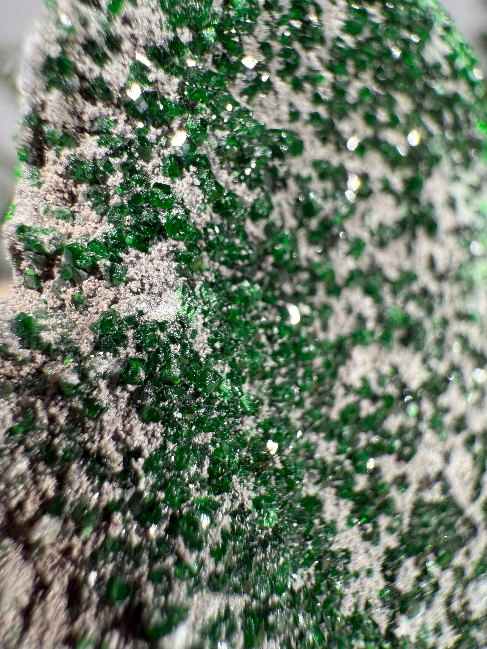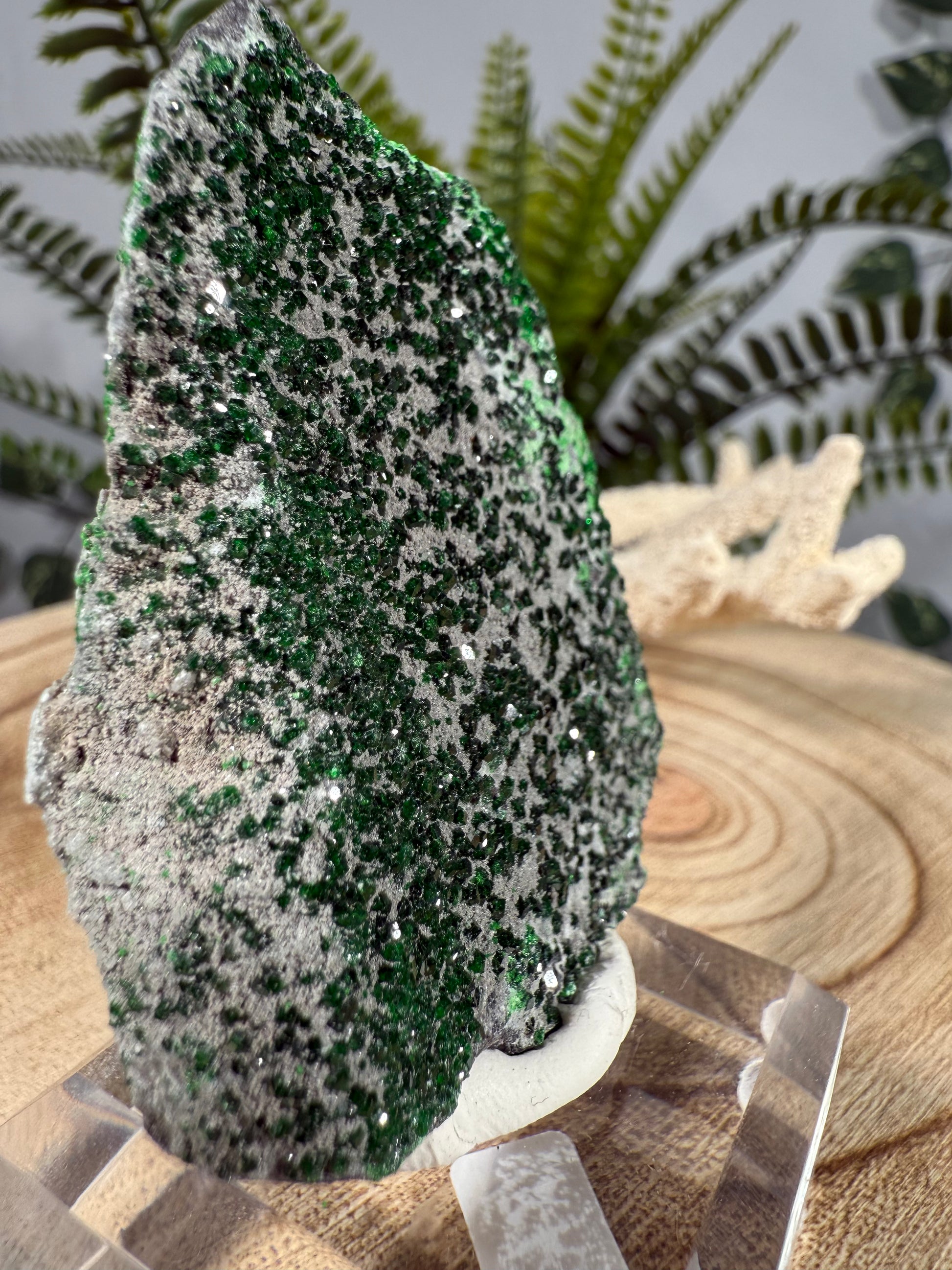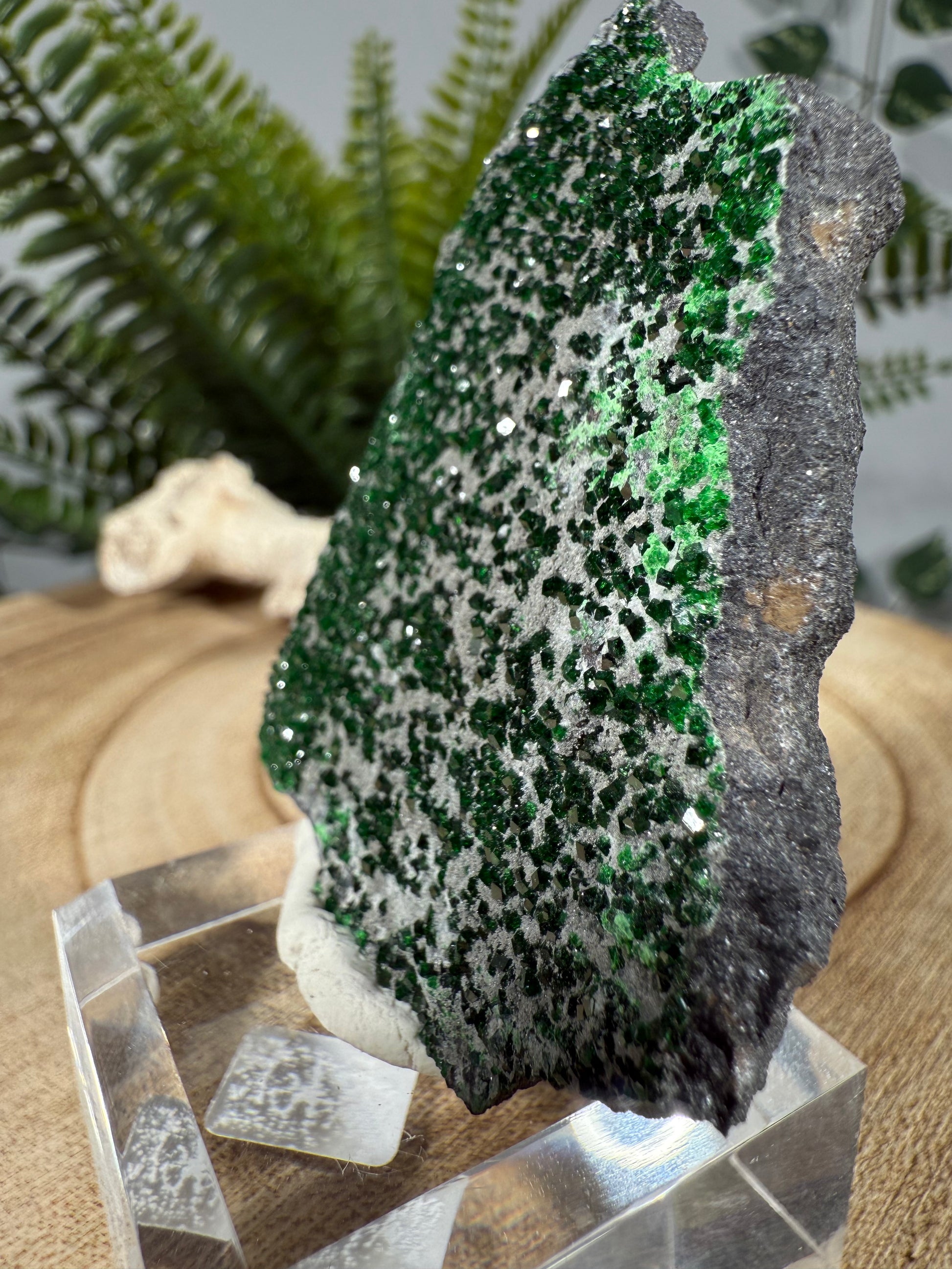 Der Uwarowit sitzt auf einem Acrylsockel mit Gravur. Ein wunderschönes Stück.